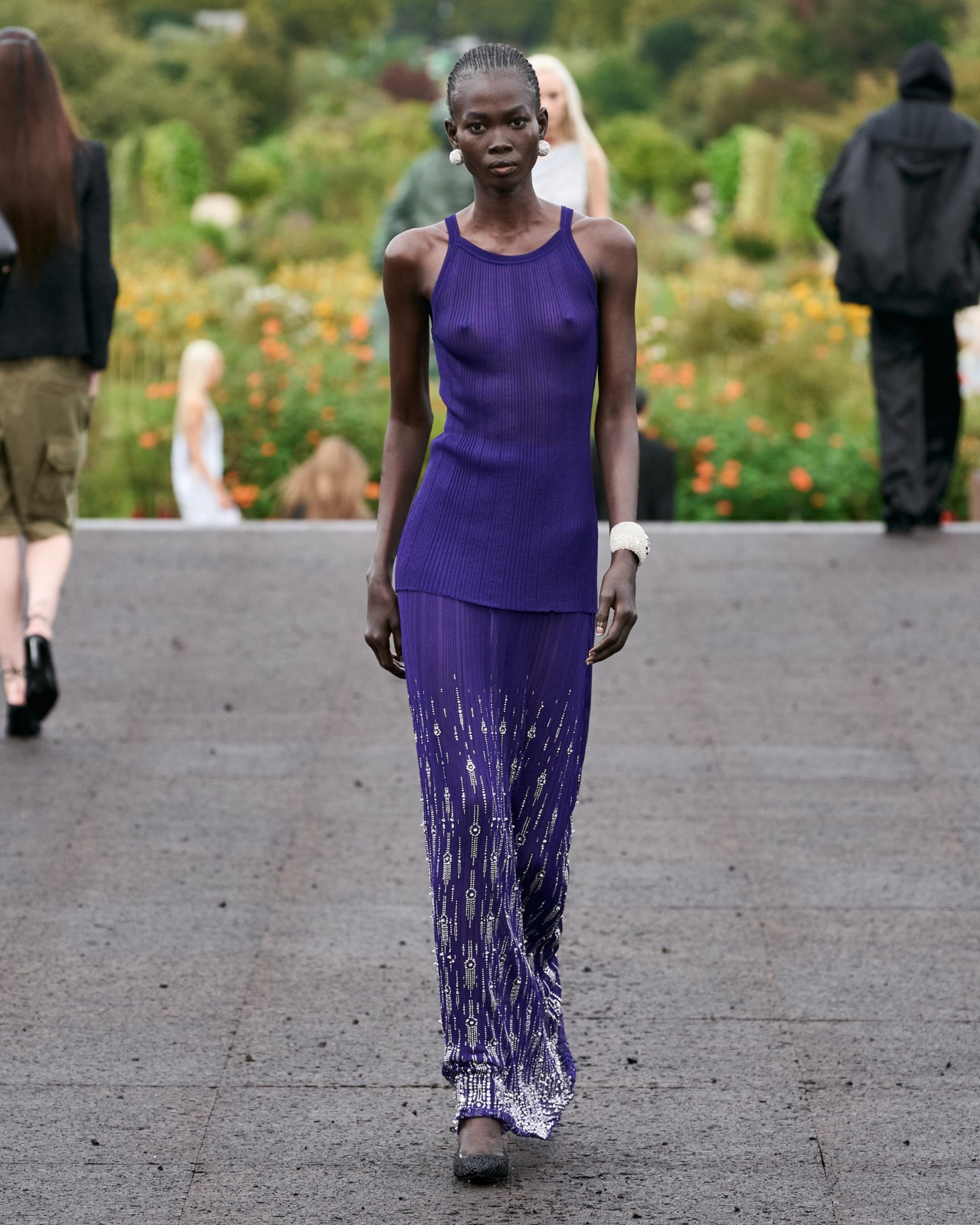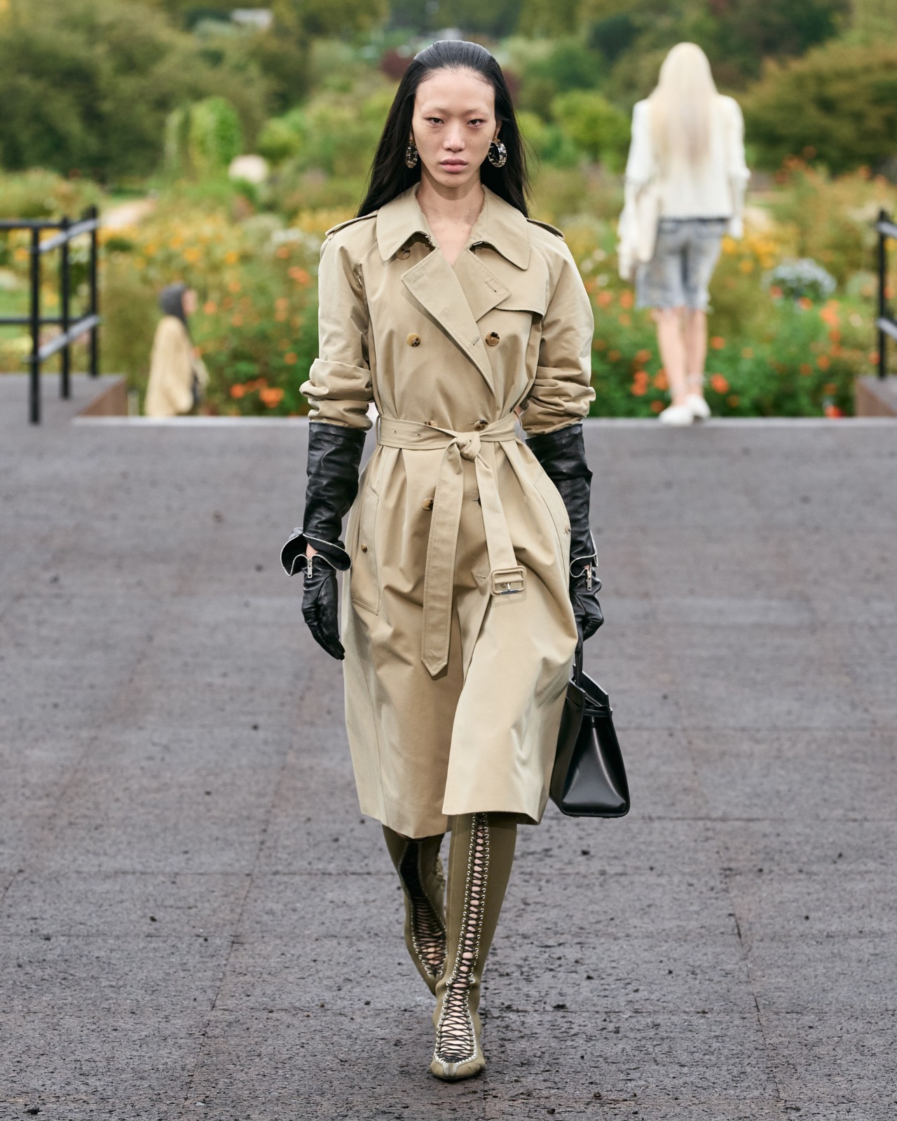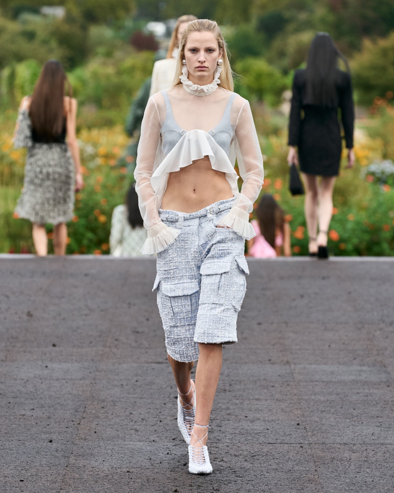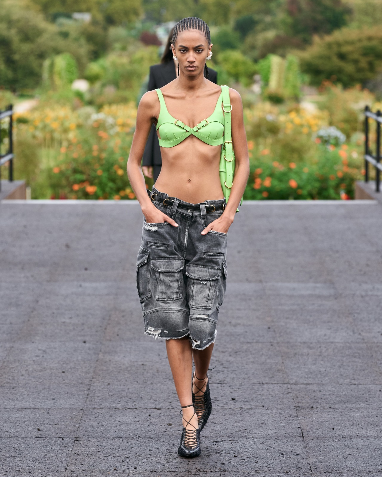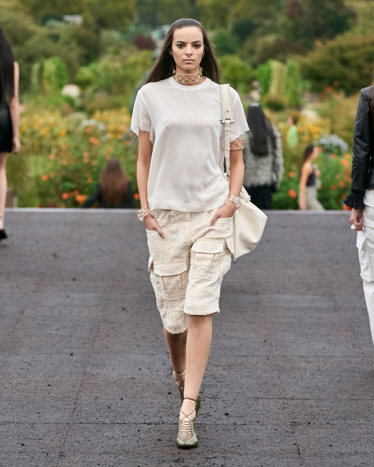 テーマは、コスモポリタンなドレスコードの「異文化交流」。かつてメゾンの創設者ユベール・ド・ジバンシィ(Hubert de Givenchy)がアメリカ映画界に貢献をしたのと同じように、パリとロサンゼルスが発信する異なるスタイルの融合を試みた。モデルたちは、フェミニンなフリルトップスにカットオフのローライズデニムを合わせて登場。また、ツイードで仕立てたカーゴパンツといった、一着で異文化の融合を感じさせるアイテムも。