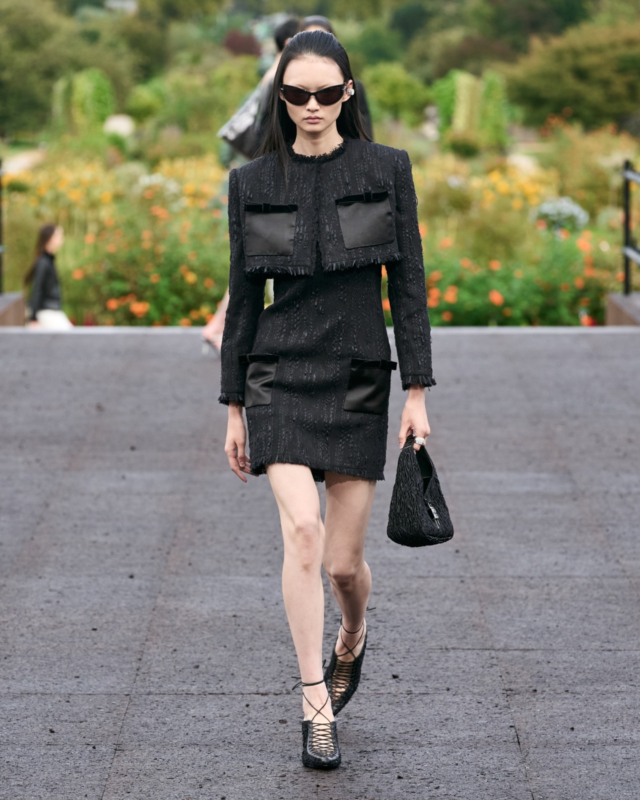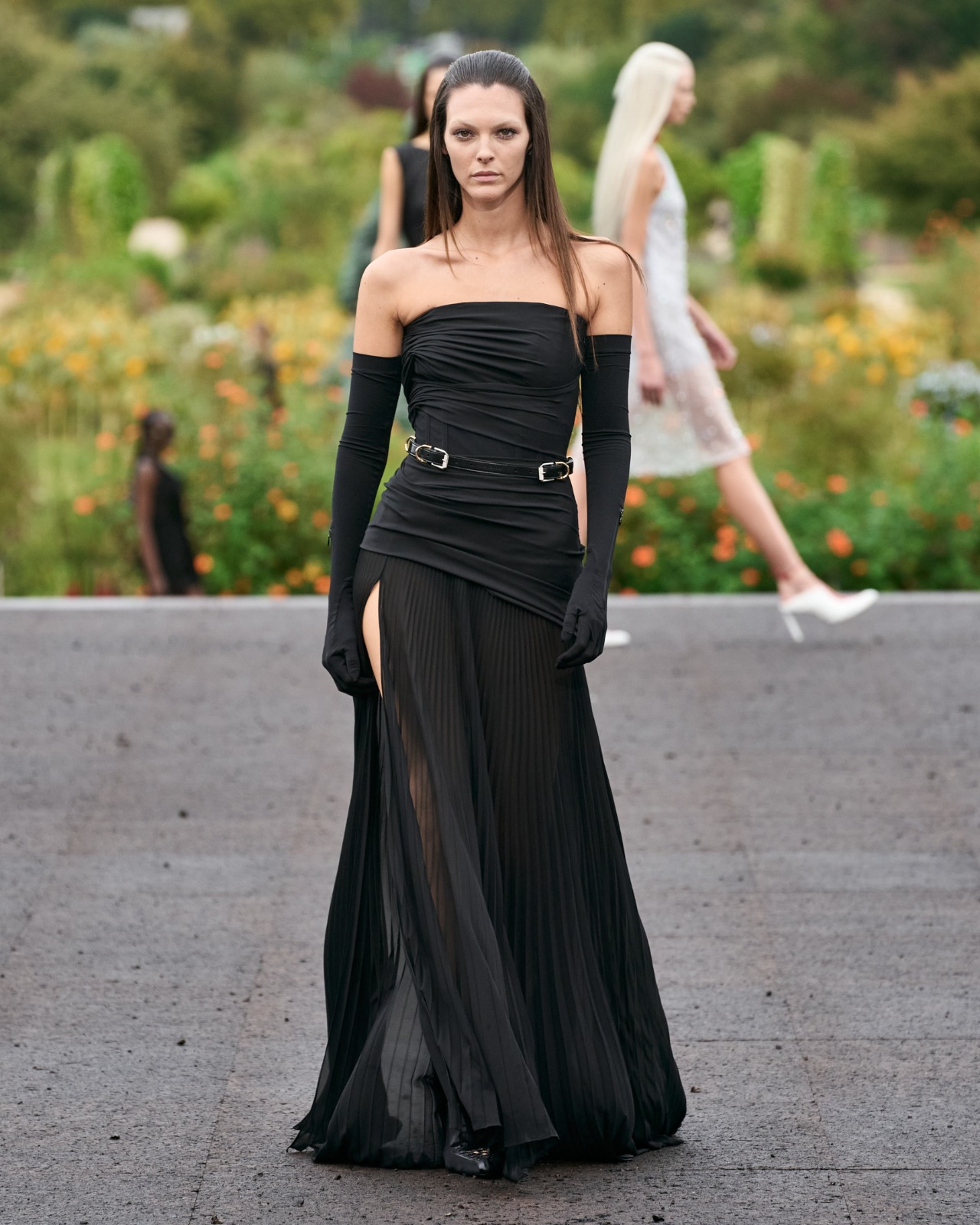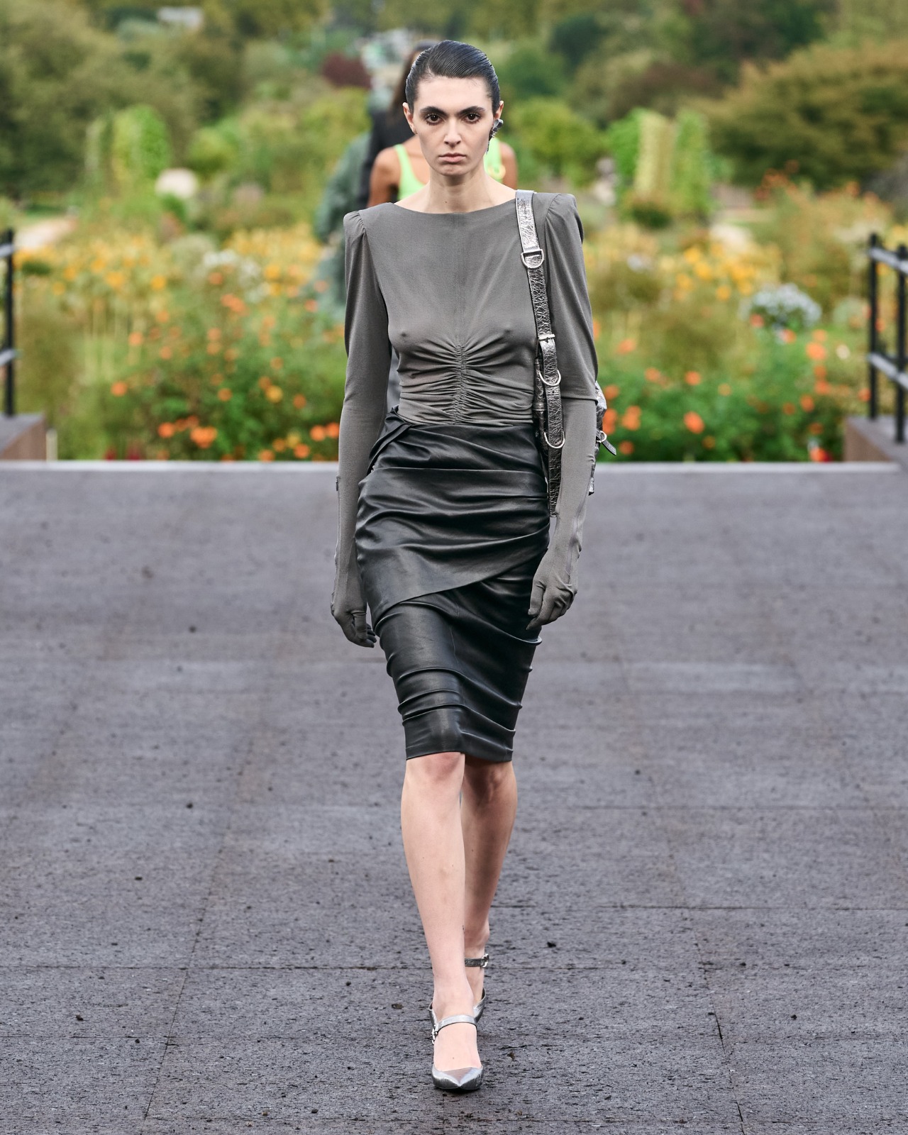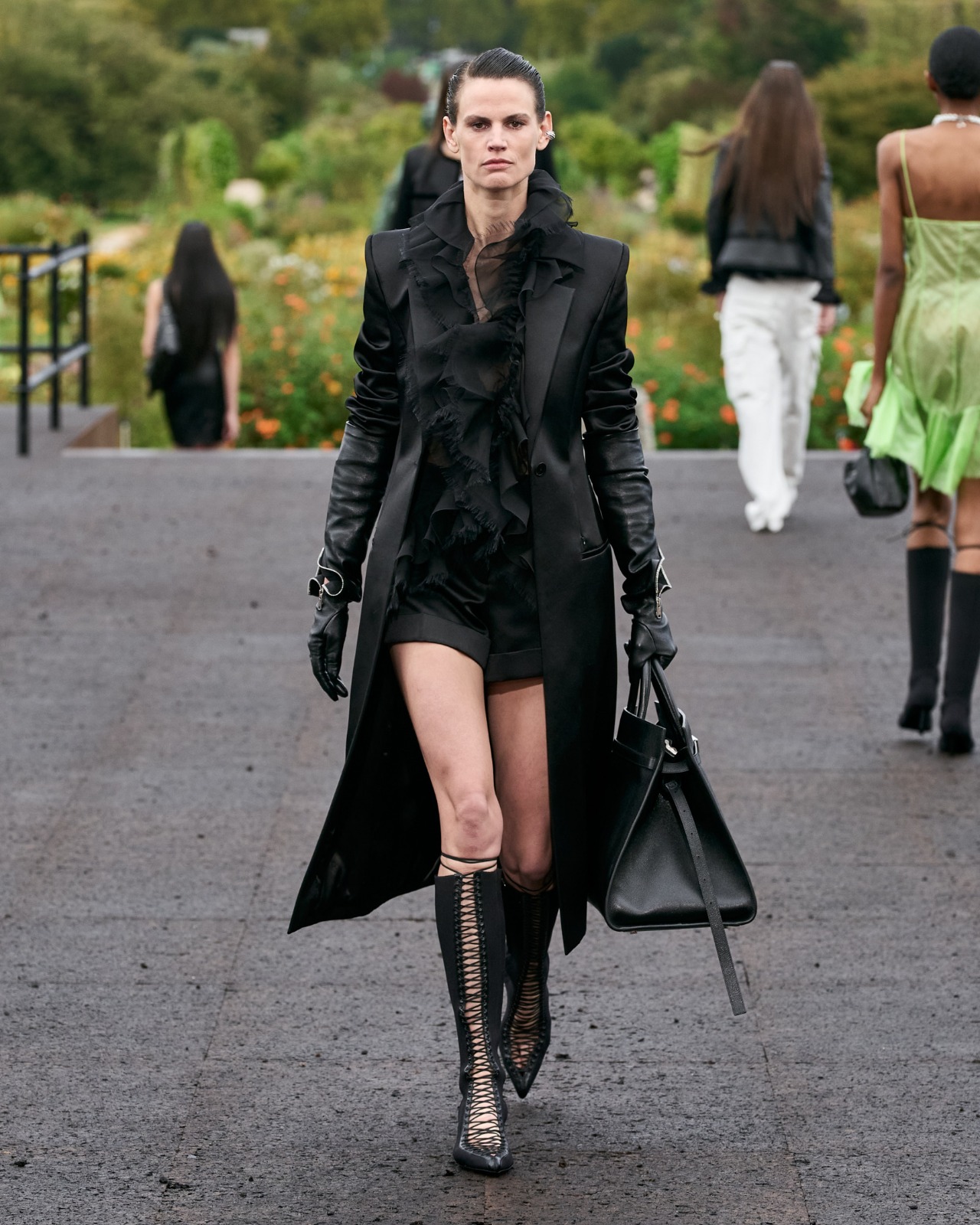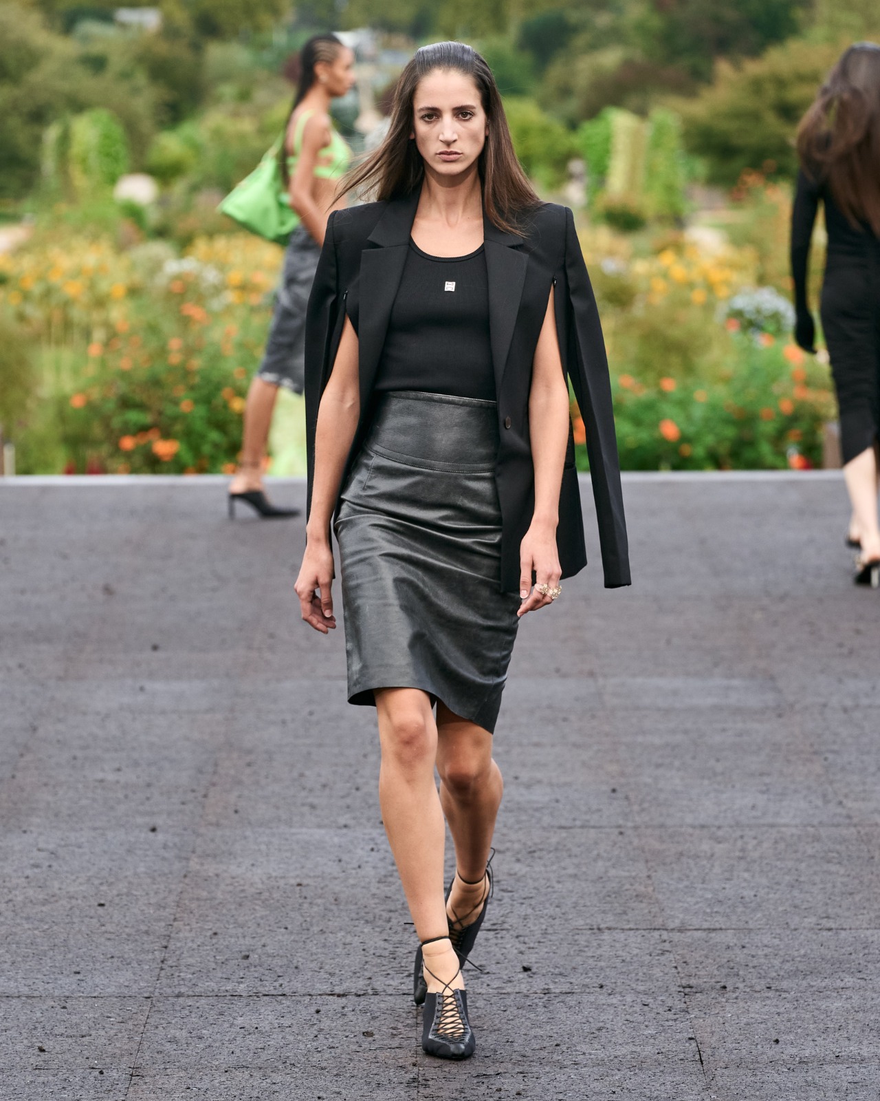 ジバンシィらしいエレガントな要素も健在。中央にギャザーを寄せたドレスやスカート、メゾンの象徴とも言えるブラックドレスは、しなやかな素材使いにより様々なバリエーションで登場した。ツイードやブークレのボックスジャケットは、ジバンシィの「4G」ロゴをあしらったアーカイブのスカートスーツをイメージしたものだそう。