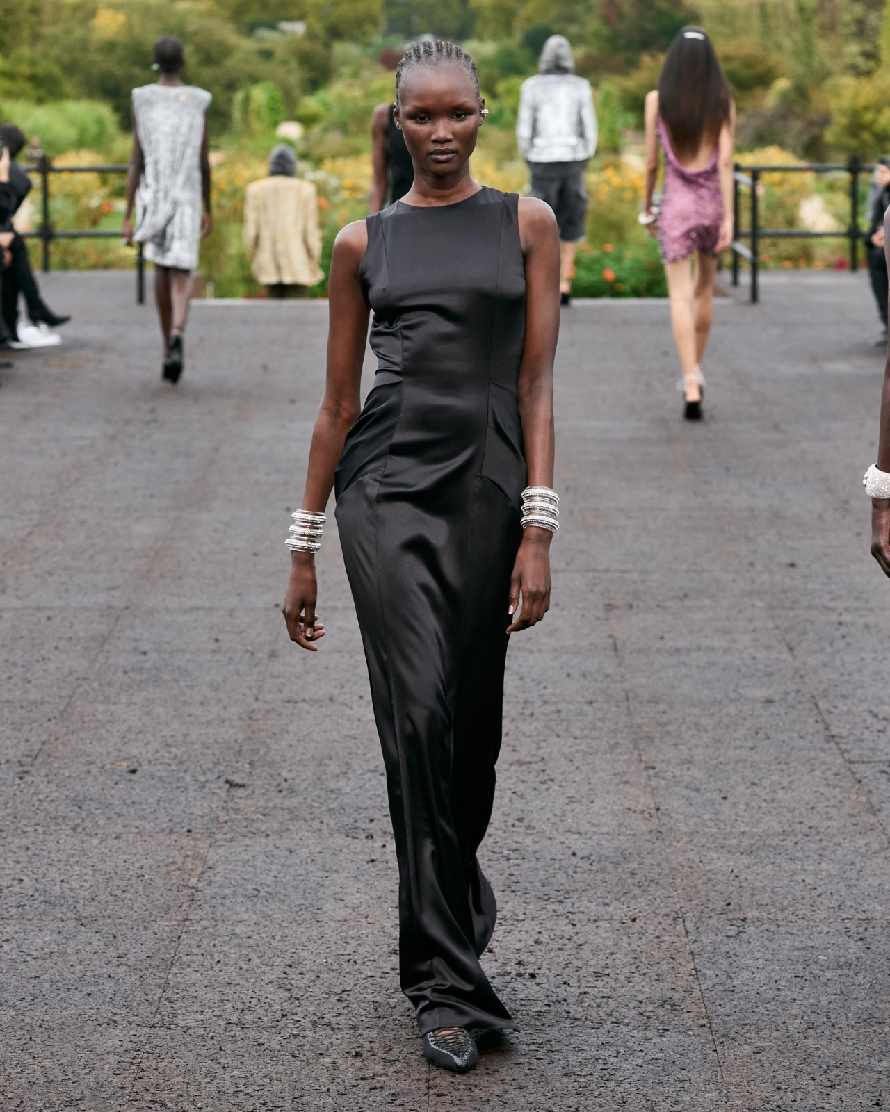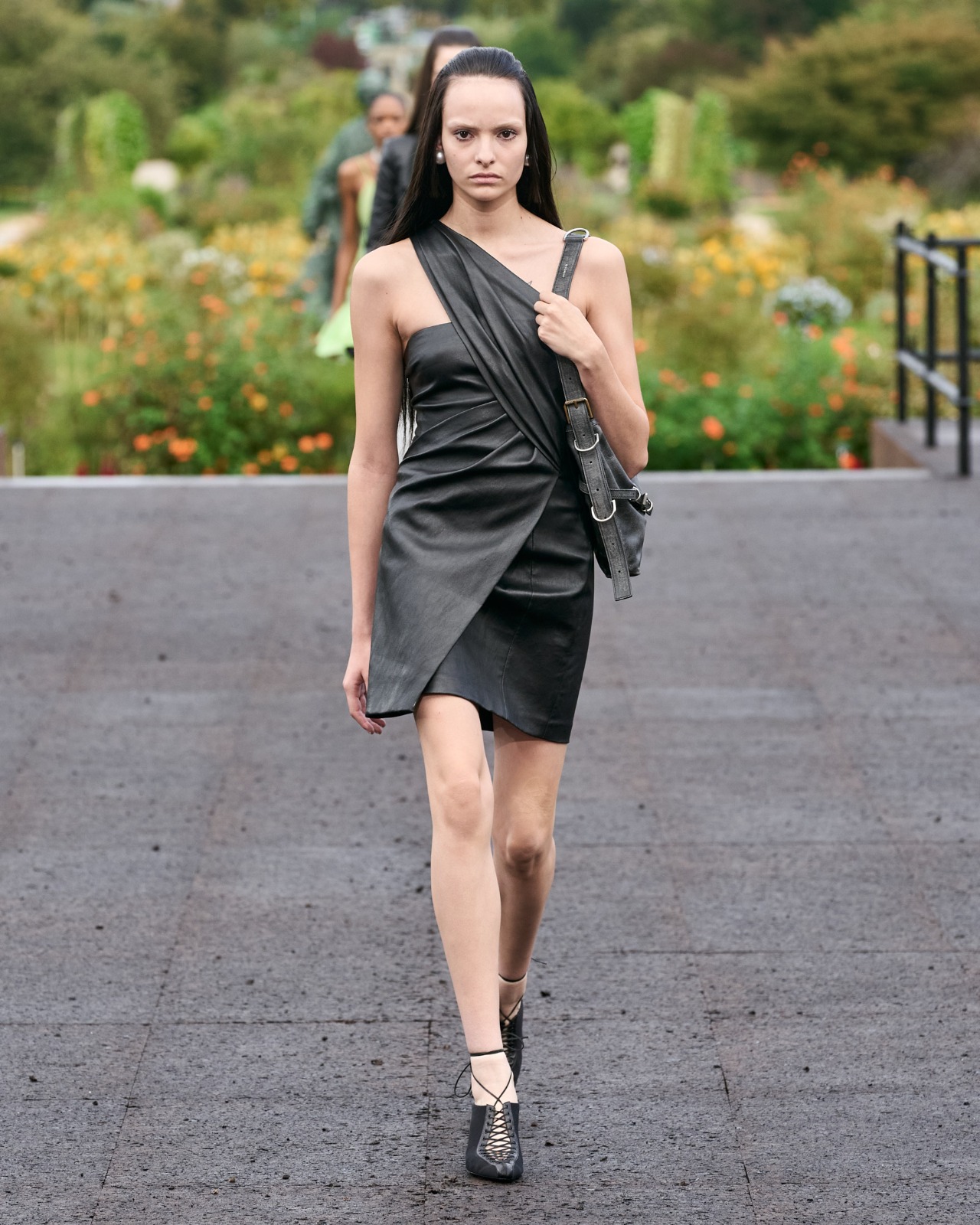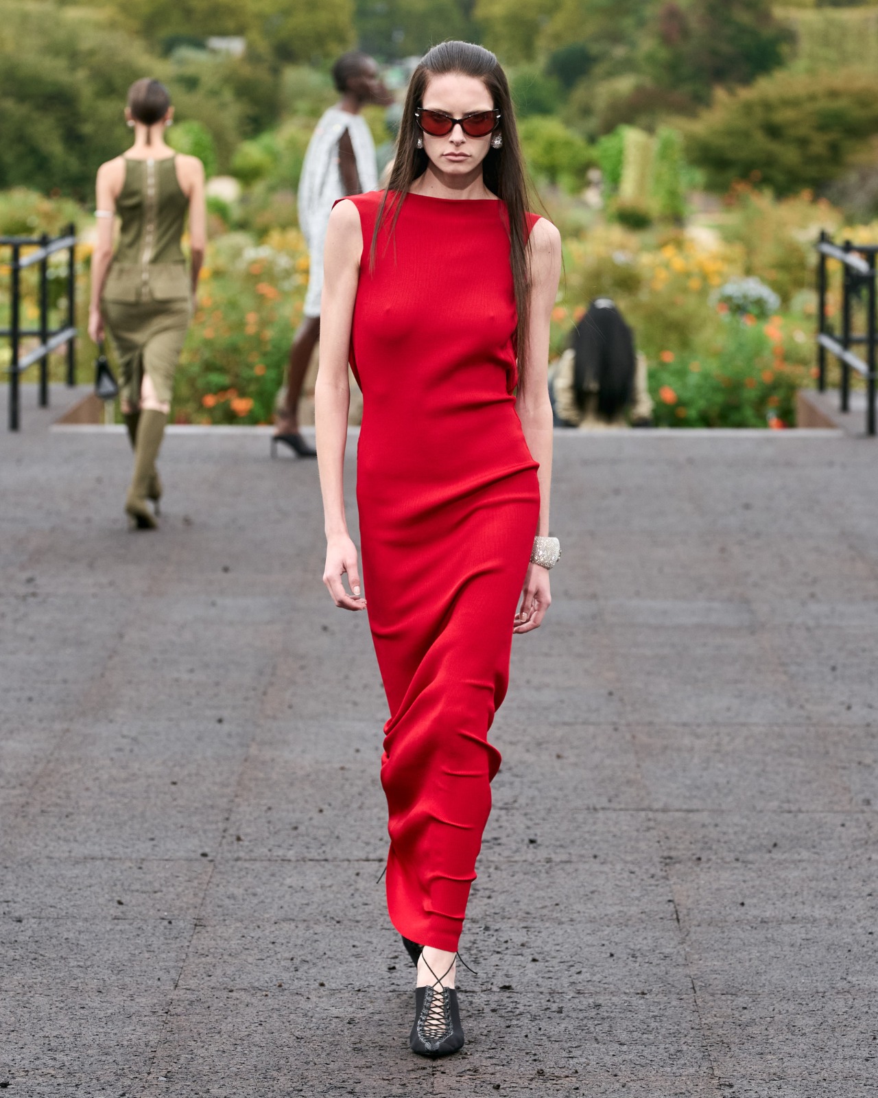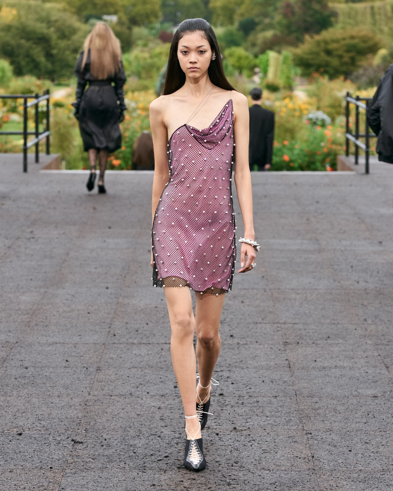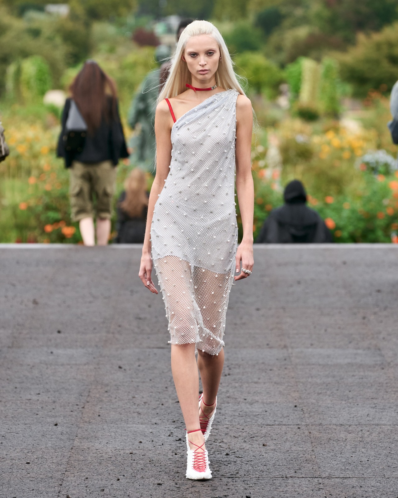 終盤は、華やかなドレスが次々と登場。クリア樹脂やパールのジュエリーが輝きを添えた。足元には、レースで編み上げたニーハイブーツやミュール、ストラップ付きのポインテッドミュールなどが取り入れられた。