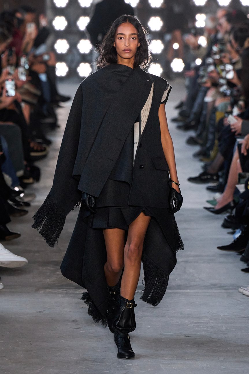 サカイと言えば、ウールとナイロン、テーラードとスポーツウェアなど、対照的な要素を組み合わせる“ハイブリッド”なデザイン手法。そこに今回は、"ラッピング"を深く探究することで見慣れた服の新しい形を提示した。ラッピングは優しさや包み込む安心感を象徴するが、同時に着用者に着方を託すことで、個々人の個性を解放する役割を担う。ファーストルックのジャケットの袖を切り落としたような、芯地が覗くダブルブレストジレはその代表格で、スカートの大胆なスリットやマーメイドシルエット、フリンジ付きのショールなどで生まれる流動的なフォルムは、サカイが近年強化しているテーラリング志向とハンドワークの要素を結びつけており、ラフな実験性と美しい仕立てが両立していた。