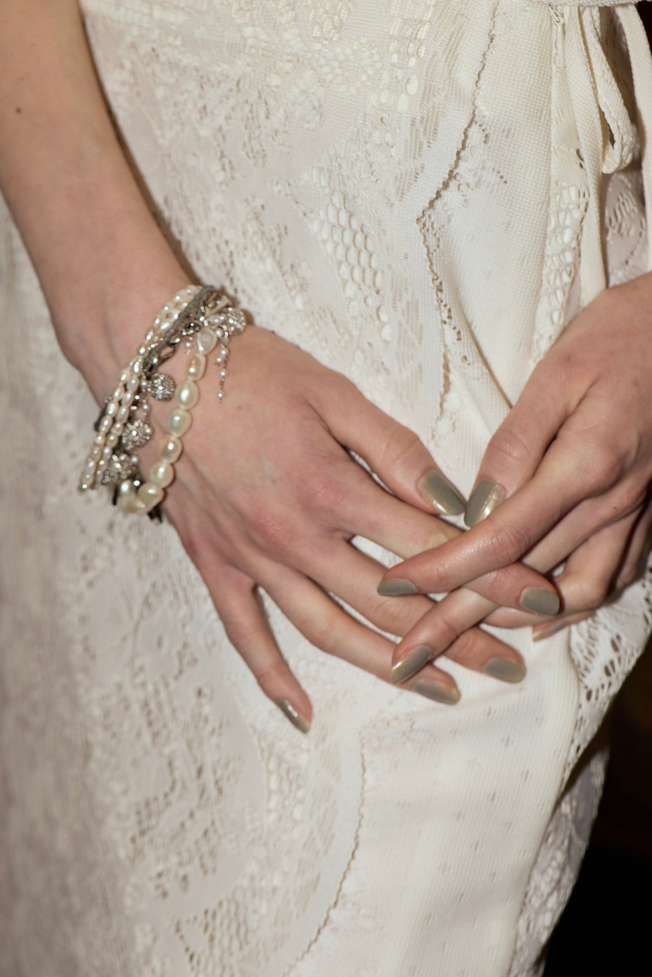 今回のコレクションは、サテンのようにツヤ感のある素材が使われていたものもありますが、ニットのビスチェやセットアップ、コットンのパンツなど、全体的にマットな質感でナチュラルなカラーのアイテムが多かったことから、指先のツヤとラメで遊び心をプラスしながら差し色になりすぎないようなカーキ色で統一しました。メイクと合わせたというよりは、衣服やアクセサリーなどを含めた全体的なバランスや印象に合わせ、リゾート感と複雑性を演出する意味から、このカラーが合うと思いました。