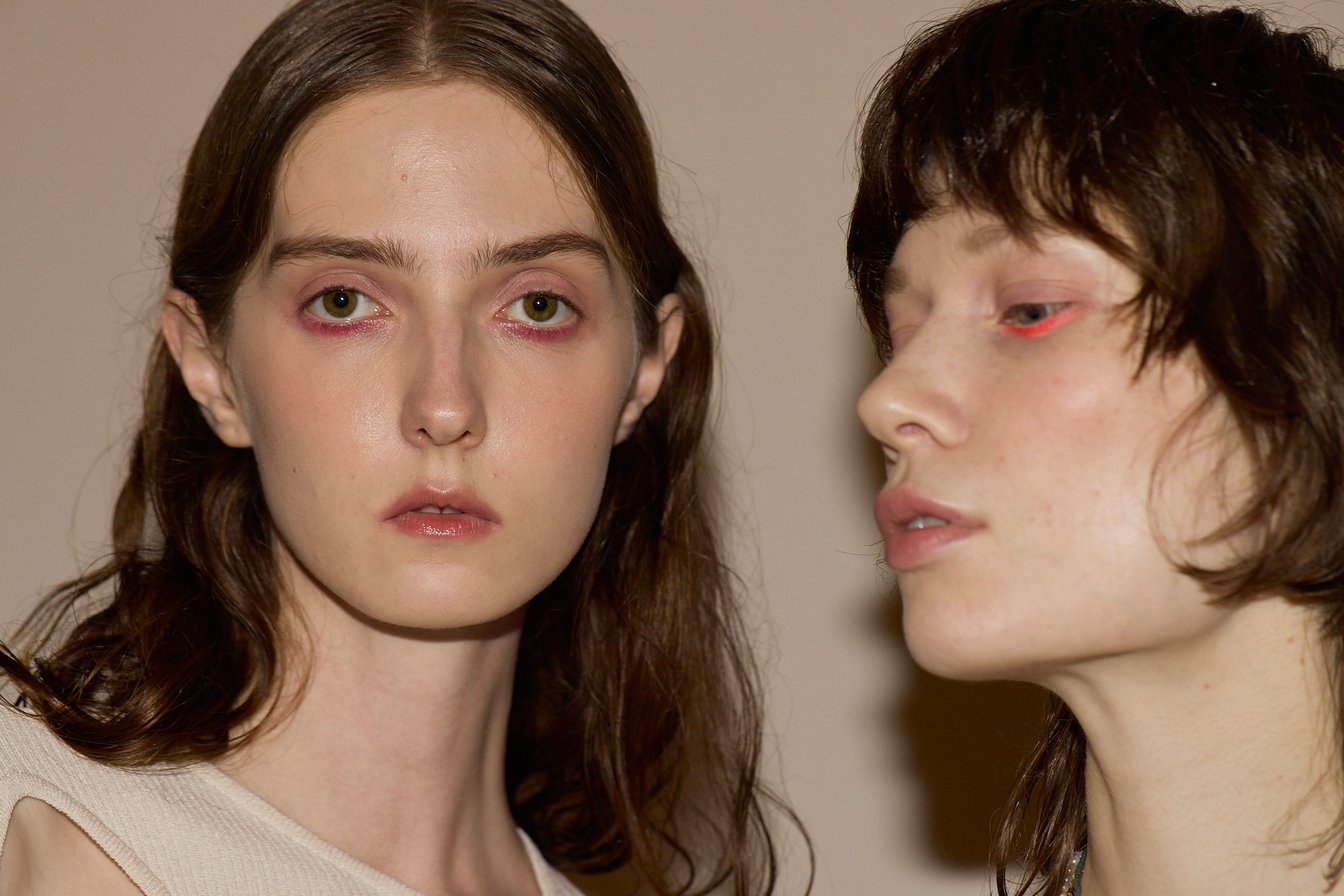 下まぶたに塗った蛍光色のピンクとオレンジがポイントです。先ほども言ったように、今回のコレクションは全体的にマットな質感かつナチュラルなカラーのアイテムで構成されていたので、アイメイクまでナチュラルだとぼやけた印象になってしまう。だから目で意思の強さを演出し、“複雑な人間模様を描く”というコレクションのテーマをメイクにも落とし込みました。