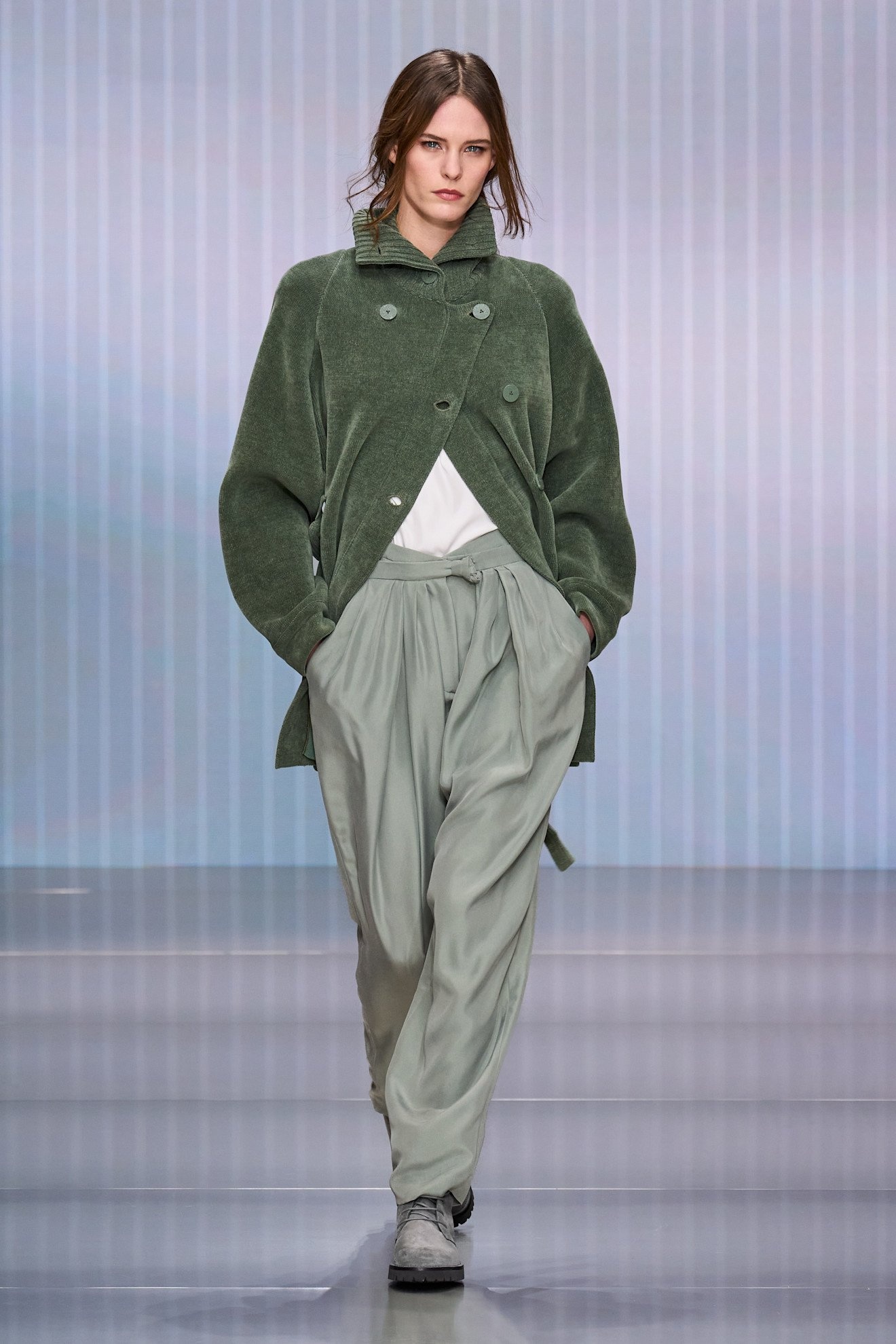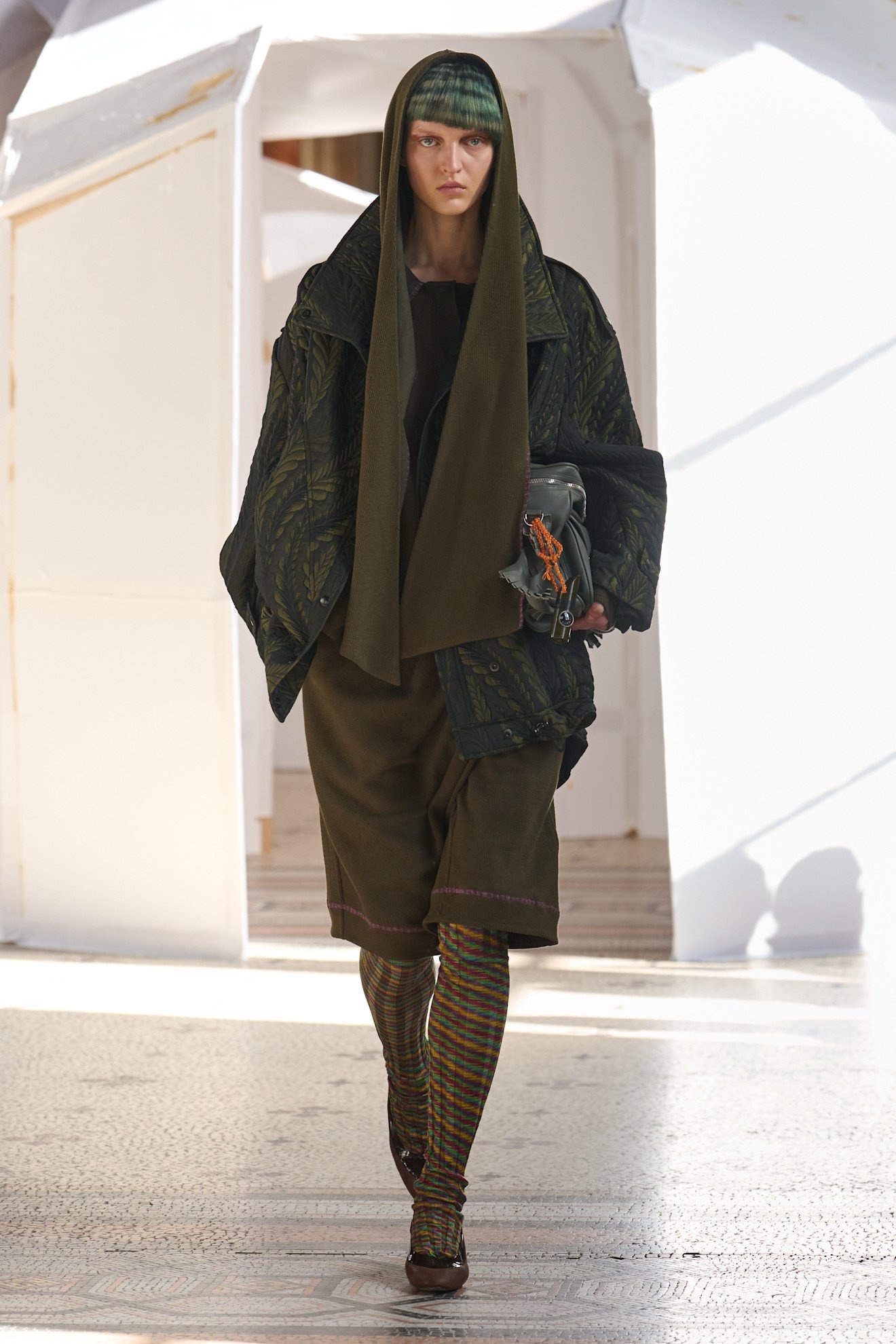 自然を羨望するようなアプローチは今シーズンの潮流。色彩の面でも、安らぎと癒しを感じさせるアースカラーや、自然界を彩るカラーが台頭。グリーン系は、特に落ち着いたオリーブのような色合いが印象的で、「ディオール(Dior)」のフリルスカートはフォルムからもボタニカルなテイストが表れていた。「フェラガモ(FERRAGAMO)」や「アンテプリマ(AMTEPRIMA)」は、体を優しく包み込むアウターに採用。ドリス ヴァン ノッテンや「ルイ ヴィトン(LOUIS VUITTON)」は今季のキーパターンであるチェックにオリーブグリーンを取り入れた。