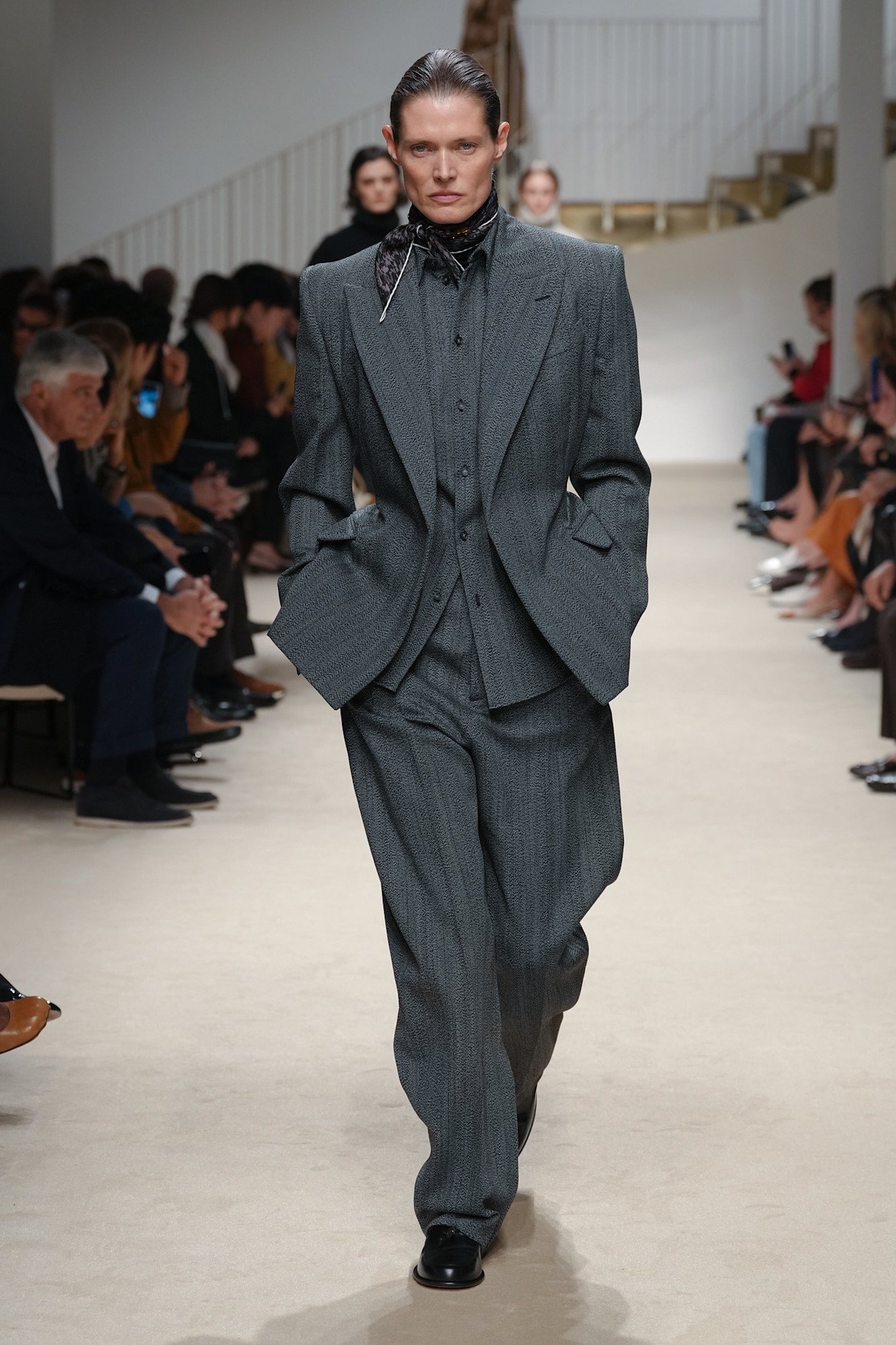 万能なニュートラルカラーのグレーは今季、ダークトーンでインダストリアルなムードが特徴。「ボッテガ・ヴェネタ(BOTTEGA VENETA)」や「ジル サンダー(JIL SANDER)」の、ダークグレーのスーツやジャケットスタイルが存在感を放った。構築的なショルダーラインが、力強い女性像を提案。「ジョルジオ アルマーニ(GIORGIO ARMANI)」や「ジバンシィ(GIVENCHY)」のように、インナーのトーンを変えた多層的なグレーの着こなしも、洗練された雰囲気を演出する。