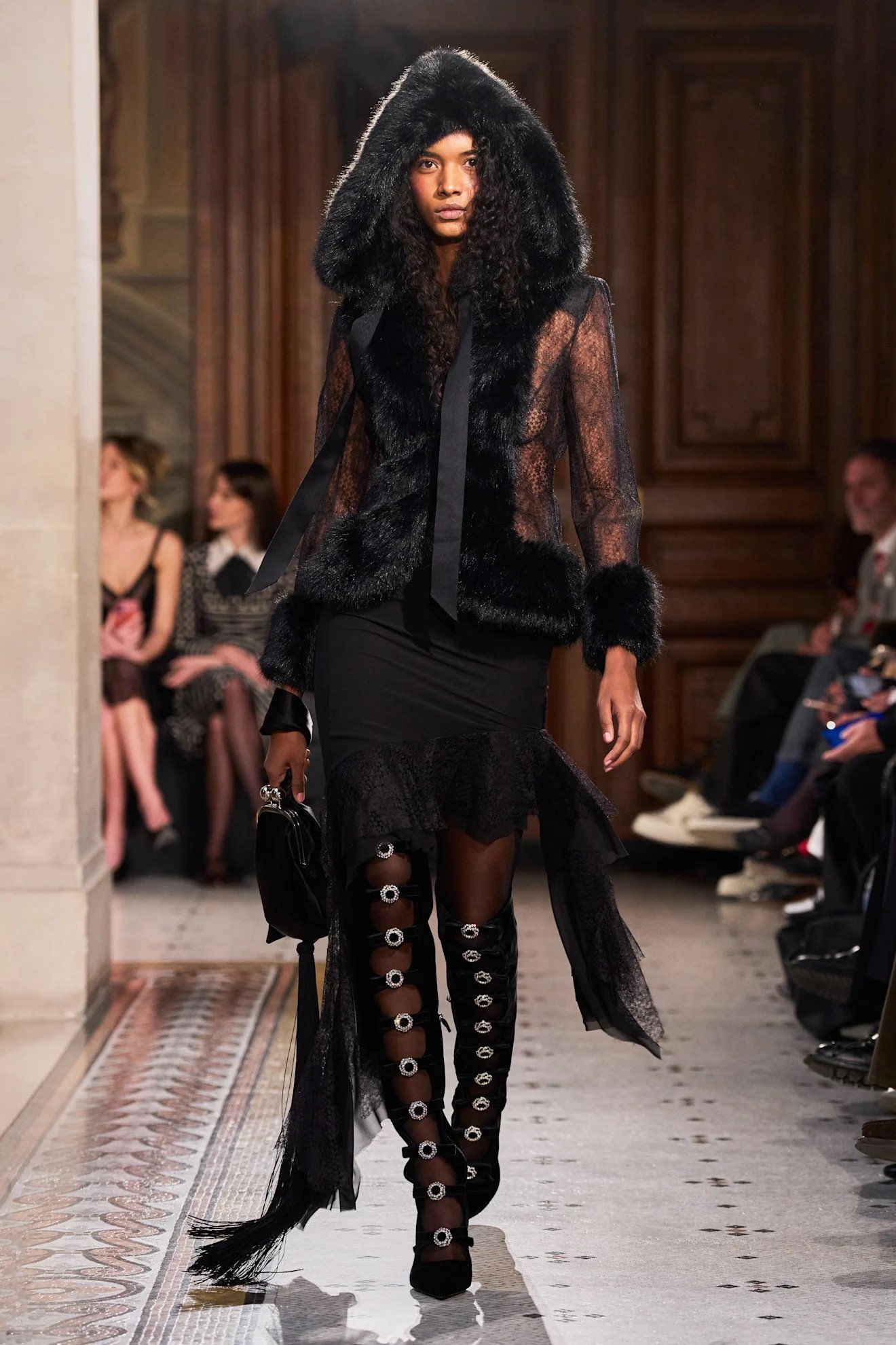 バイヤー視点の注目トレンドとして、ショルダーラインやパンツなどシルエットの変化が挙がった。肩周りは丸みや柔らかさを帯びながらも、パワーショルダーの大胆さを感じさせるフォルムが印象的で、パンツは細身シルエットへの移行に注目が集まった。ベロアなど光沢のある素材やファー、レース、フリルといった装飾的なディテール、チェックやヘリンボーンなどクラシカルな要素も存在感を放つ。