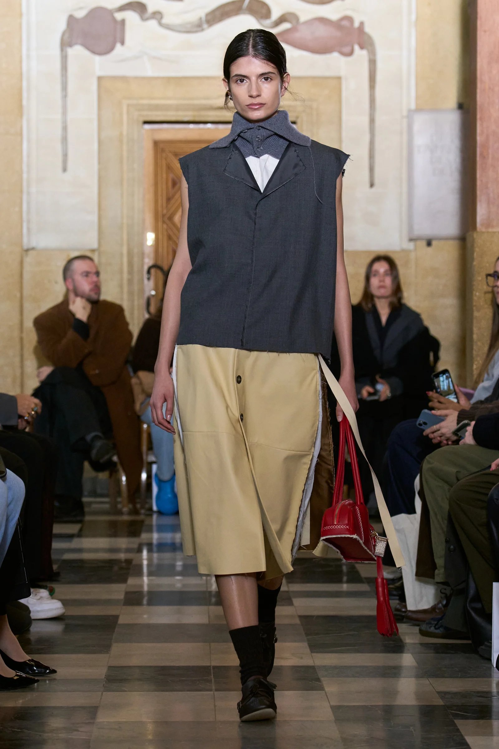 ・バーニーズ ニューヨーク ウィメンズバイヤー 宮嶋泰子:懐かしさを感じるチェック柄やレース、ランジェリーのような要素を、ツイードやスーツ地などのテーラリングの要素と掛け合わせるスタイリングが印象的でした。裾やディテールにさりげなく取り入れることで、重厚さを軽やかに崩しながら、新しいバランスを生み出していると感じています。カラーはバーガンディーや赤に加え、ブラウンの流れも引き続き見られました。
