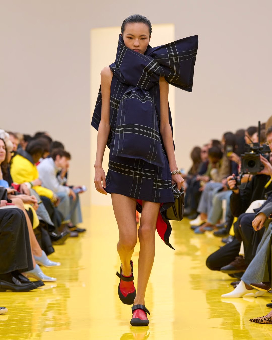 ・阪急阪神百貨店 (売り場)バイヤー 源野里沙子:ボトムが細身に寄ってきているのが26年春夏に引き続き気になりました。全体的にカラーバリエーションが豊富で、秋冬のダークなムードを払拭するようなアイテムが多かったです(ビビッドレッドやミントグリーンなどの差し色が目を引きました)。また、スポーティなミックス要素はより幅広いブランドで取り入れられていて、デイリーに提案できるシーズンだなと感じました。そして相反するかのように色々なブランドでファーアイテムが出てきていて、少しバブリーな印象を受けました。エレガンス回帰と共に、レトロムードが再燃してきそうに感じます。