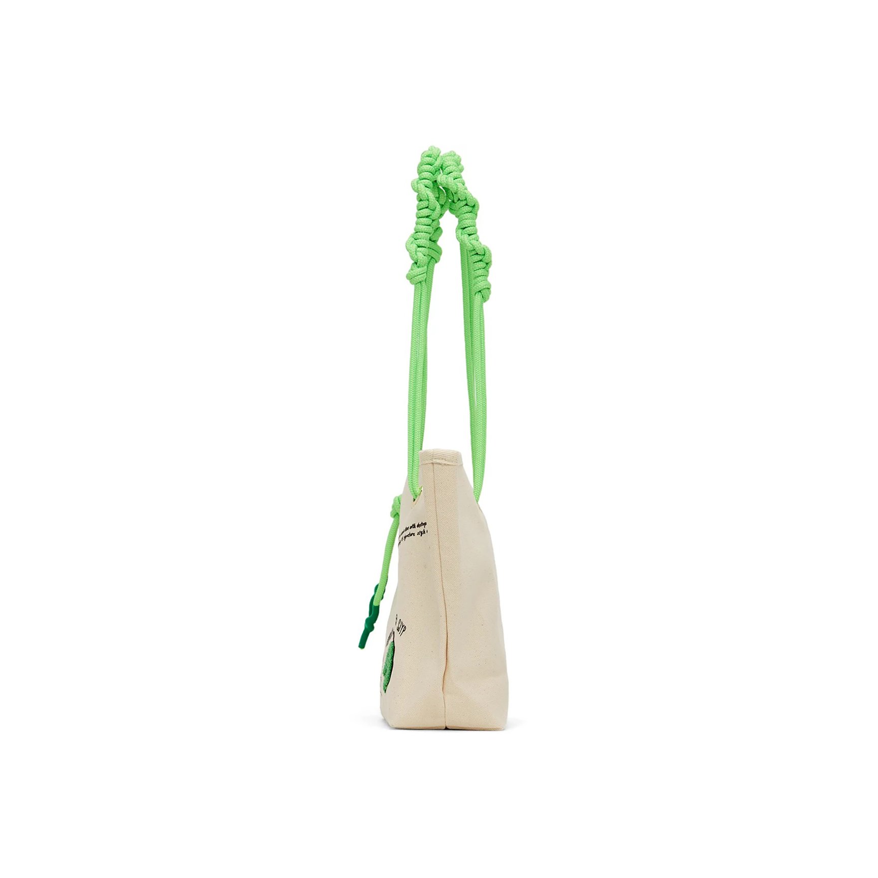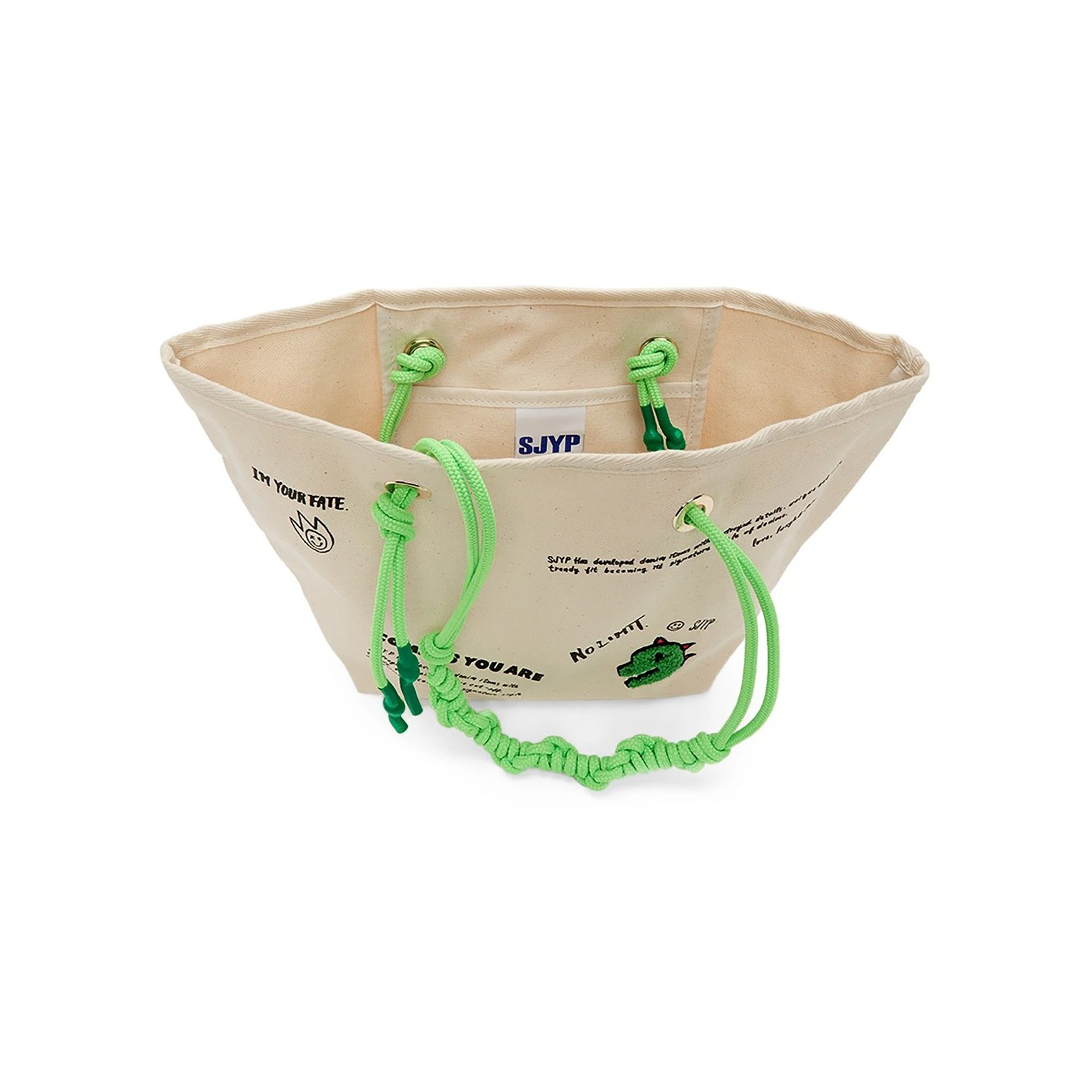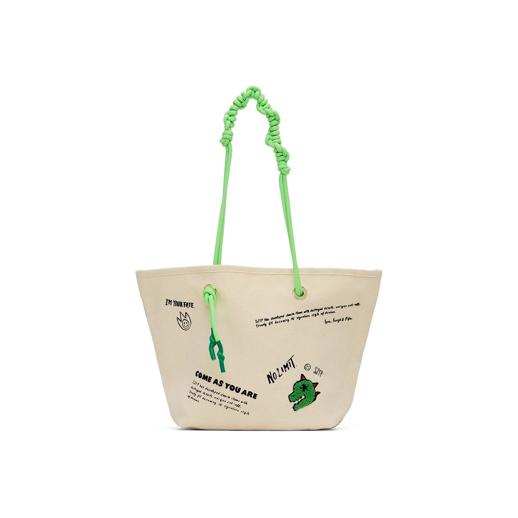 キャンバストートの「ナチュラル感」が気になるなら、韓国発「エスジェイワイピ(SJYP)」のトートバッグはいかが?逆台形状のシャープなフォルムのキャンバス製ボディには、ネオングリーンのノットディテールハンドルがコントラスト豊かなアクセントに。落書き風のラフなグラフィックや、質感も楽しい恐竜のパッチなど、エッジの効いた遊び心を感じるモチーフが散りばめられています。