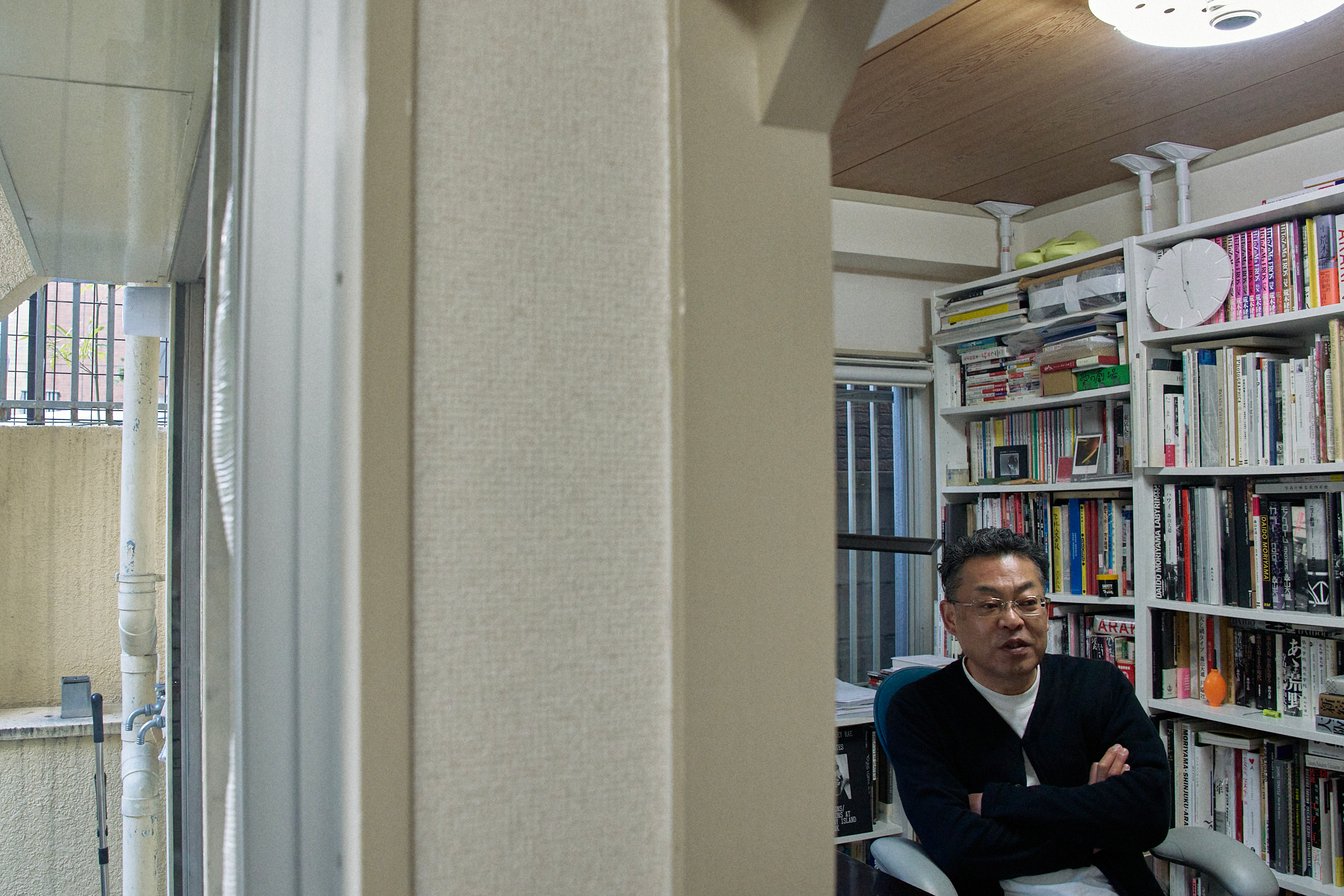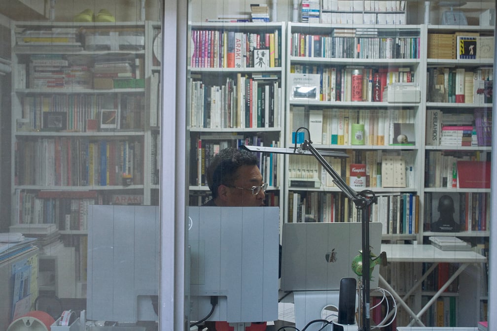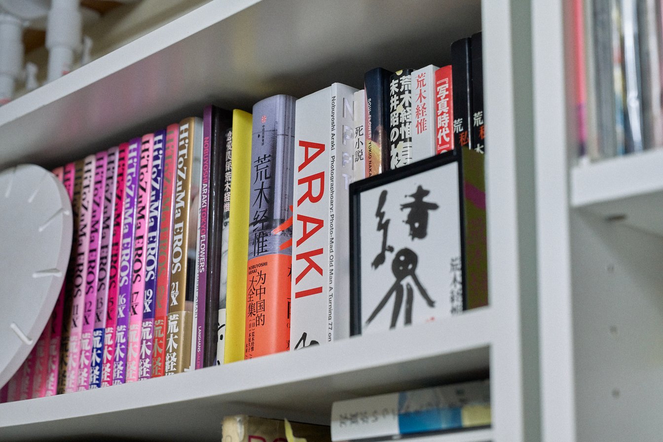 オフィスに並ぶ荒木経惟の写真集の一部。引っ越しのたびに持ち歩いてきたという。