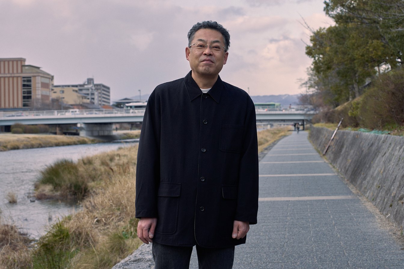 三条大橋近くの鴨川にて。アウターはいまだに捨てられないというコム デ ギャルソン・オムの1980年代末のリバーシブル・ハーフコート。