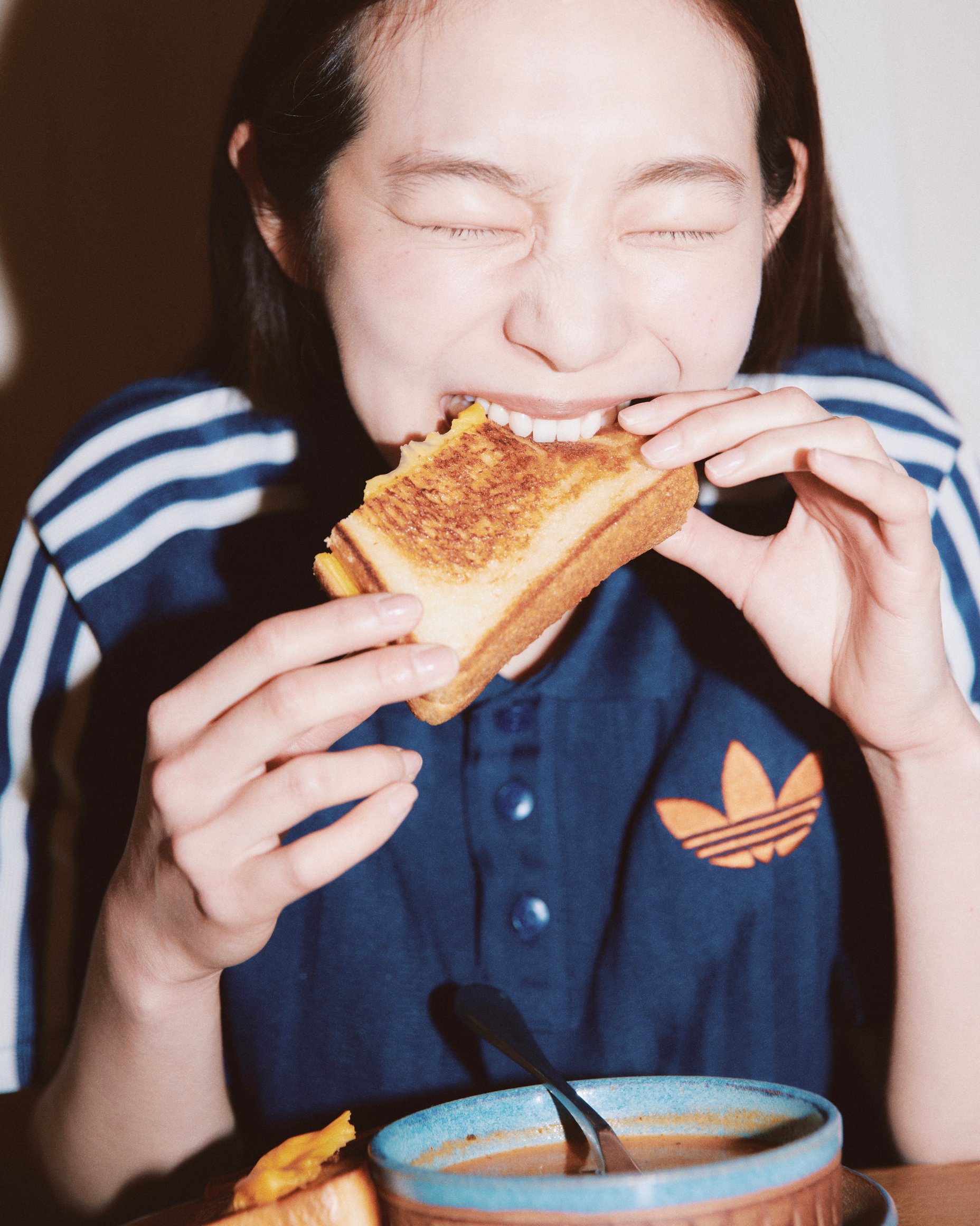 モデルの在原みゆ紀は、最近買ったばかりだという自転車に乗って登場。向かった先は、池の上の商店街沿いにあるカフェ「ロジーン」。アメリカンクラシックなサンドイッチと淹れたてのコーヒーが味わえるという、同氏のオアシス的空間で、いつものホットチョコレートとサンドイッチをオーダーして朝の時間を堪能した。