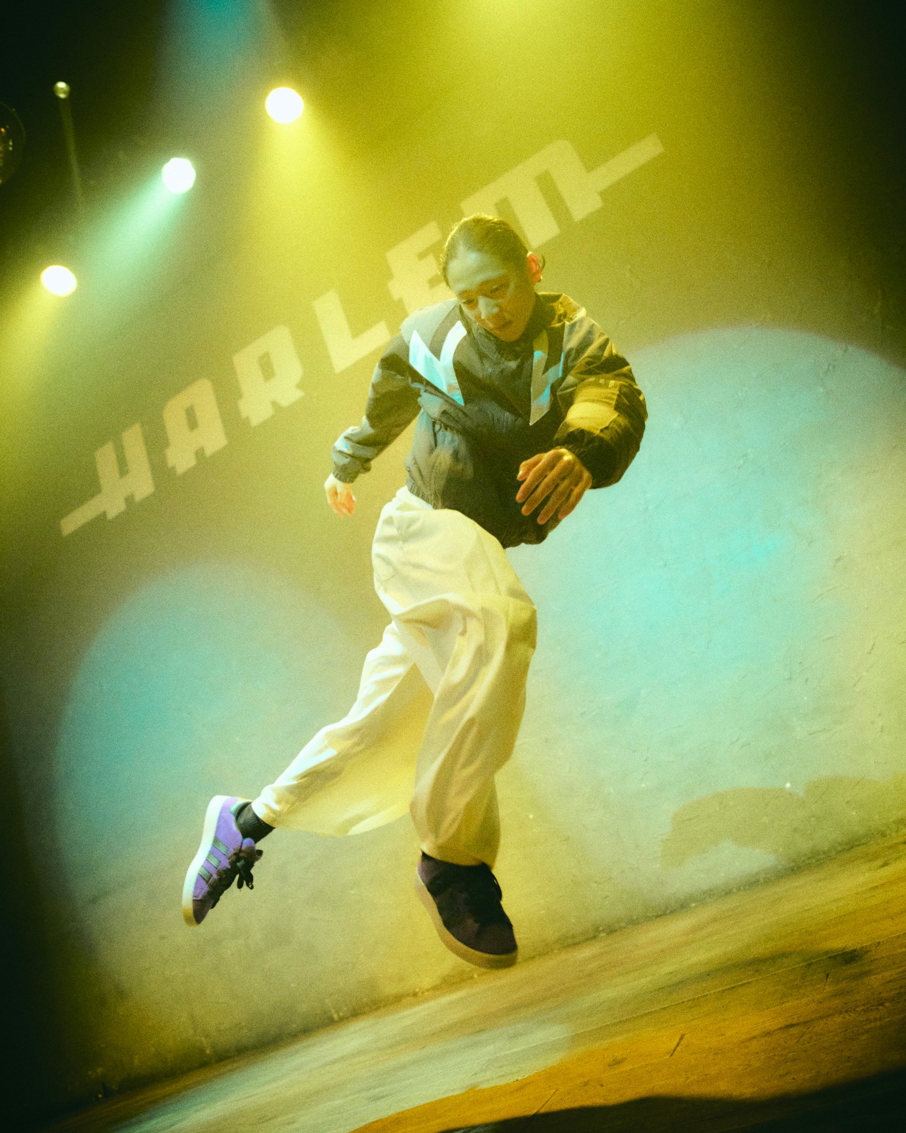 昨年、ダンスバトル「Red Bull Dance Your Style」で世界一のダンサーに輝いたTHE D SoraKiは、パープルのアッパーに透け感のあるソールが印象的なキャンパス 00sを着用し、ダンスを披露。同氏にダンスの厳しさと突き抜けて踊る楽しさを教えてくれたという「CLUB HARLEM」で撮影を行った。