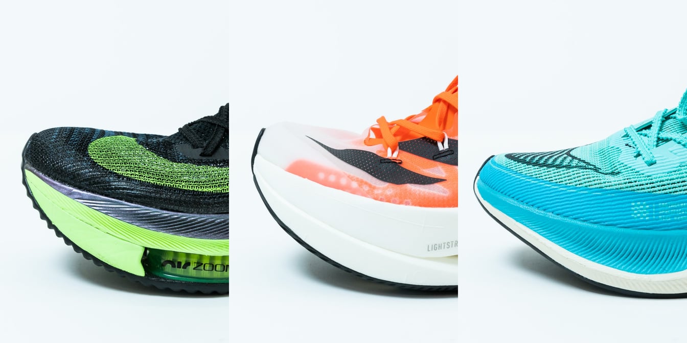 また、つま先の反り具合はプライムXが最も高く、地面からつま先の先端までの高さを計測したところプライムXが6cm、アルファフライが5.5cm、ネクスト%2が4cmでした。