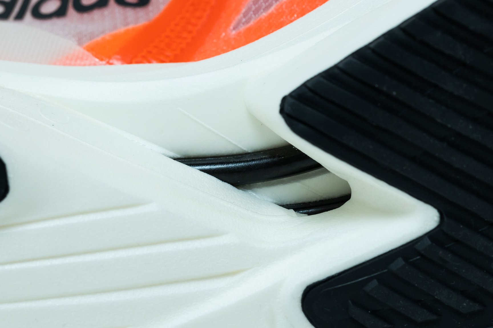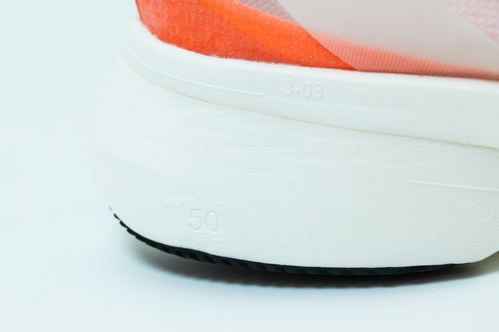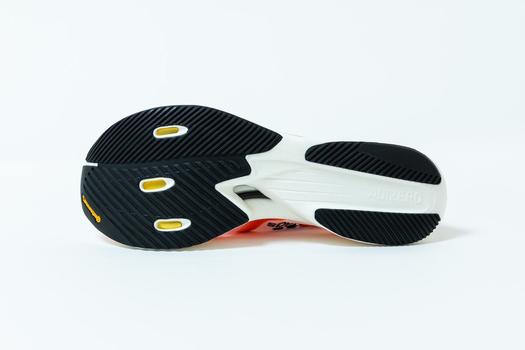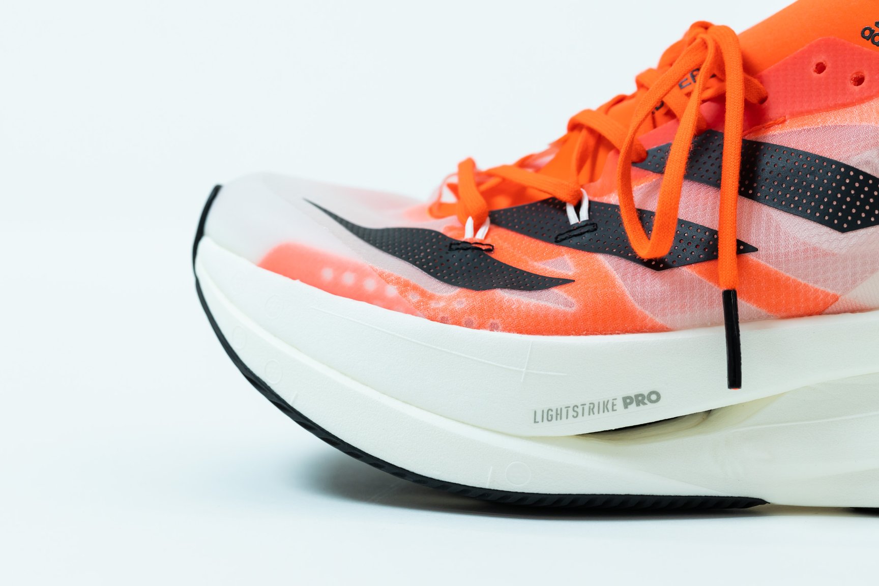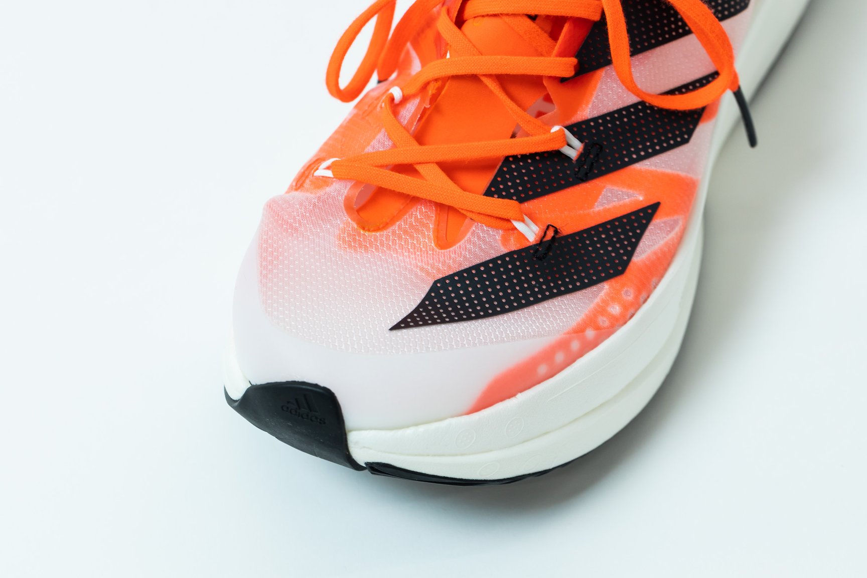 フォーム素材はレース向け規定内シューズの「アディゼロ アディオス プロ 2(ADEZERO ADIOS PRO 2)」と同様にクッション性、反発性、弾力性、軽量性などをハイレベルで実現した低密度高反発ミッドソール「ライトストライク プロ(LIGHTSTRIKE PRO)」を使用しています。アディゼロ アディオス プロ 2が2層なのに対し、今回発売されるモデルは3層なので着地時の沈み込みから蹴り出しの際の推進力が向上。アウトソールのコンチネンタル(Continental)社製のラバーによってグリップ力が向上しており、アッパーには一部にリサイクルポリエステルを用いたアディゼロシリーズ最薄最軽量のメッシュ素材「セラーメッシュ 2.0(CELERMESH 2.0)」を採用しています。他社が取り組んでこなかったデザインアプローチは、ナイキ(NIKE)一辺倒な厚底ランニング市場に一石を投じるモデルになるのではないかと注目されています。