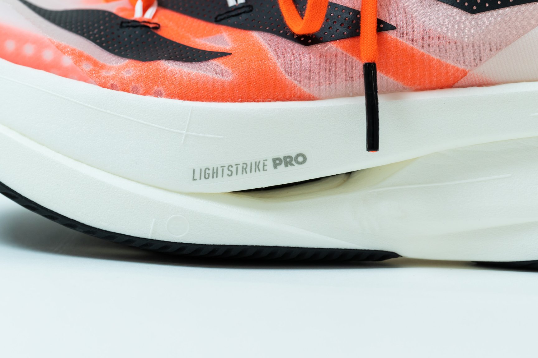 今回は、ナイキのハイスペックシューズ「エア ズーム アルファフライ ネクスト%」(以下、アルファフライ)、「ズームエックス ヴェイパーフライ ネクスト% 2」」(以下、ネクスト%2)と比較してみました。アルファフライとネクスト%2は世界陸連の規定内で製作しているためソールの厚さが3.8〜4cmで、プライム Xとは約1cmの差があります。フォーム素材はナイキ社の2モデルと比べると柔らかく、より衝撃を吸収する感覚がありました。