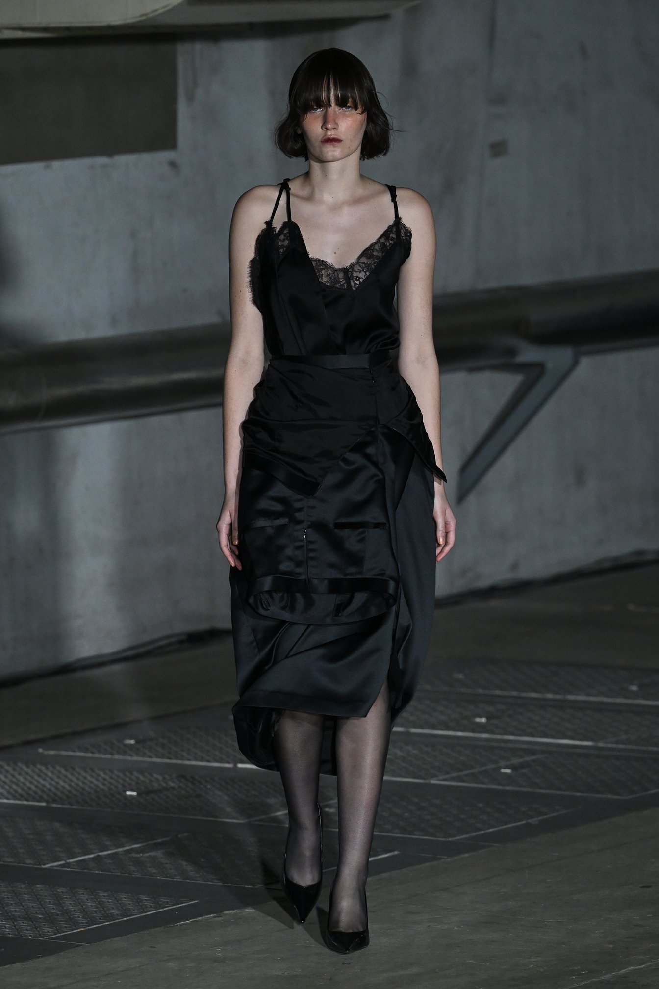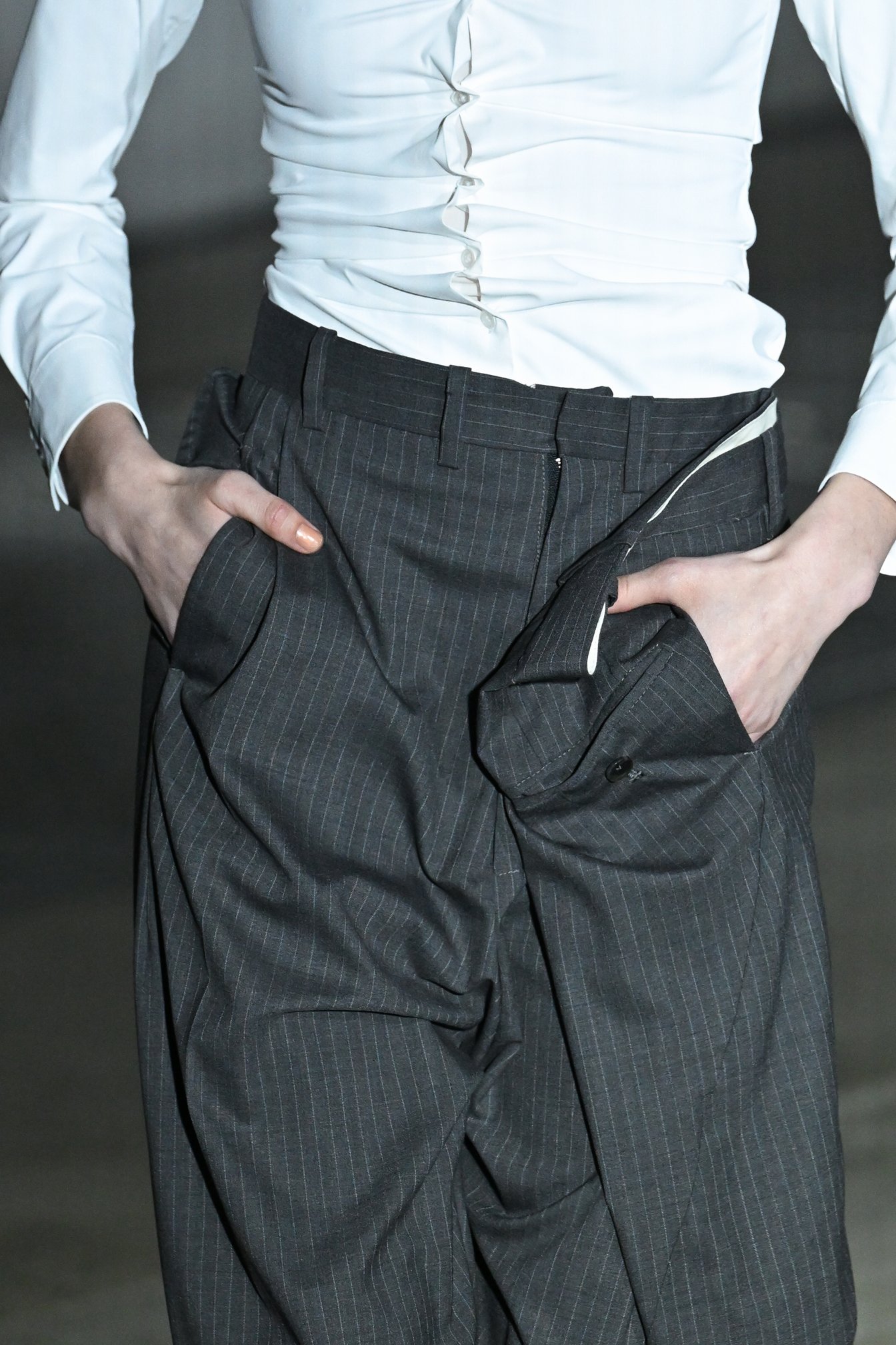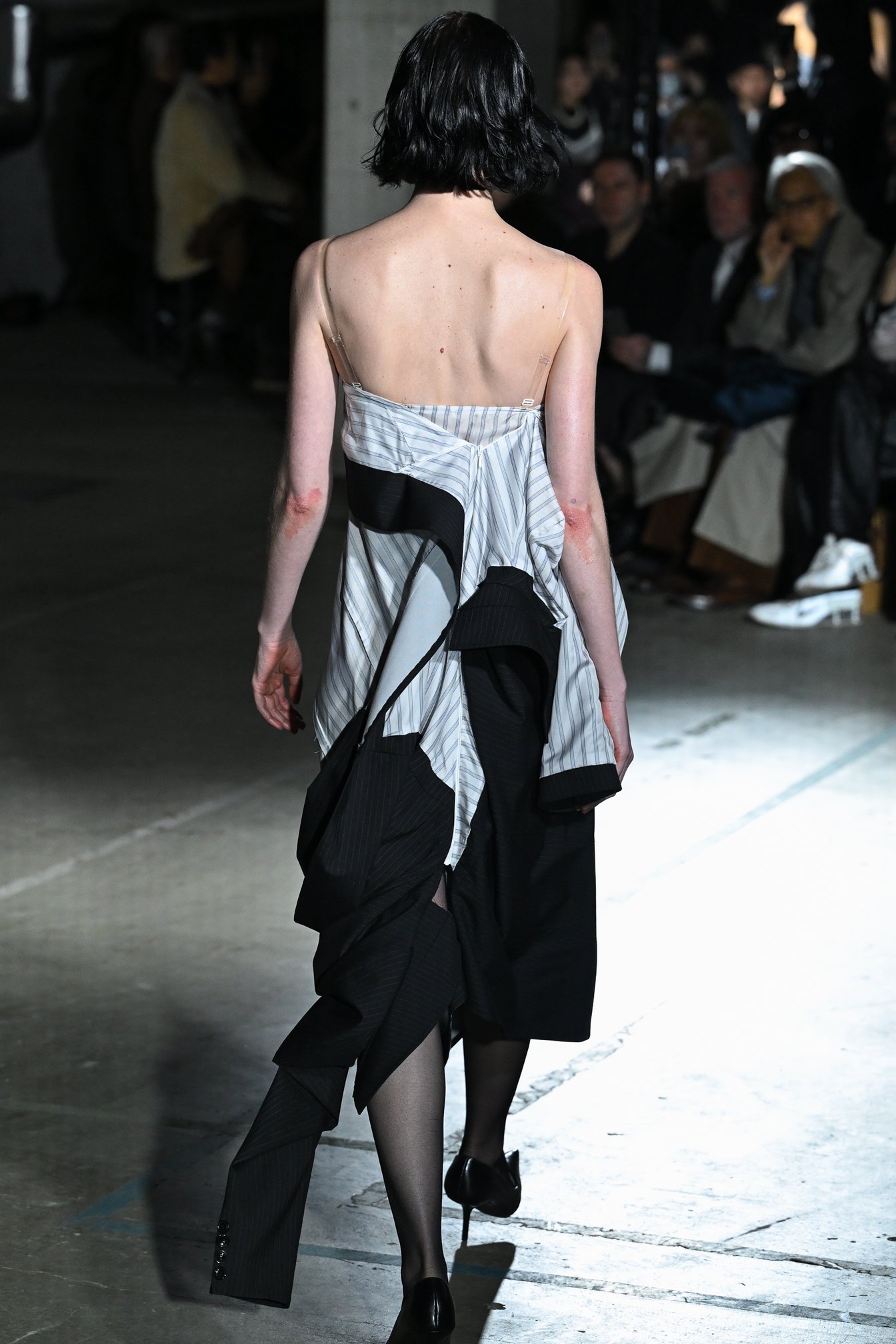 脱ぎかけのジャケットをそのまま巻きつけたようなドレスやスカート、たくしあげ腕を通している時のシワが入ったようなランジェリーキャミソール、ウエストが脱げかけたようなのパンツなど、コレクションには脱衣または着衣の動作を連想させるディテールのアイテムが多く登場した。そこには、過剰な貞操観念の押し付けで、生まれ持った本能を透明化されてきた女性たちの衝動を肯定するようなピュアなセンシュアリティが存在するように思う。タイトスカートやジャケット、シャツなど、社会的な記号は、青木の手により、女性の身体の上でセクシャリティを持って崩される。