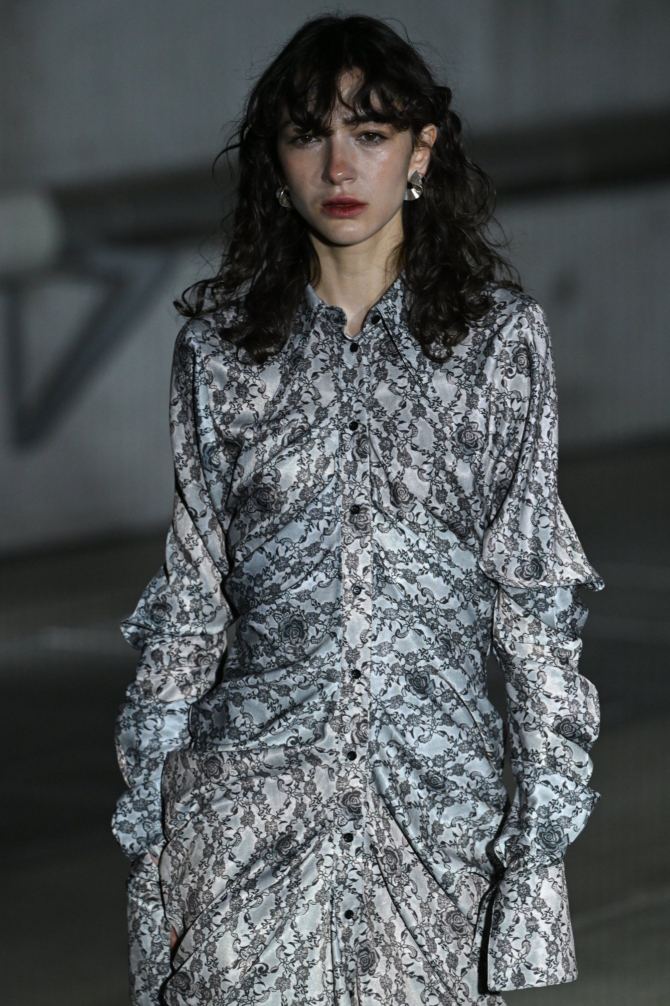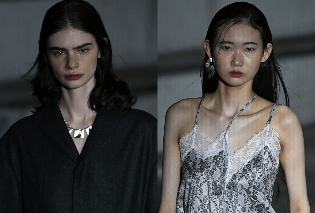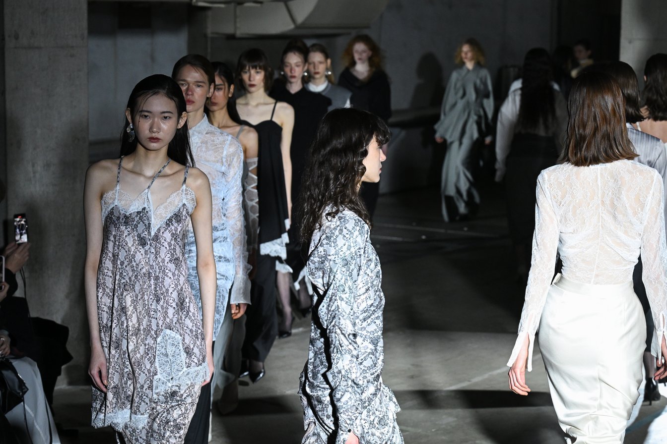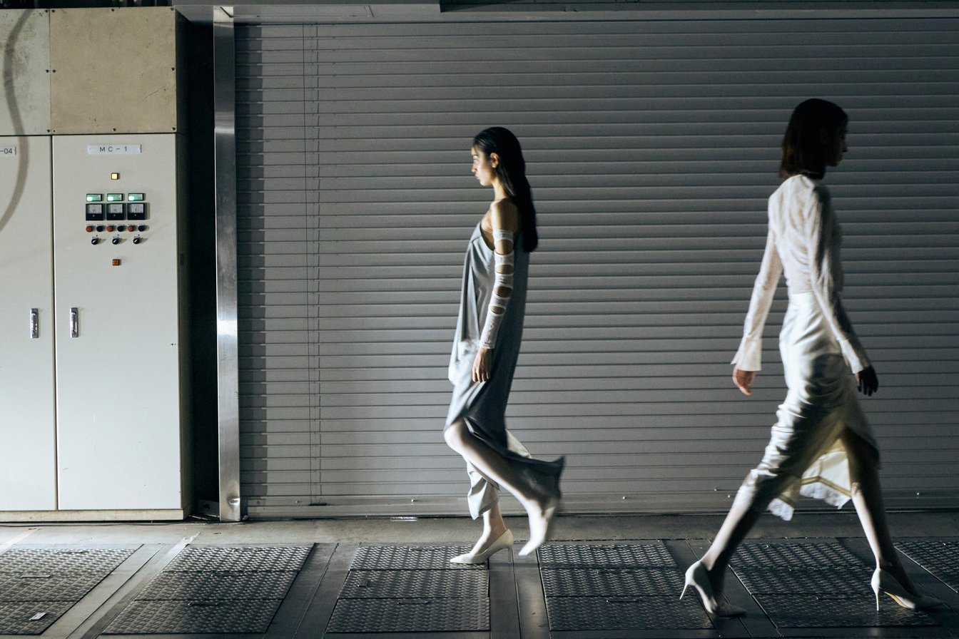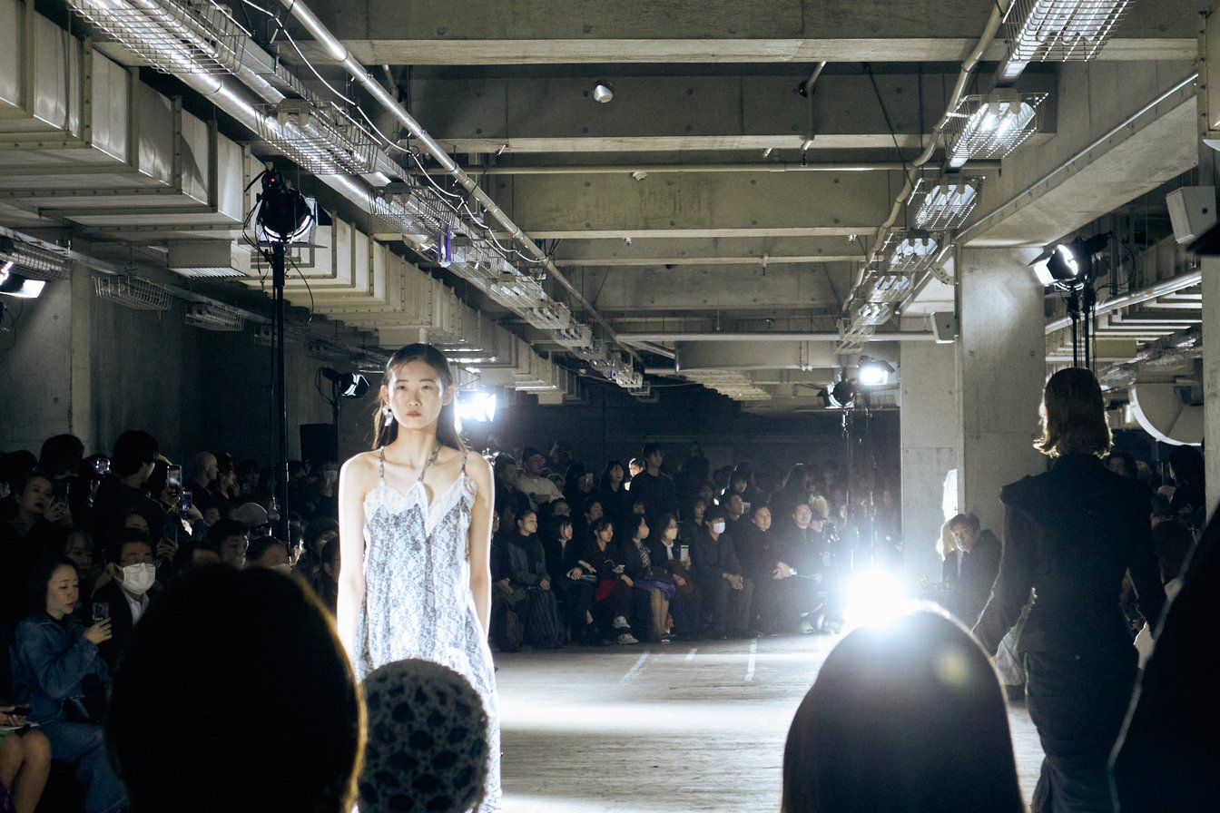 「東京クリエイティブサロン2024」のオープニングイベントとして開催された今回のショー会場となったのは、代々木第一体育館の倉庫。レースやサテンなど、しなやかで繊細な生地を着崩した女性たちが、冷たく無機質な剥き出しのコンクリート壁に囲まれて佇んでいるという違和感は、無防備でピュアな人間そのものの色香を際立たせていた。