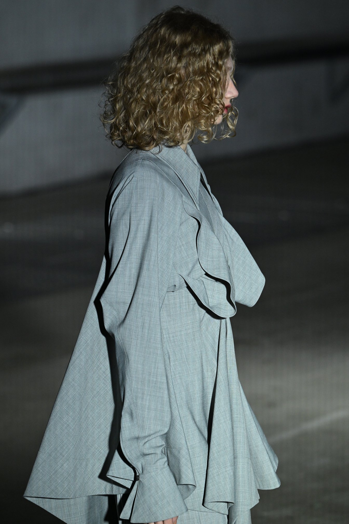 アキコアオキの2024年秋冬のテーマは「完成しきる前のプロセスの中にある美意識」で、「過程は本当に過程でしかないのか?」という着想のもと、先に考えたデザインを目指して服を作るのではなく「布の動きと対話するように、布の“性格”に合う“哀愁”を追求することで、プロセスの中でゴールを見つけた」という。