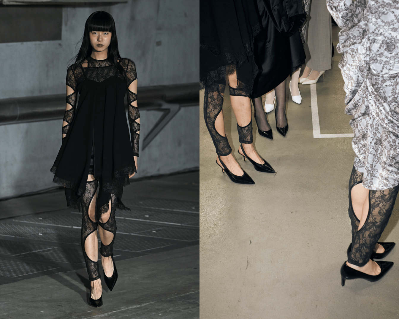 2024年春夏シーズンに登場したレースレギンスは、今シーズンも目を引いた。現在一部取扱店では販売が開始され、早速注目を集めているのだが、個人的には今春のトレンドとして黒レースのタイトなボトムに注目しており、アキコアオキが先駆けとなるのではと密かに予想している。