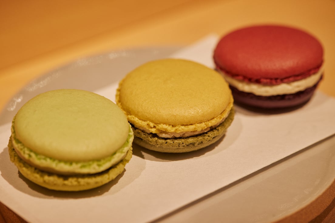「Ambient Weaving II」と題した企画展にて、織物による茶室「織庵」などを鑑賞したあと、カフェラウンジへ。平安時代に公家文化から生まれた女性のきものの配色美である「かさね色目」をテーマにしたオリジナルのマカロンは、イートインもテイクアウトも可能だ。「お世話になっている共演者の皆さんへのお土産に何がいいか迷っていたのですが、素敵な提案をもらえて助かりました。マカロンの裏表で色が違ったり、季節限定のフレーバーだったりするのも素敵ですね」。