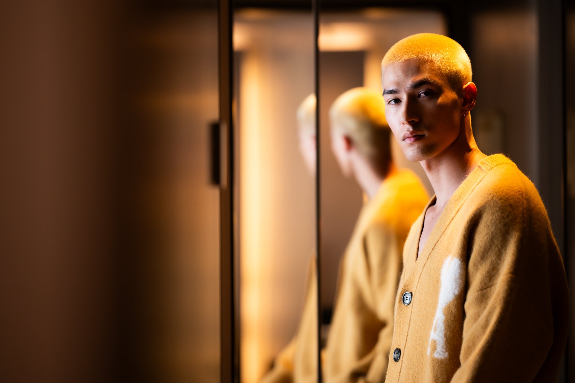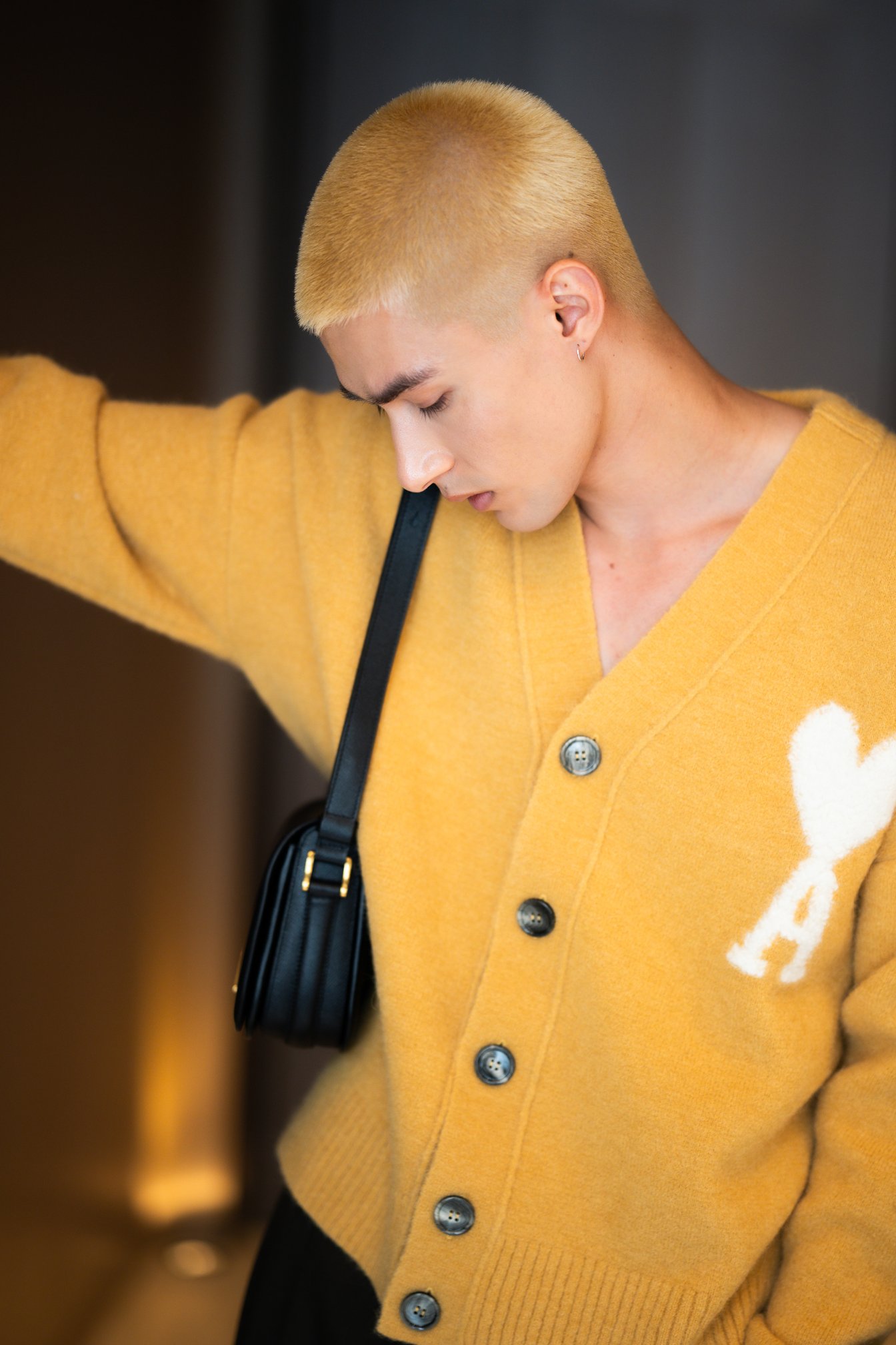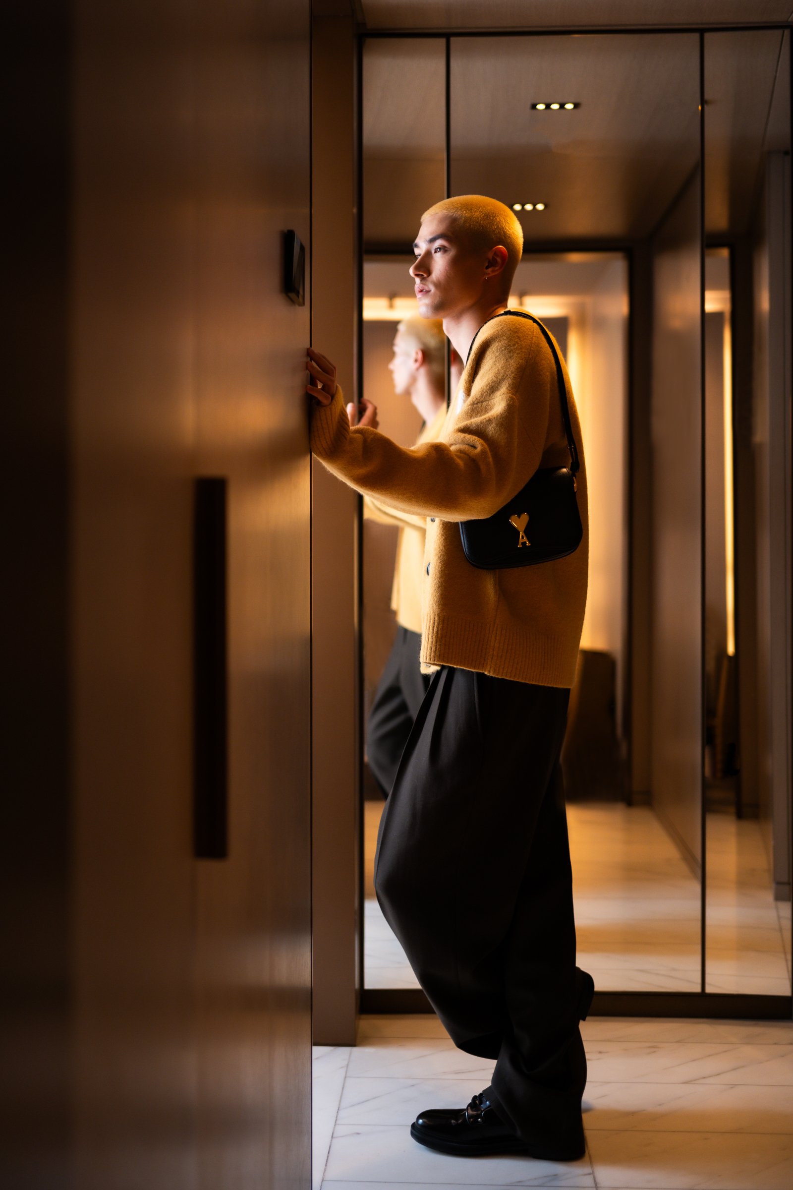胸元にオフホワイトの「アミ ドゥ クール(Ami de Coeur)」のインターシャが入ったイエローのカーディガンは、ボクシーなシルエットが特徴的。黒のグレインレザーの「Paris Paris バッグ」に合わせ、シックなスタイリングに昇華した。撮影中、滞在するパリのホテルの一室で、mikahはそのシルキーで甘い歌声を披露。今秋には、新作アルバムをリリース予定だという。