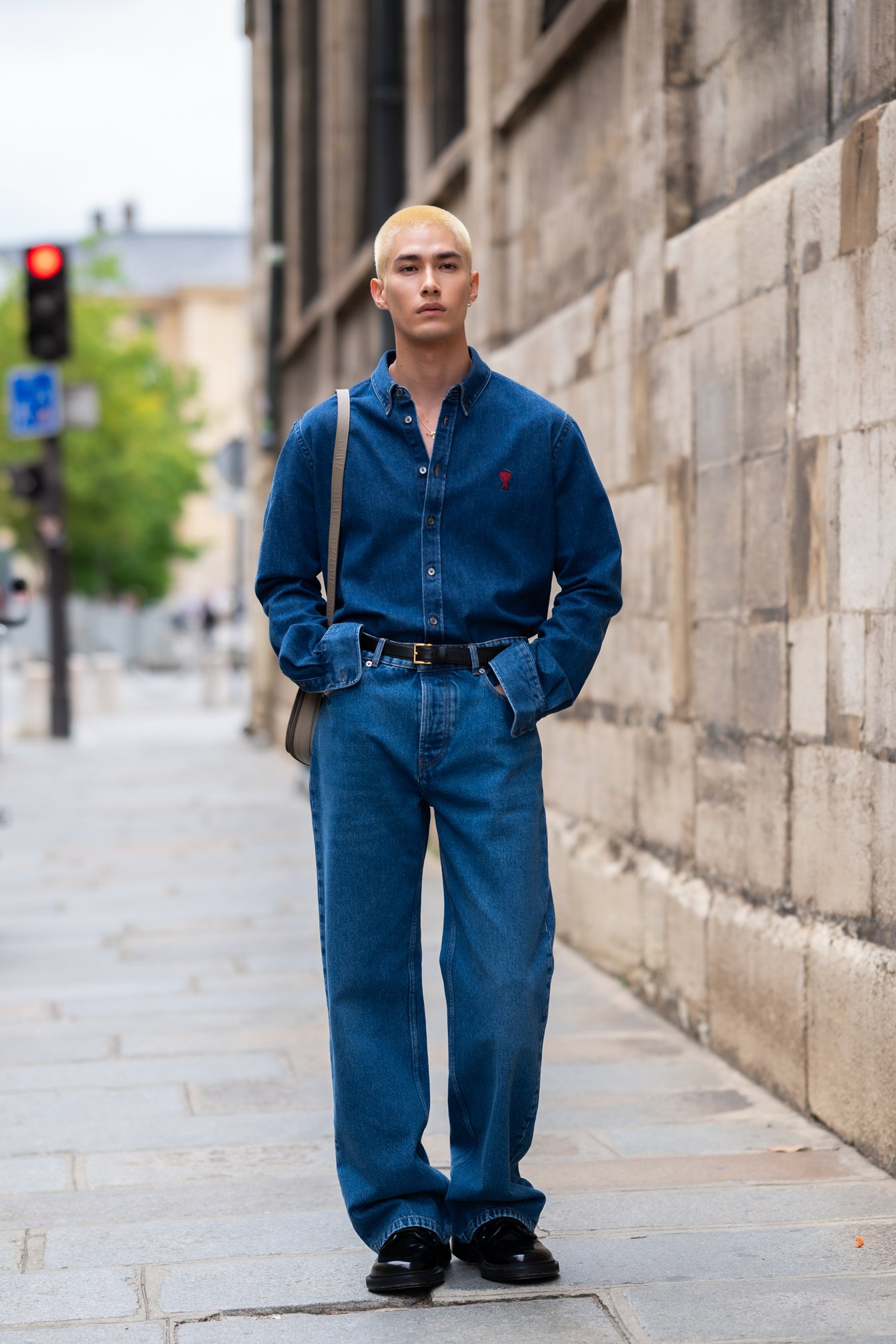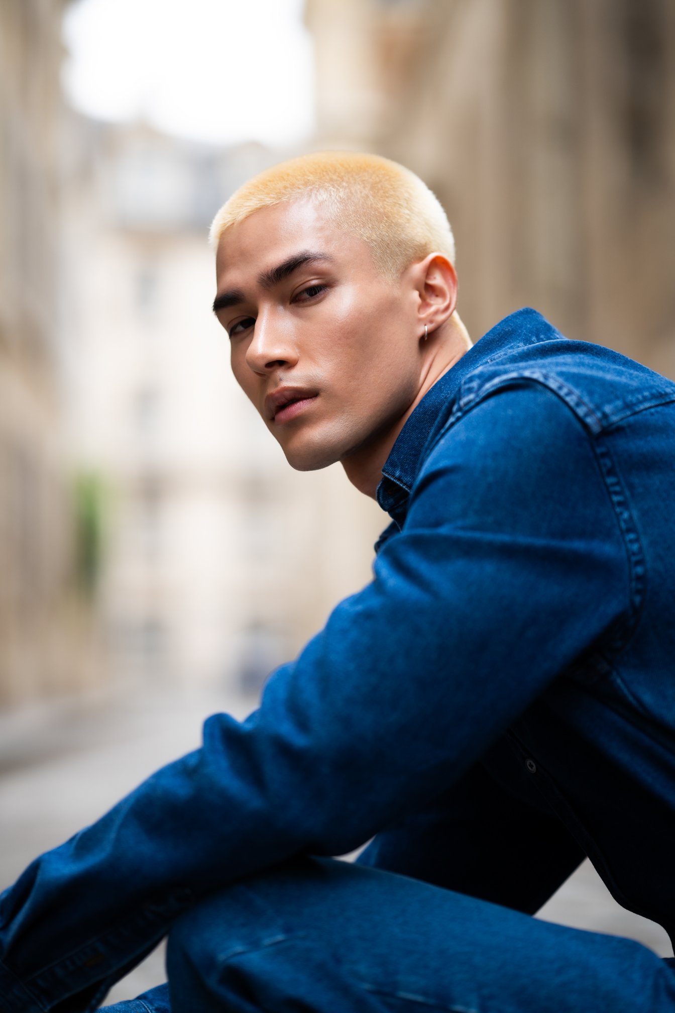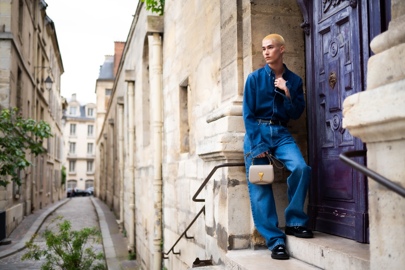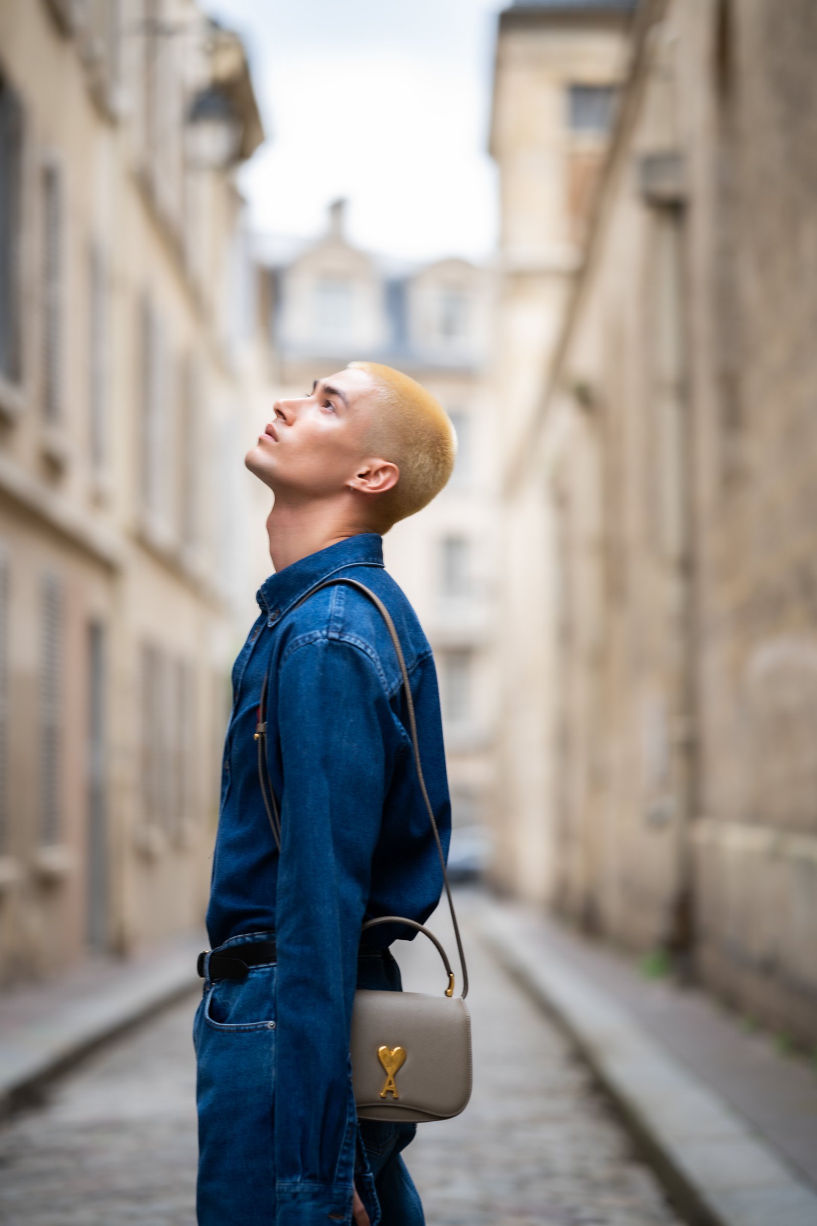 オーバーサイズのデニムシャツを、ゆったりしたデニムパンツにタックイン。カジュアルかつモード感も溢れるデニムセットアップに、黒のレザーシューズ、そしてトープの「Paris Paris バッグ」を合わせて、mikahはパリの街を歩く。mikahが醸し出す、ソリッドでありつつリラックスした雰囲気は、落ち着いたテンポとメランコリックなオルタナティブR&Bをベースにする、彼のアーティスティックなヴィジョンと直結している。