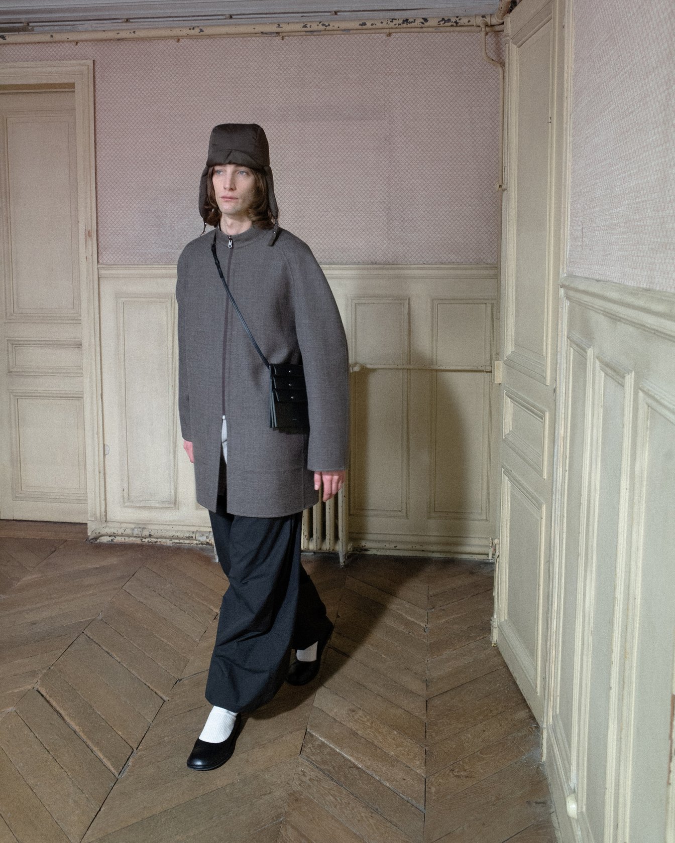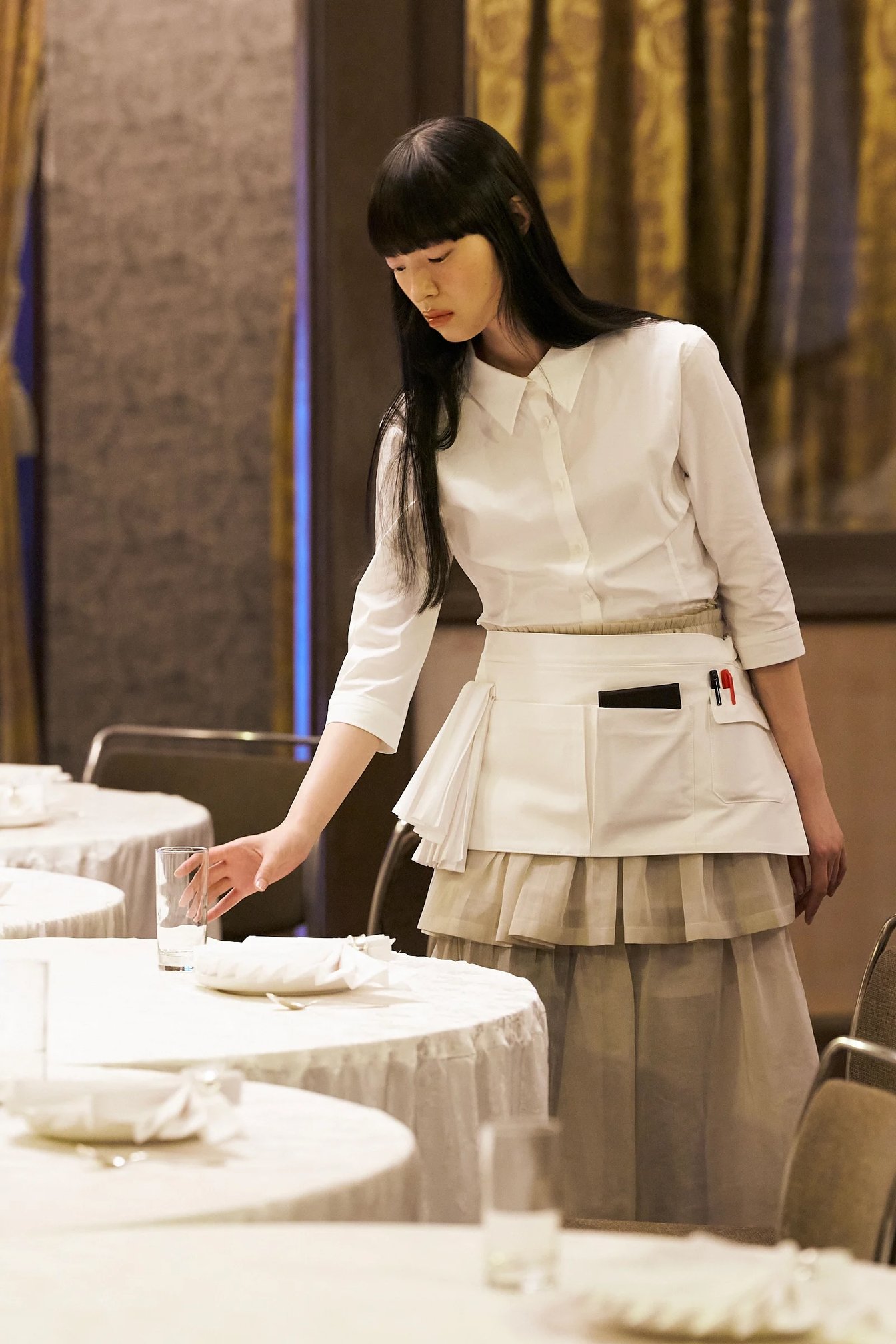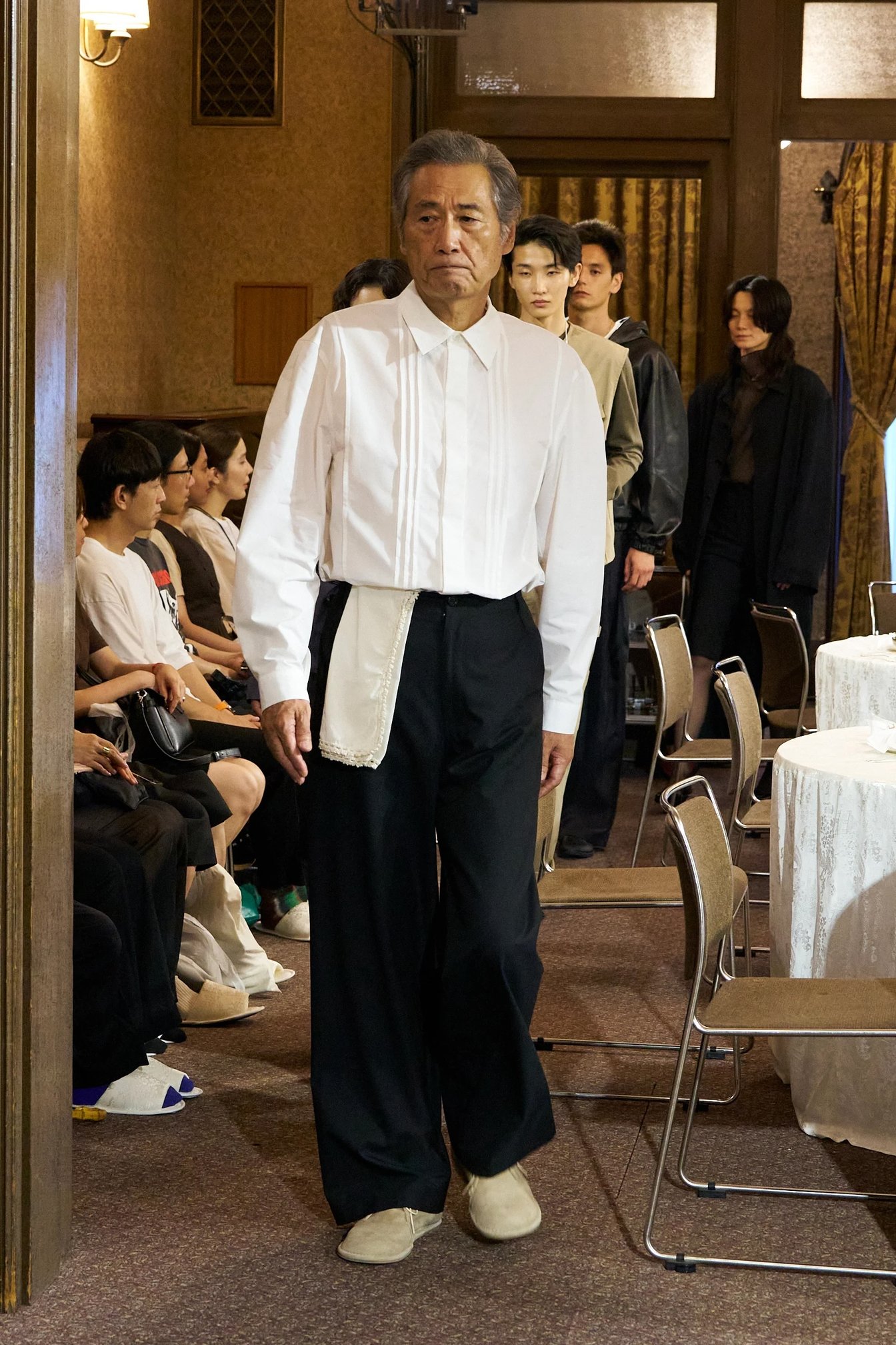 MK:プレゼンテーションは、日本の美意識が色濃く息づく和敬塾本館(旧細川侯爵邸)で行いました。喫茶店は、西洋文化を柔軟に取り入れながら、日本ならではの美意識として昇華し、現代まで受け継いできた場所。提供される飲み物や食べ物は、韓国で馴染みのあるものとは少し違っていて、最初に足を運んだときは戸惑いもありました。でも、だからこそ喫茶店という空間に流れる独特の空気や佇まいが、とても印象的で。静かで、慎ましいのに、どこか芯のある雰囲気に強く心を掴まれました。外から来た人間だからこそ面白いと感じた視点を、コレクションに落とし込みたいと思ったんです。なので、プレゼンテーションの演出は、モデルたちを喫茶店に来店する”お客さん”とウェイターに見立てて、私が日本で体験した喫茶店でのひと時をなるべく再現できるように工夫しました。