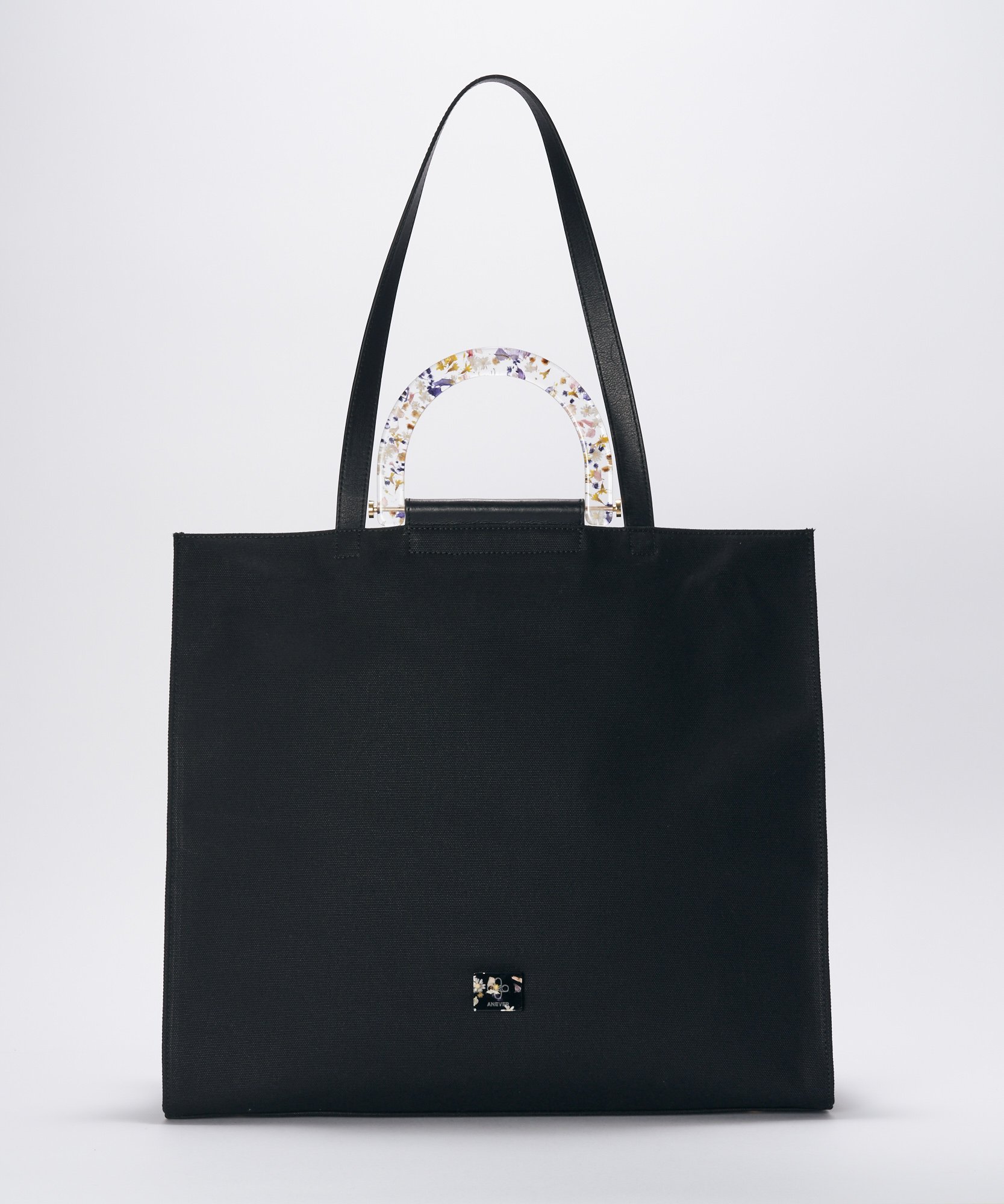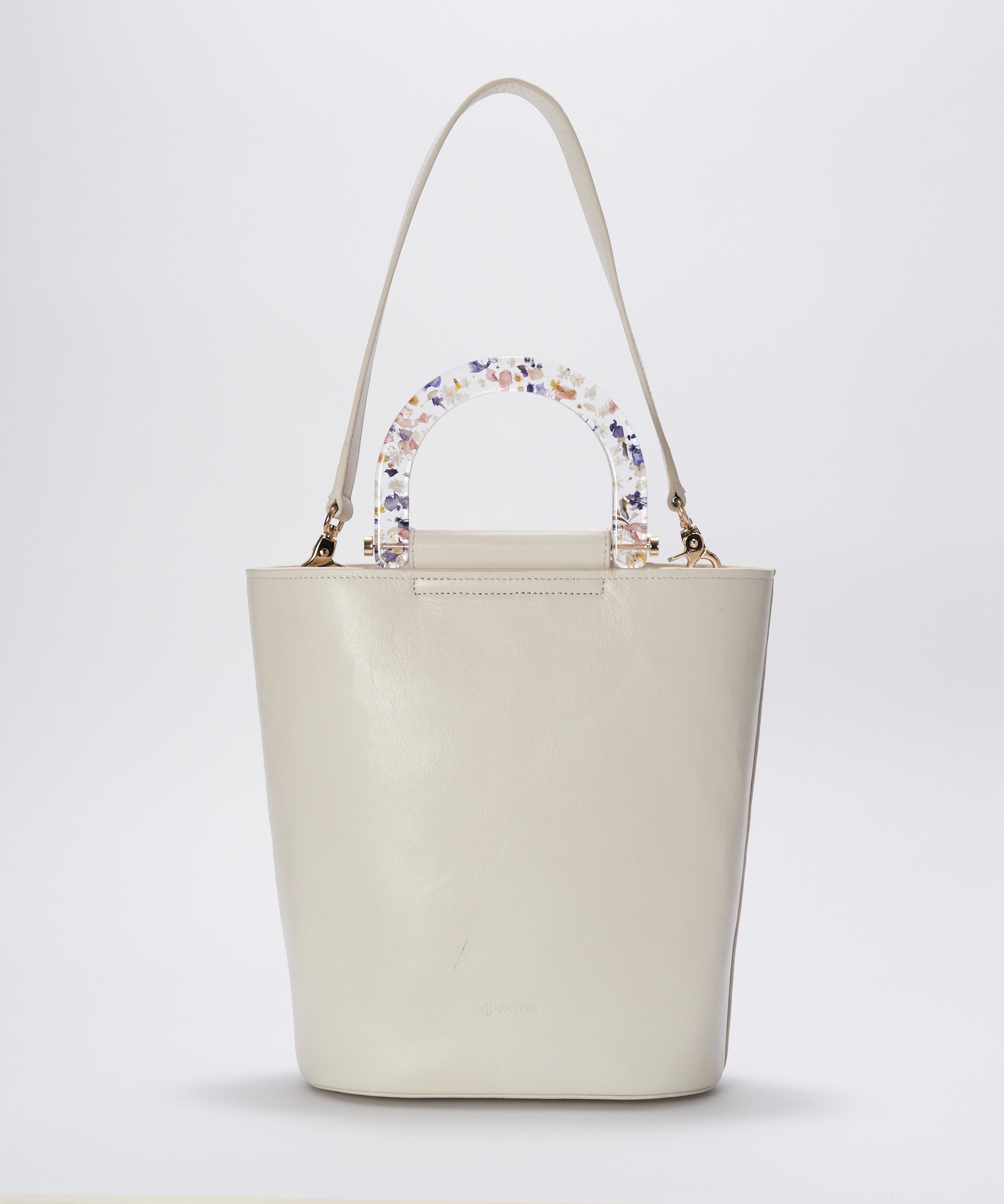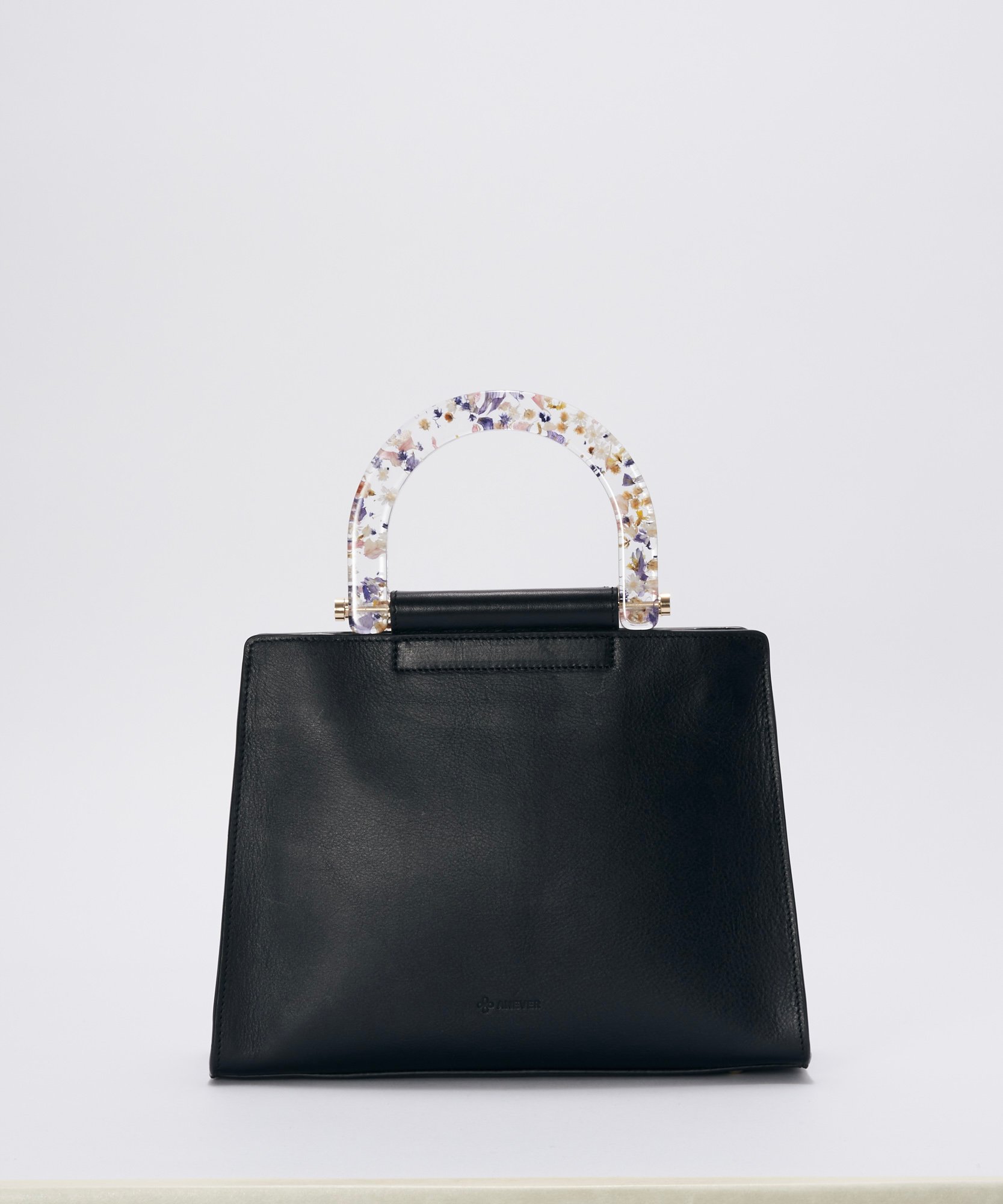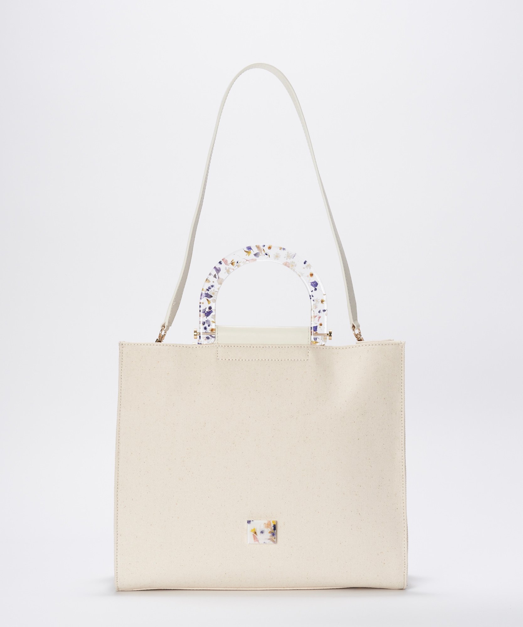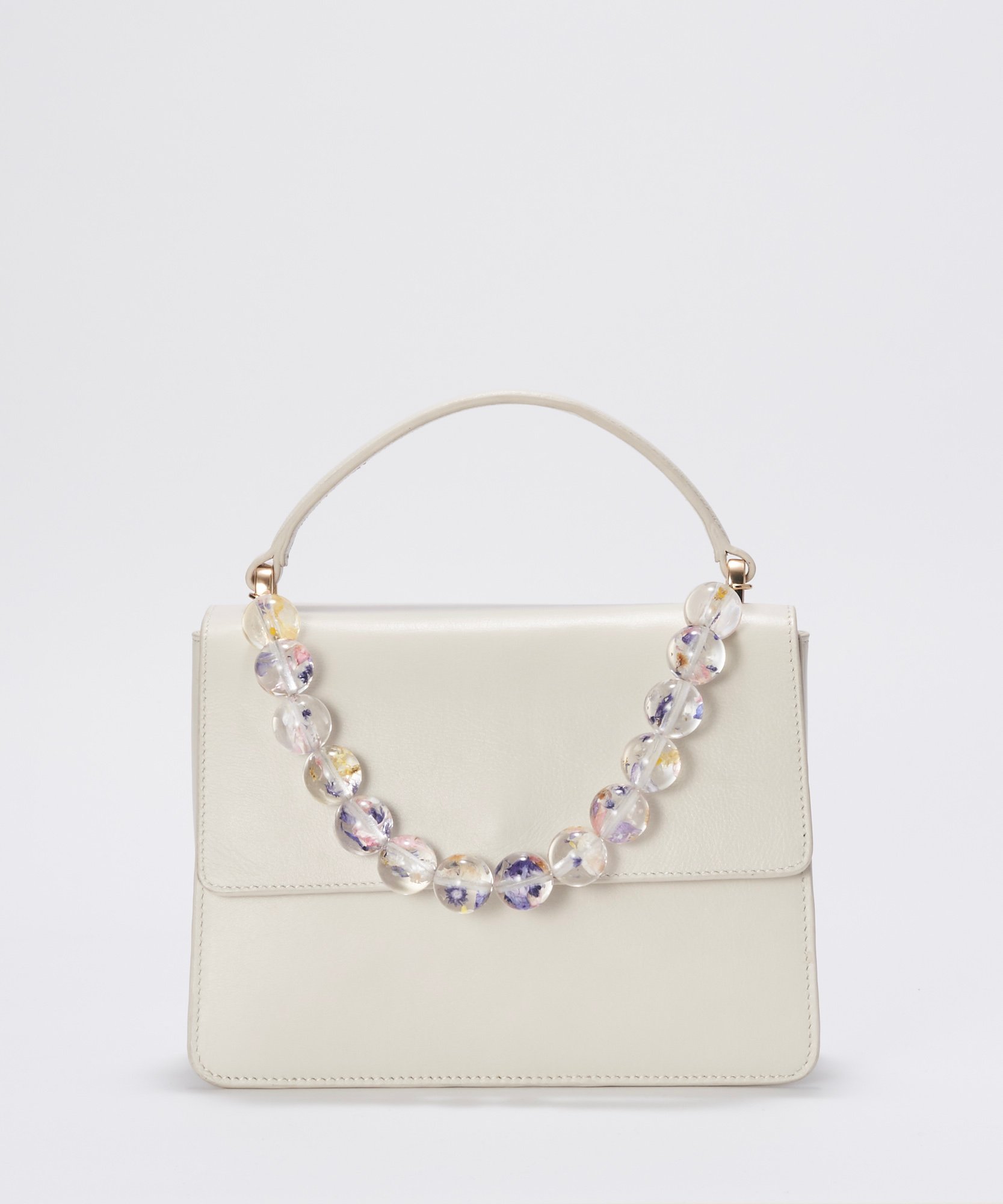 花々のアクセサリーパーツが彩るバッグは、豊富なバリエーションで展開されます。樹脂パーツをビーズ細工のようにつなげたミニバッグは、まるでジュエリーそのもの。レザーやキャンバス地のシンプルなデザインのハンドバッグやトートバッグは、樹脂製のハンドルがエレガントな輝きを添えています。