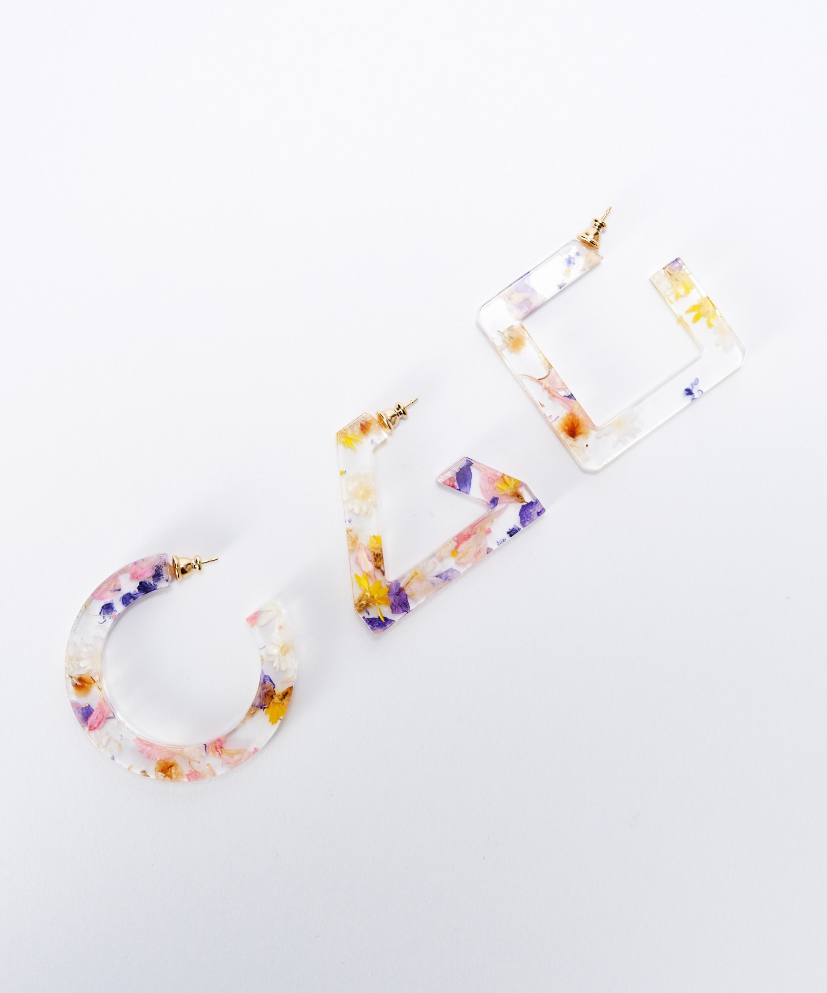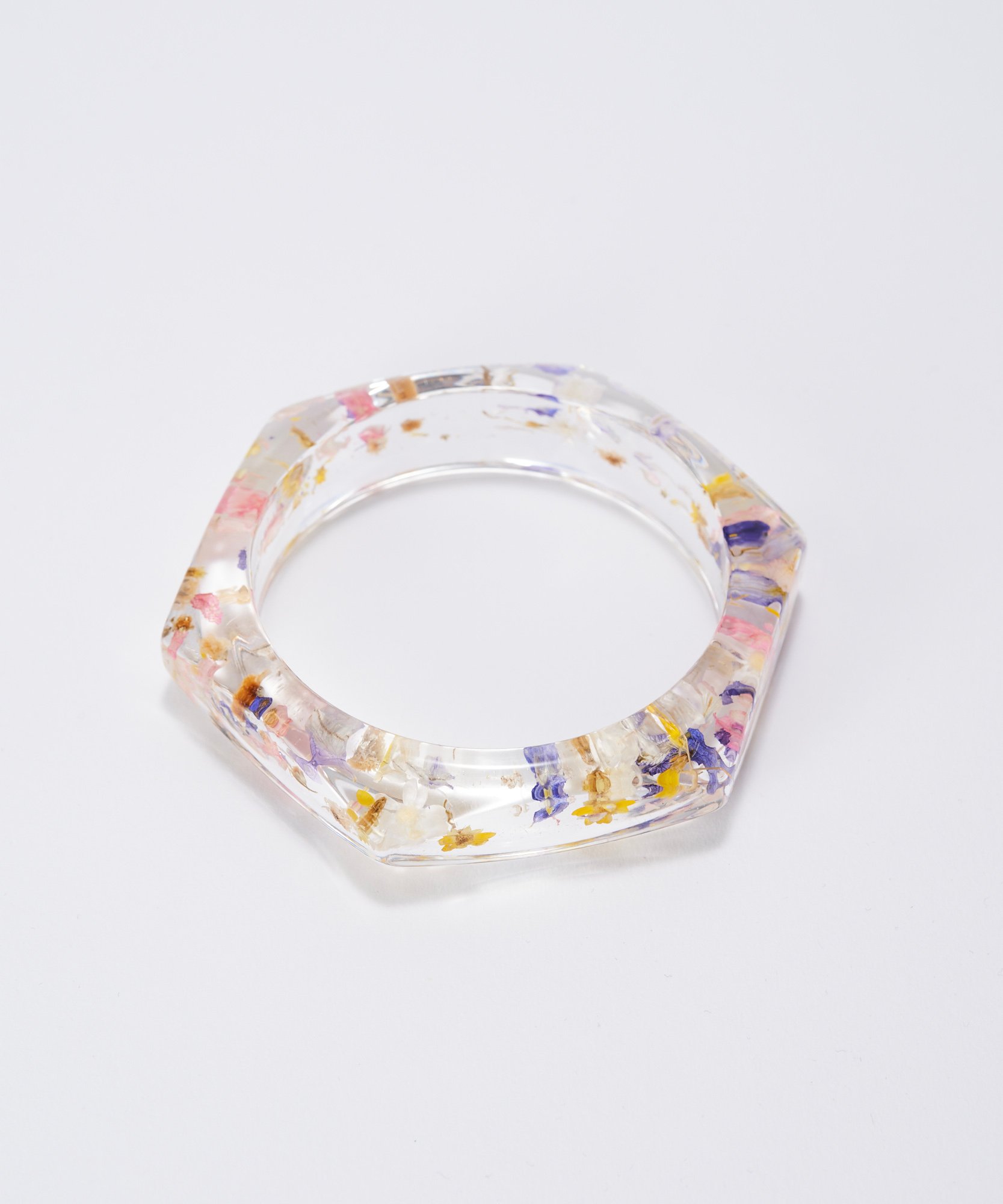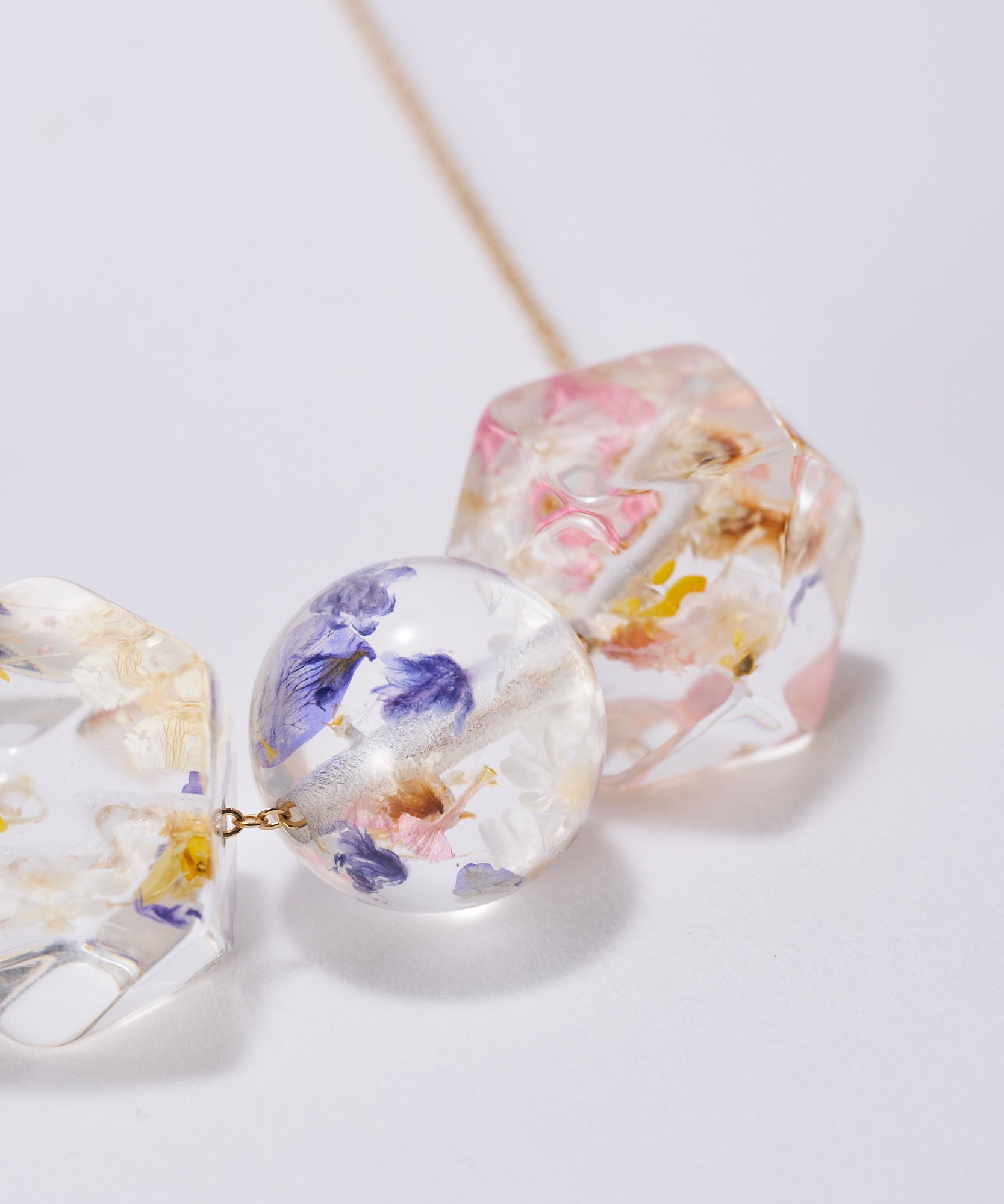 アンエバーのアクセサリーは、多角形や多面体、球体など形が特徴。しかし樹脂に閉じ込められたドライフラワーは、自然界に咲く花と同じようにひとつとして同じ形がありません。小さなパーツの中にカラフルで繊細な花々を愛でる、ネックレスやイヤリング、バングルなど。それぞれ異なる表情で、自分だけの一点物のアクセサリーとして楽しむことができます。