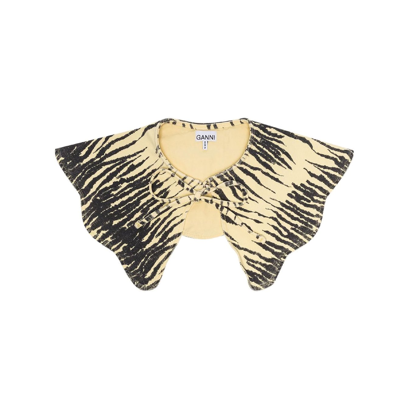 トレンド小物もアニマルパターンをピックアップ。タイガープリンのデニム生地で作られた「ガニー(GANNI)」の個性派ビッグカラー。パンチが効いたスパイスで首もとをアレンジして。