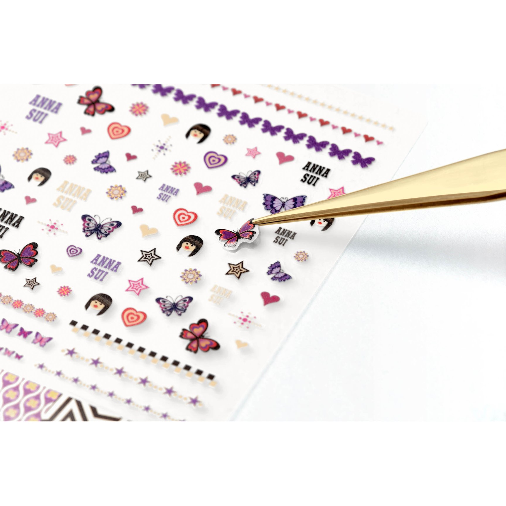 自由にデコレーションしてネイルアートを楽しめるネイルシール。お気に入りのモチーフをセレクトしたり、ラインやシート状のタイプを自由にカットしたりして好きな所に貼るだけで、オリジナリティあふれる指先が叶います。デザイナー アナ・スイが大好きなバラや蝶、ファッションのテキスタイルからインスパイアされた幾何学模様のモチーフのほか、アナ・スイ自身も登場します。