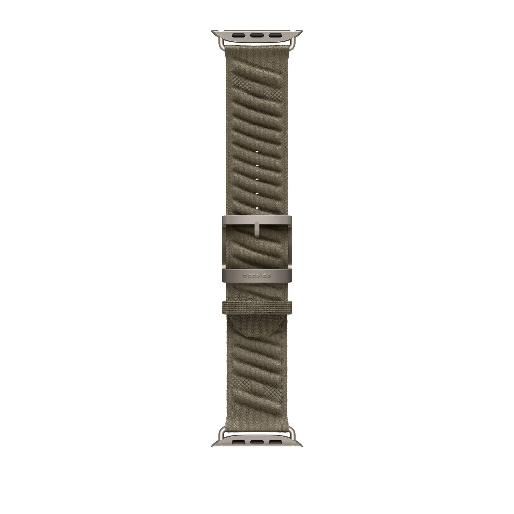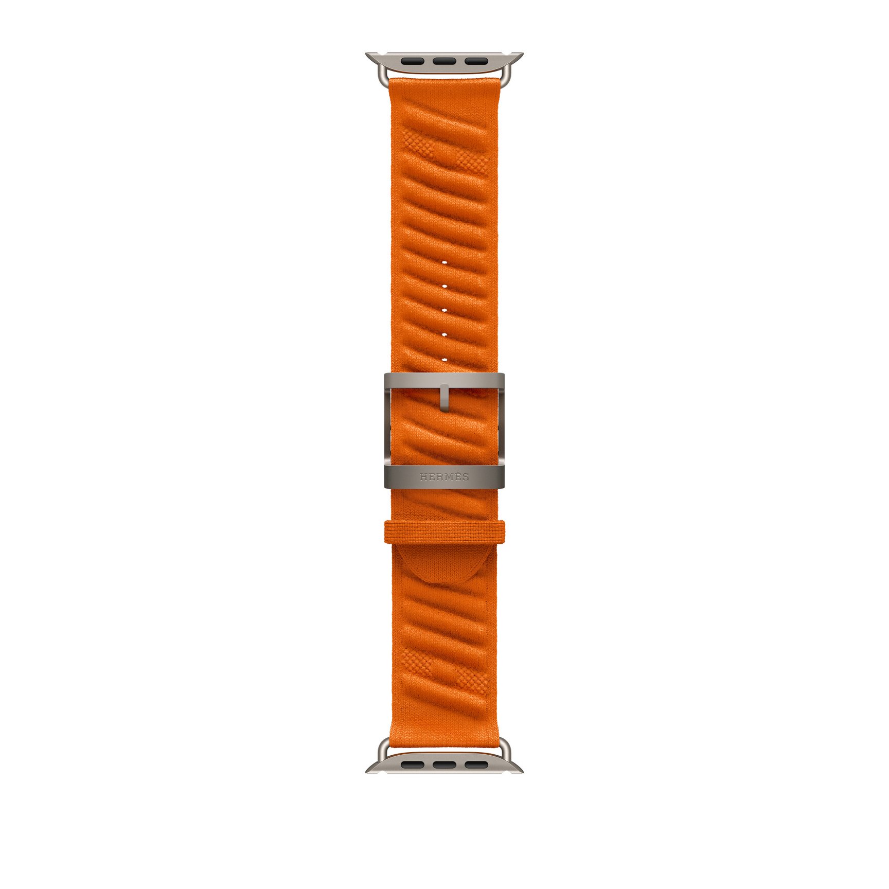 日常生活、スポーツ、そして冒険時と幅広いシーンを想定した究極のApple Watch Ultra 3をベースにしたApple Watch Hermès Ultra 3のラインナップの構成はシンプルで、昨年初のApple Watch Hermès Ultraのストラップとして採用されたアンメールはしっかり装着できるチタニウム製バックルを備えた。耐水性能を持つこのストラップは、あらゆる種類のウォータースポーツや冒険に適したストラップで、特徴的な立体ストライプと、さりげない「H」のモチーフが魅力だ。昨年は深い青色のブルー・ニュイ1色のみの展開だったが、今年はここにオレンジとグリ・チタン(深い緑色)が加わった。