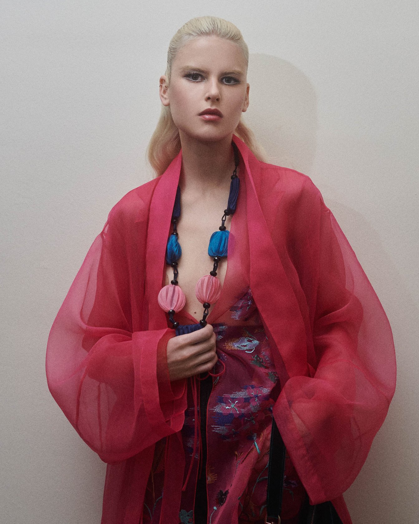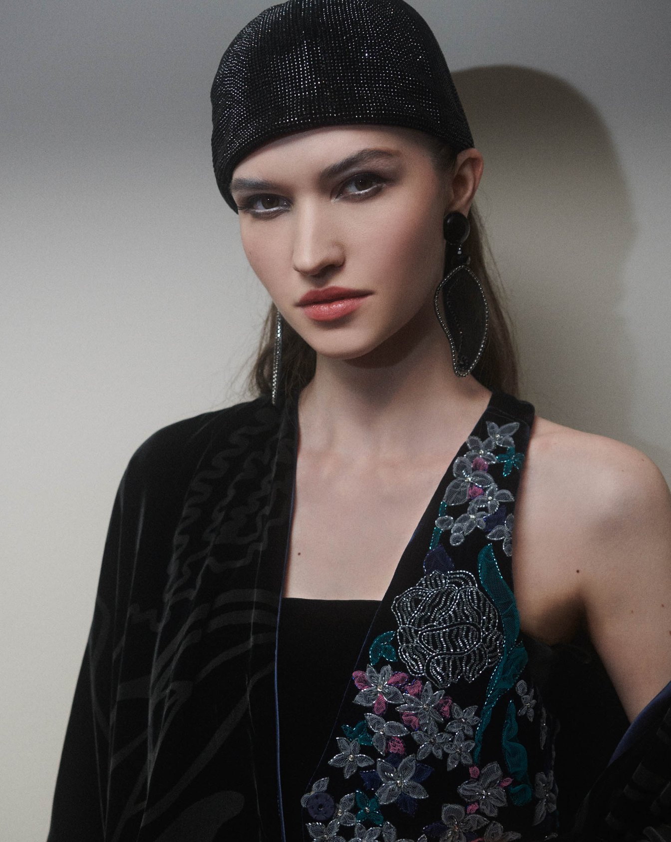 自然のパワーやエネルギーが地球の生命サイクルと絡み合い、優美で希望に満ちたメッセージを届けるコレクション。真冬にも咲く花々は美と再生を告げるかのようにコレクションを彩り、エアリーで流れるようなフォルムとともにジョルジオ アルマーニが常に大切にしてきた調和がとれたエレガンスが表現されている。