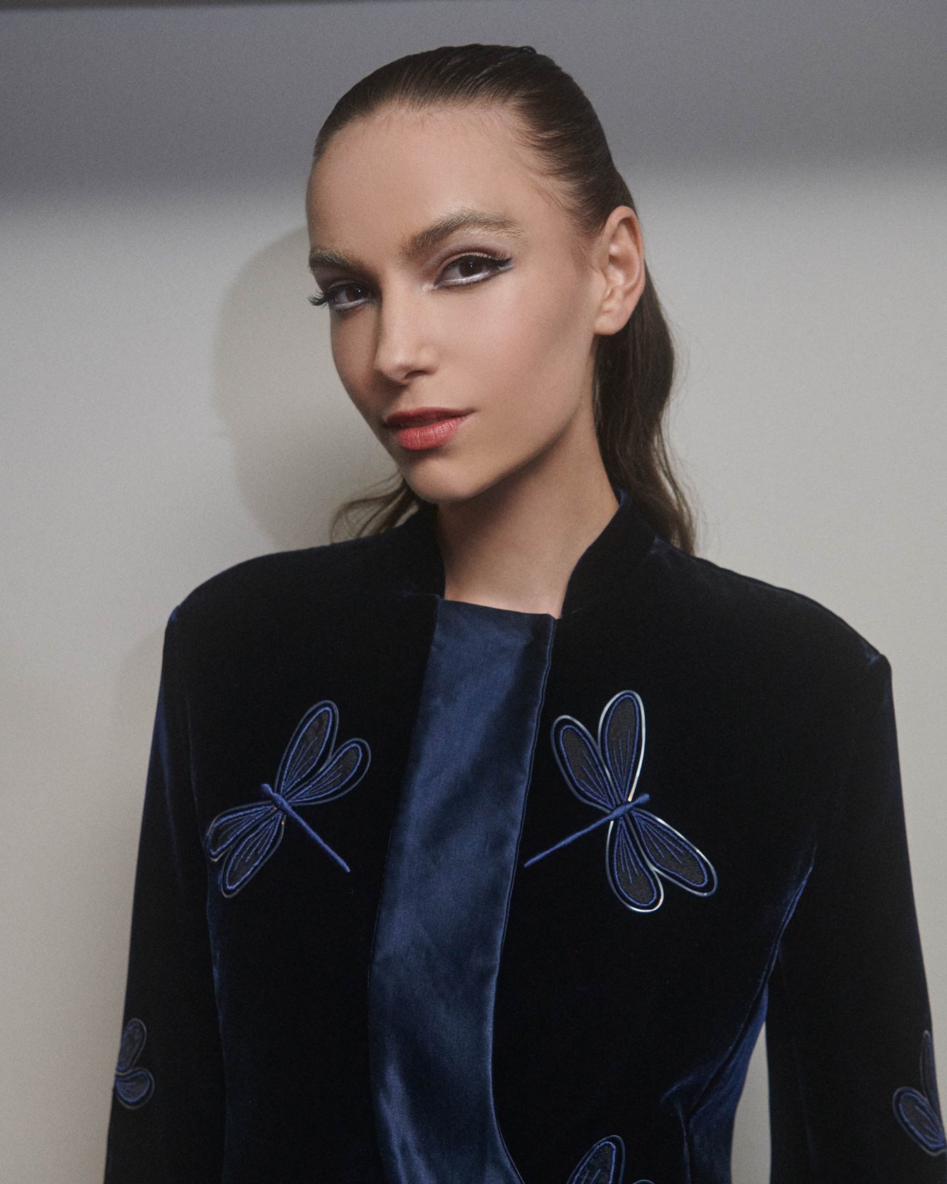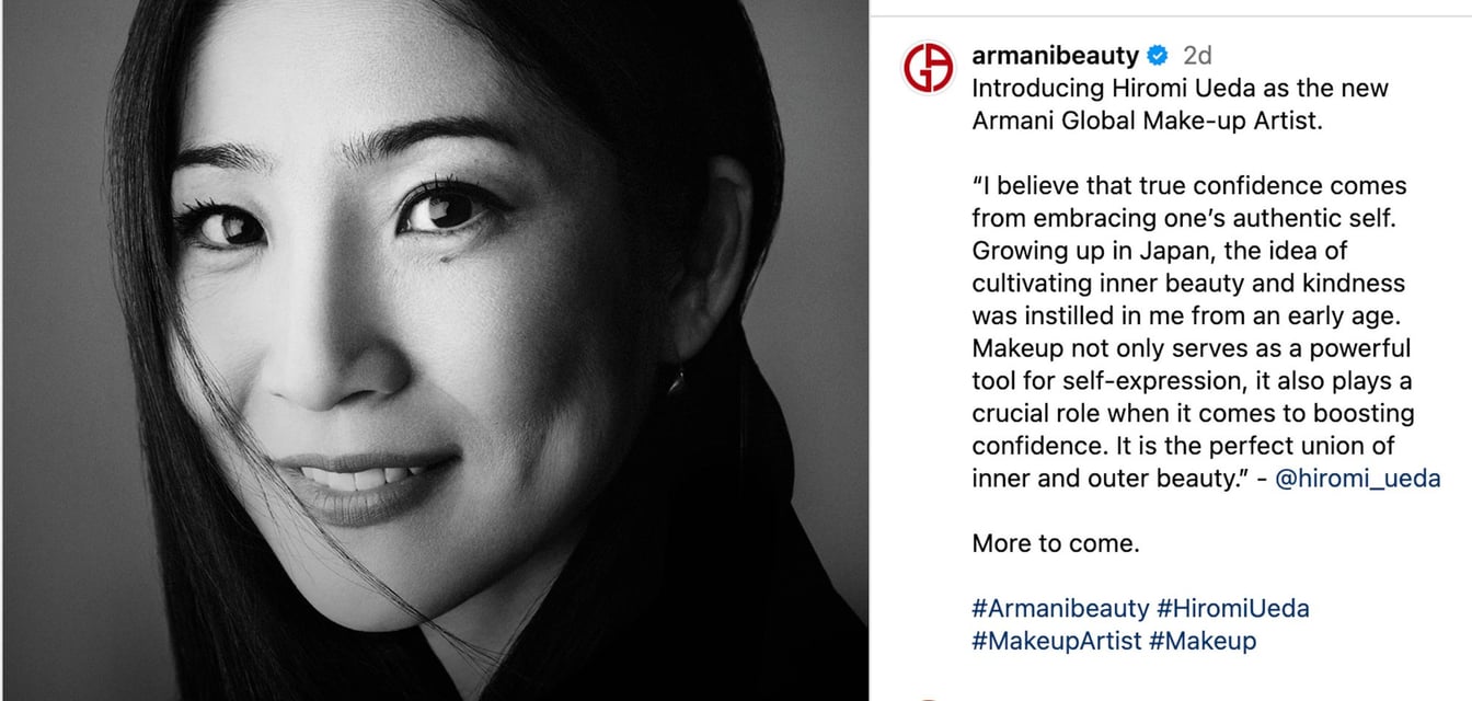 「2023年7月からコレクションでゲストメイクアップアーティストとしてランウェイのメイクを担当させていただきました。前々回のプリヴェが私にとって初めてアルマーニ氏と共に取り組むプロジェクトでした。その中で彼の堅実な美意識と卓越したリーダーシップを目の当たりにし、彼のような方と一緒に仕事をすることをさらに望むようになりました。今回、このような重要な役職に就けたことに感謝し、やる気に満ちた気持ちでいます。また、アルマーニ ウーマンの象徴とは周りの人々に強い影響力を持つ凛とした人間性を備えた女性だと信じています」