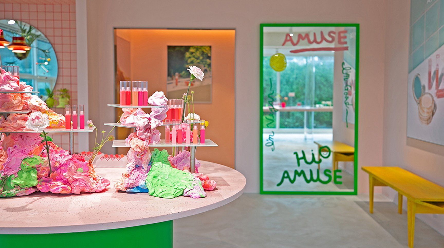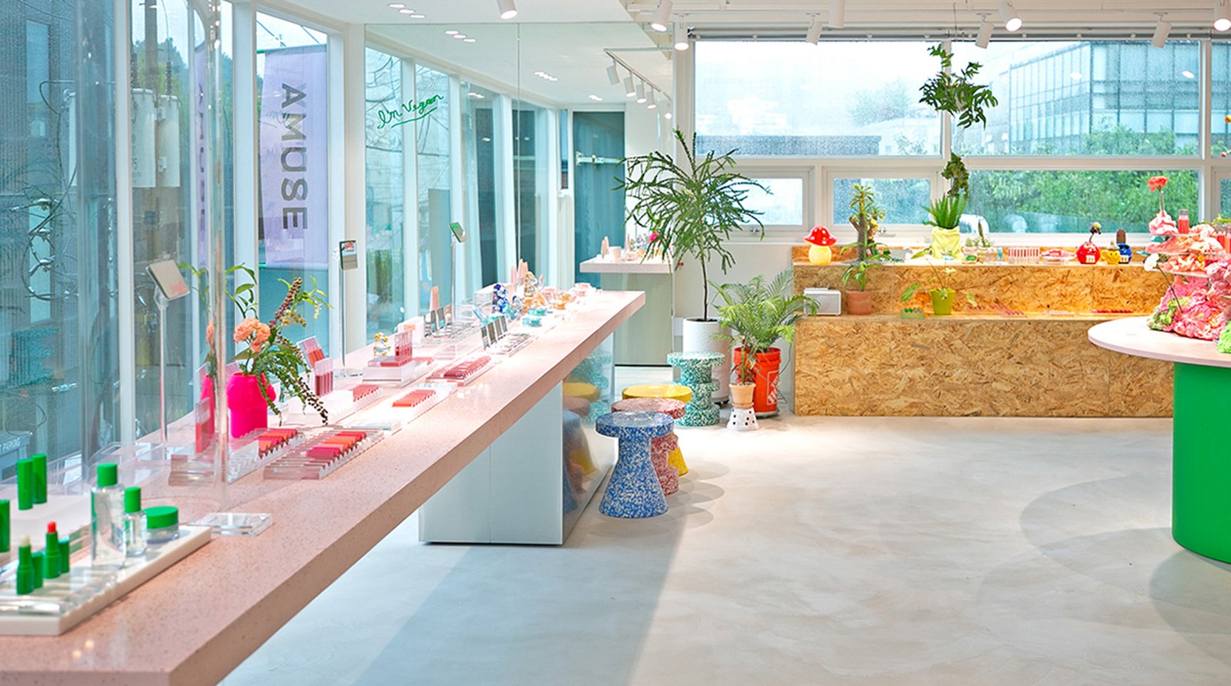 韓国のコスメショップはコスメだけでなく、まるで美術館のような、おしゃれ空間も楽しみの一つ。コスメブランド「アミューズ(AMUSE)」は7月、ソウルのおしゃれタウン・ハンナムにショールームをオープン。明るくポップな空間は、どこを切り取っても可愛さ満点!さらにここでしか買えない「シューベルベット ティント」の限定色を販売。韓国コスメマニアなら見逃せない場所です。