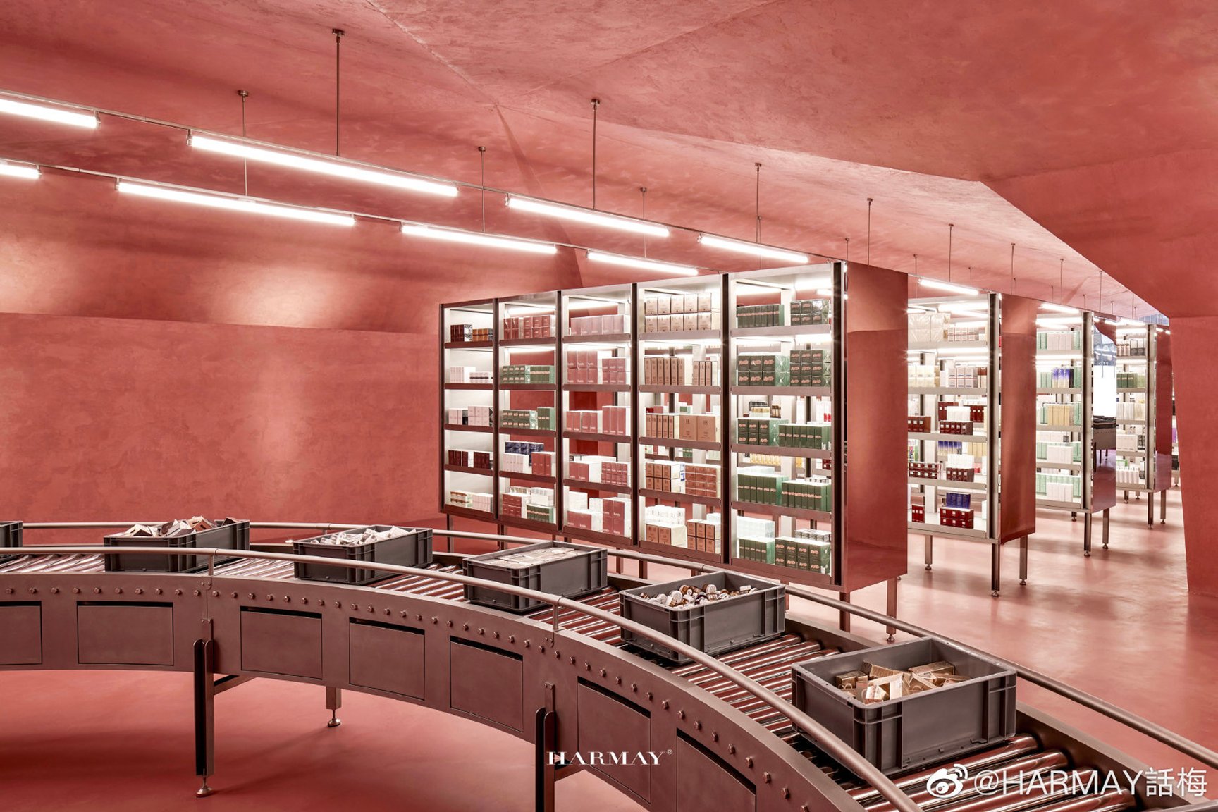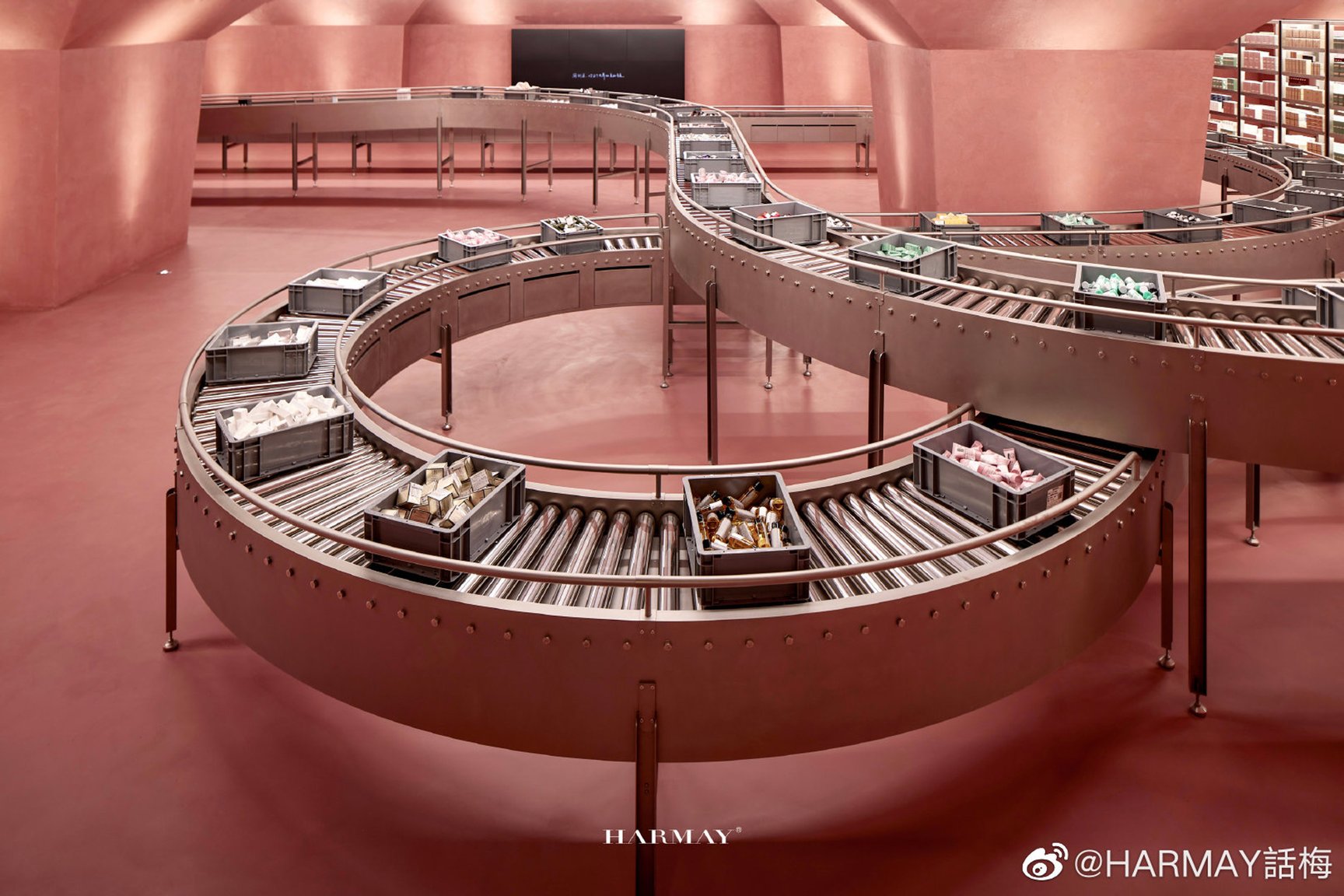 倉庫スタイルのコスメの集合店「HARMAY(話梅)」は世界のコスメを取り揃えた圧倒的な品揃えに加え、店舗によって異なる内装も話題に。4月にオープンした武漢店は歴史ある建物の中に近未来的なインテリアを融合させたユニークな店舗に。重慶の店舗はピンクを基調に、工場を思わせるベルトコンベヤー、作業台などを配置しています。