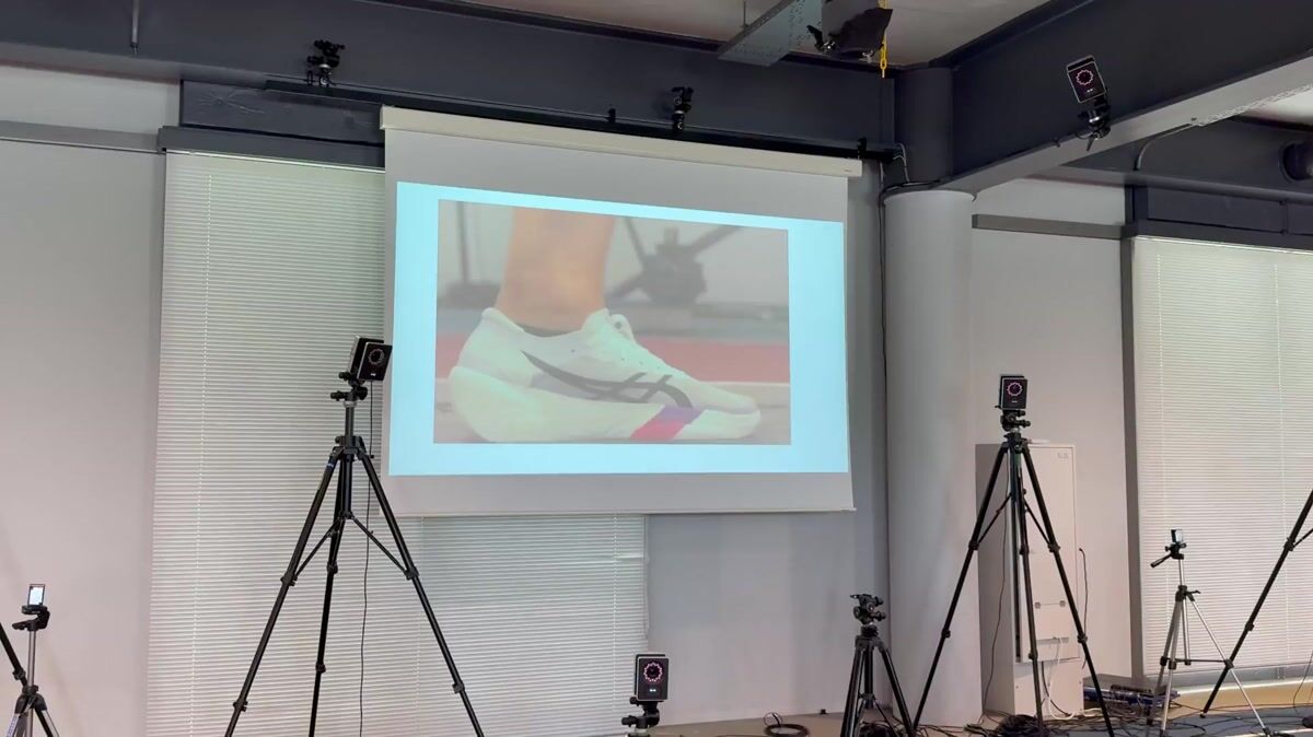 計測位置には、「モーションキャプチャー」と呼ばれる計測専用のカメラを24台配置。被験者であるアスリートが、シューズを含む全身に数十個のマーカーを付けて走ることで、カメラで動きを追跡し、走行時の姿勢や関節の角度、シューズの状態を確認することができます。モーションキャプチャーだけではなく、スローのハイスピードカメラの映像と組み合わせることで、より細かなフォームのチェックを可能にしているんだとか。