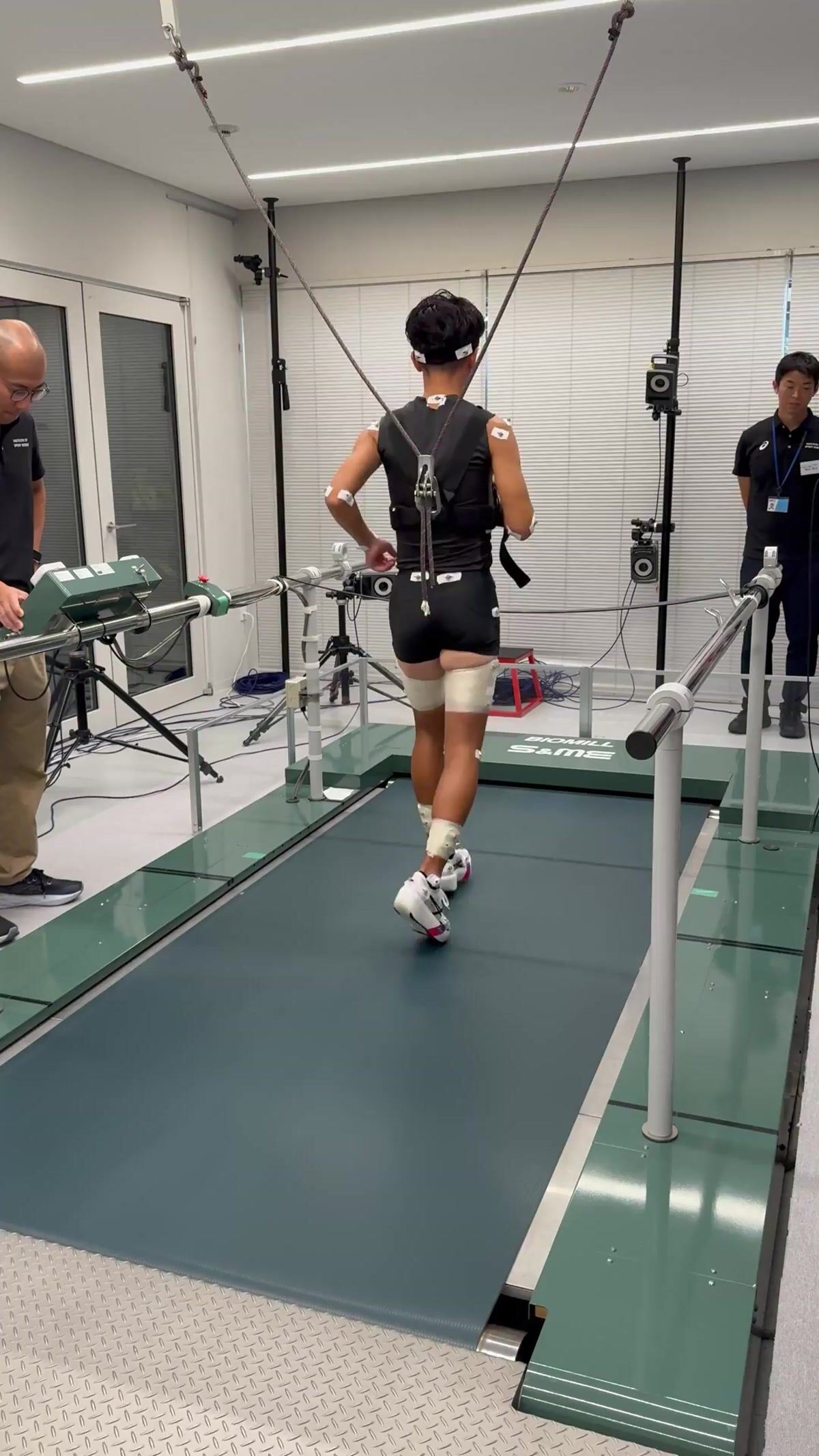 山登りのコースとして知られる箱根の5区をイメージした傾斜6%での走行シミュレーション。トレッドミルでの走行は、安全確保のためハーネスを着用します。 Video by FASHIONSNAP