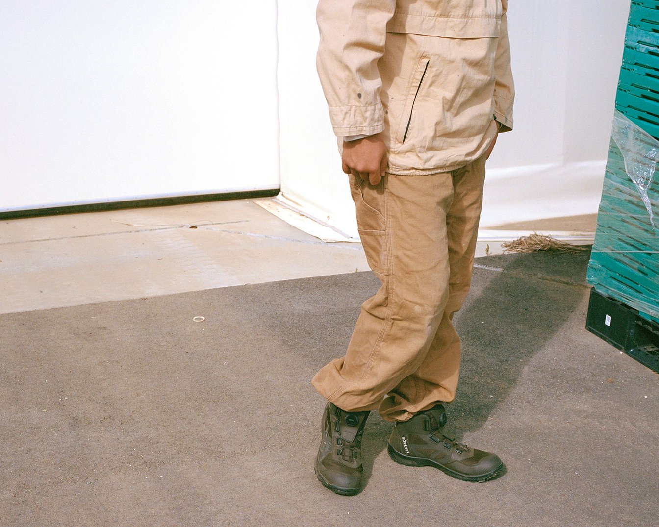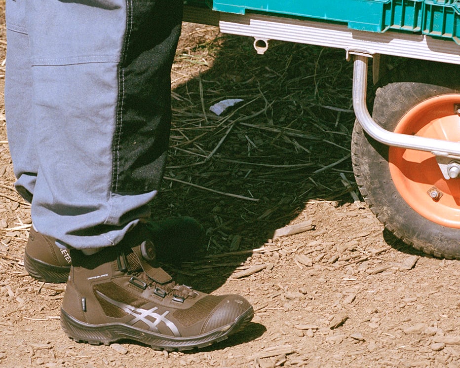今回、撮影で初めてアシックス ワーキングシューズ の「ウィンジョブ® CP604 G-TX BOA® 」を着用したという工藤さん。着替えをすませ、ロケバスから出るやいないや「軽い!」とつま先の安全プレートの存在を感じさせない履き心地に驚きを隠せない様子。撮影後、改めて着用感について尋ねると「丸一日着用してみて、軽さと高いグリップ力による動きやすさ、足をしっかりホールドするフィット感を実感しました」と振り返ります。ゴアテックスファブリクスを搭載し防水性に優れているため、雨天や泥だらけの作業環境でも快適に使用できるほか、洗いやすく長持ちする点も魅力です。つまずきにくいトゥアップ設計にも着目し「機能的でありながらデザイン性も兼ね備えている作業靴は多くの農家が望んでいることだと思います」と語ります。