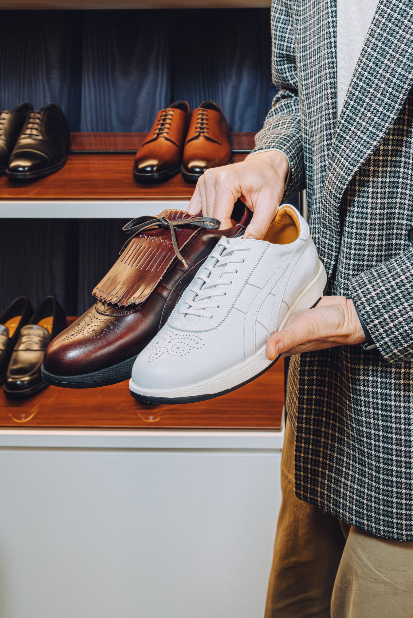 また、飾り穴やキルト飾りといったクラシックな革靴のディテールを取り入れながら、ブランドを象徴するアシックスストライプを配したスニーカーは、これまでにない新しい提案として好反応を得ました。スニーカーブームに続く流れとしてレザーシューズへの回帰が進む中で、アシックスならではのスポーツテクノロジーと伝統的な意匠を掛け合わせたこのアプローチに、大きな可能性を感じています。