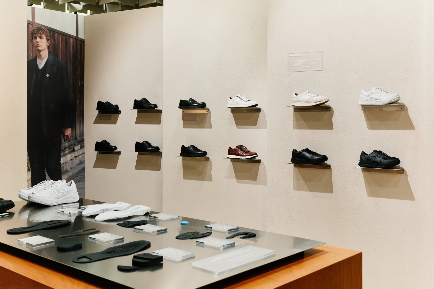 鈴木:理由はシンプルで、海外を起点としたメンズファッションの文脈で情報発信をしようと考えた際、注目が集まるのがピッティだったからです。ピッティがシーズン毎に設定するテーマやメンズファッションの潮流に合わせて、ドレスシューズからカジュアルなレザースニーカー、アクティブなシーンに向けたスポーツウォーキングシューズまで、アシックスウォーキングのデザインラインナップを全方位で見せると同時に、強みであるテクノロジーを前面に打ち出すべく「分解パーツ」を用いた展示を行いました。