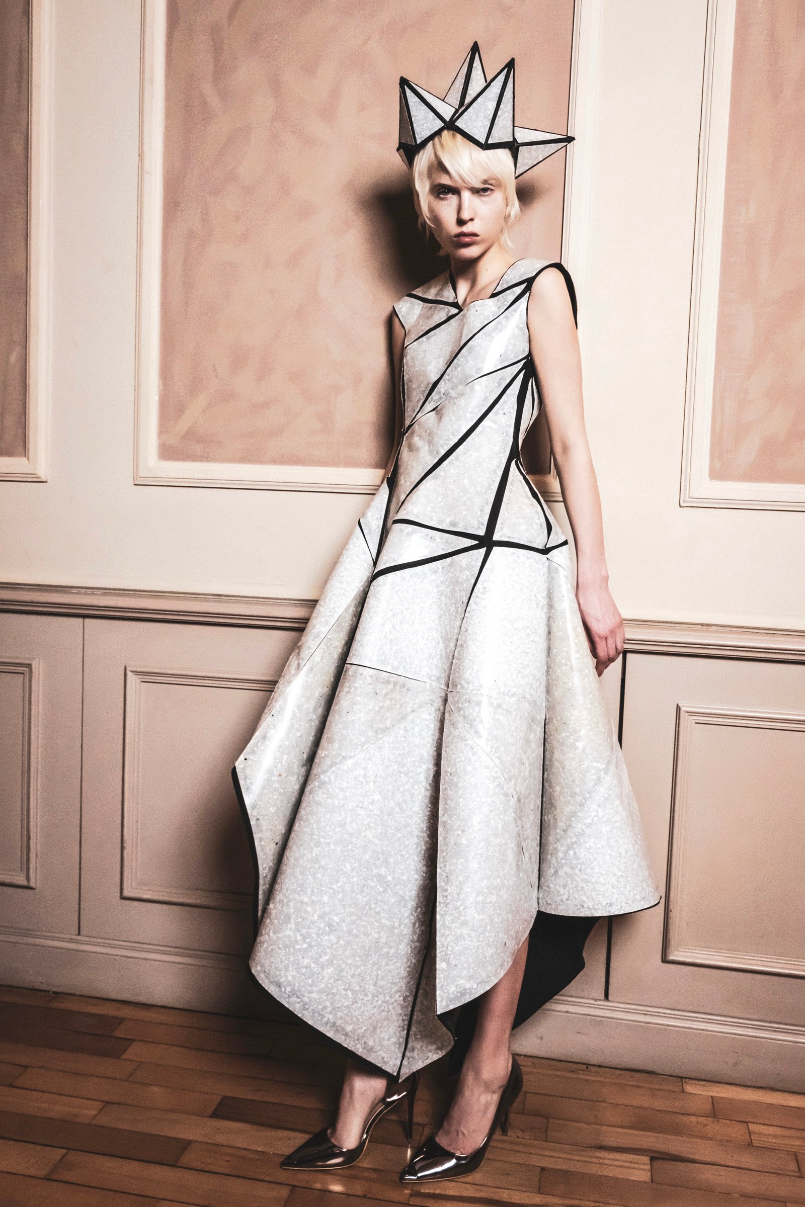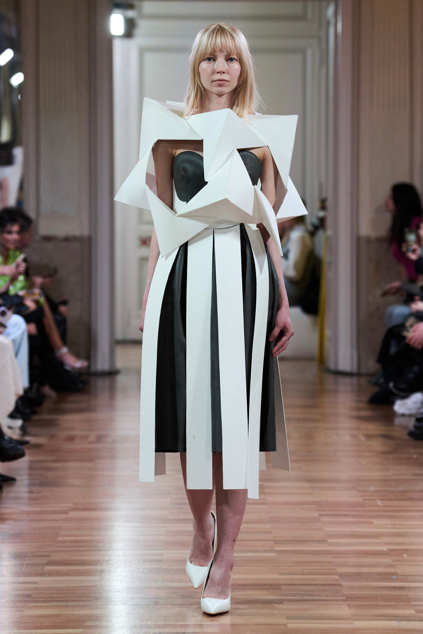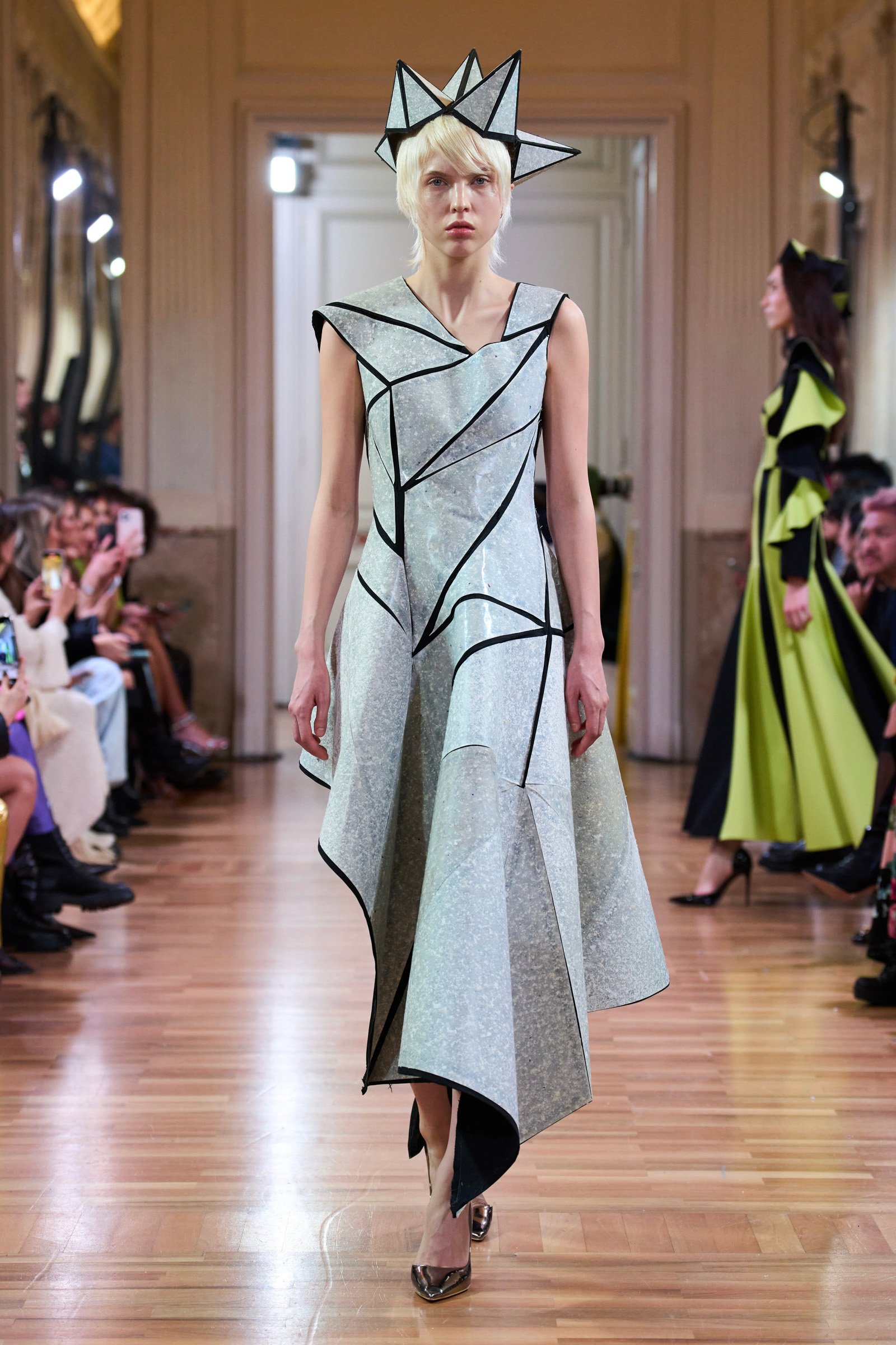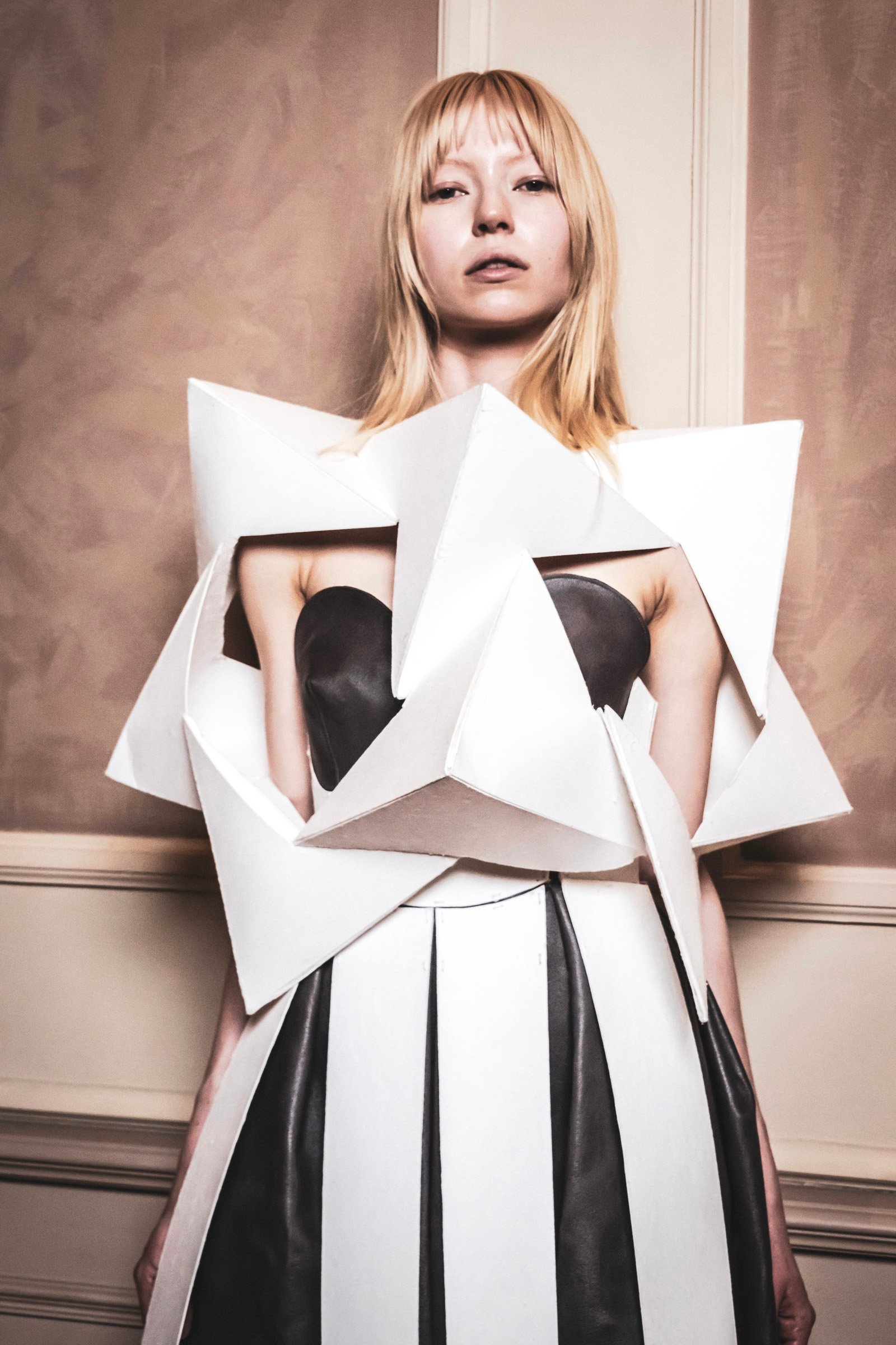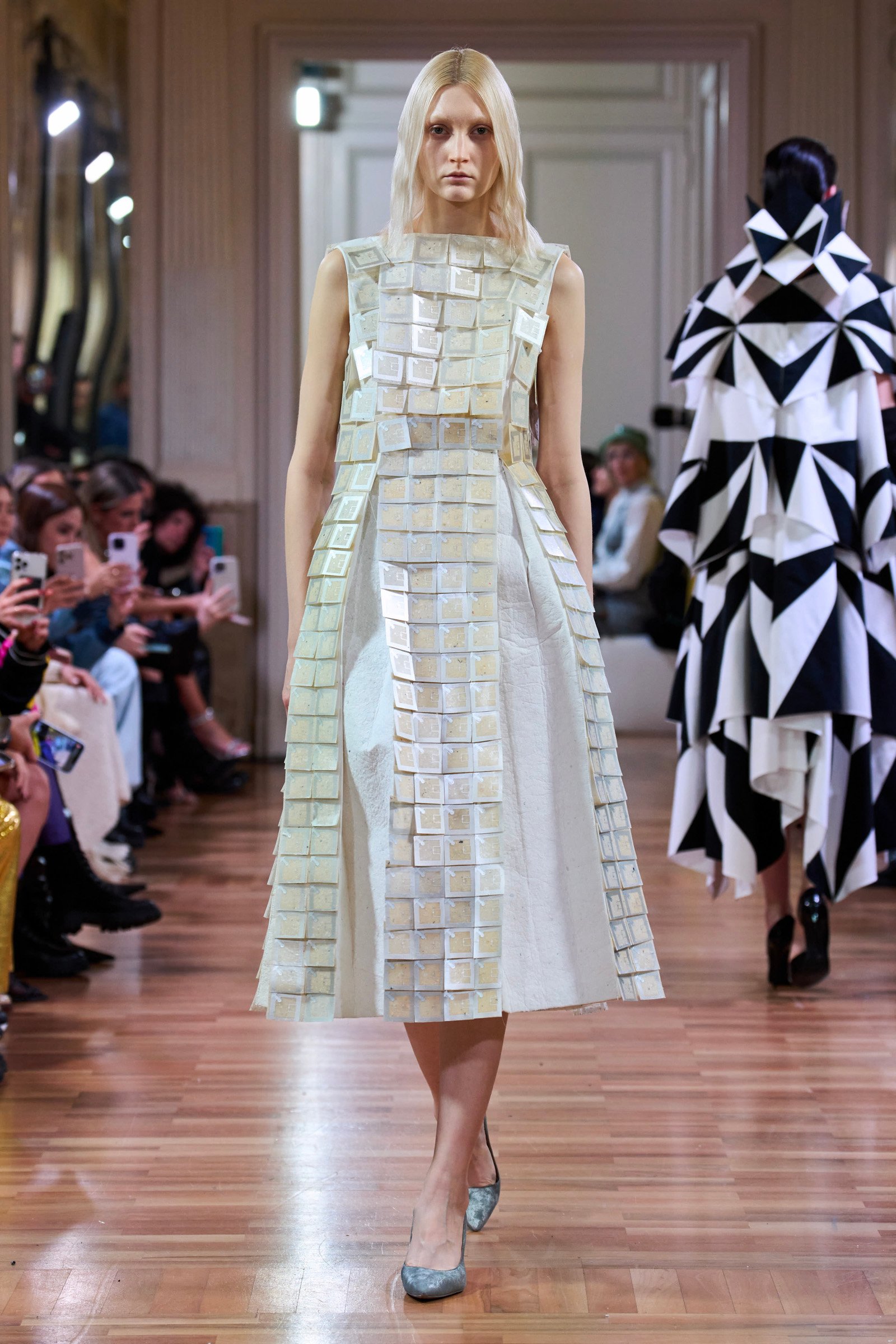 デザインは、アツシ ナカシマのアイデンティティでもある幾何学模様とシンメトリーを中心に構成。「PANECO®」で作られたボディスーツや、白濁したような風合いの「PlaX」を用いたティアードドレスやトレンチワンピ、NFCチップのマークをあしらったドレス、ビニールとガムテープで作られた黒のドレス、円錐のようなフォルムの紙で作ったアートピース、型紙を縫い合わせたような幾何学フォルムのドレスなど披露した。