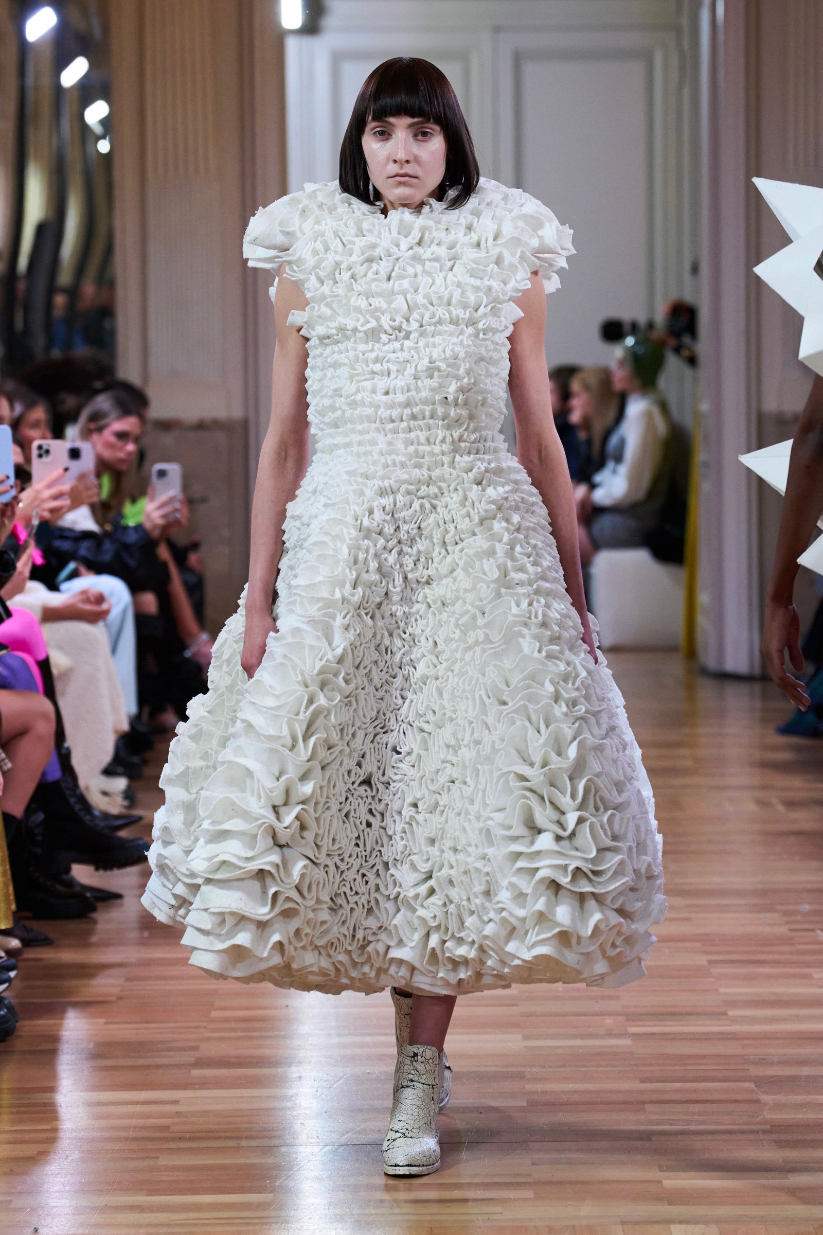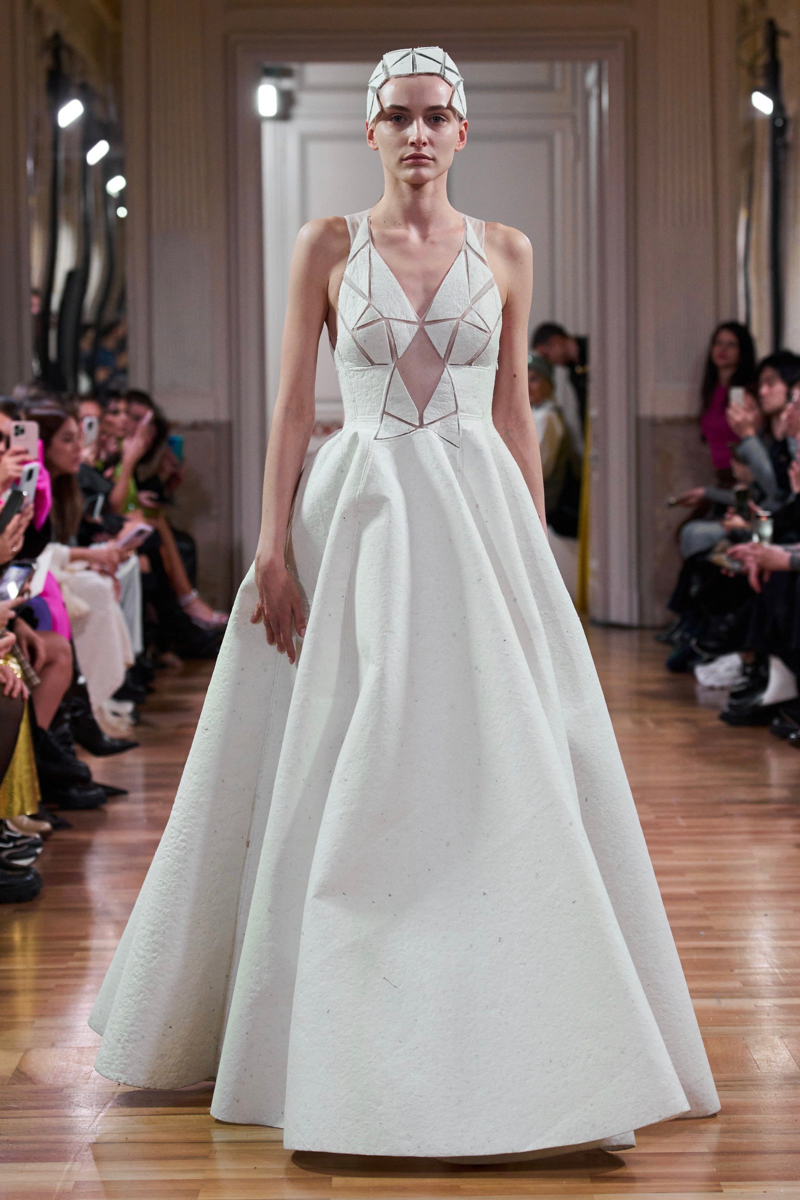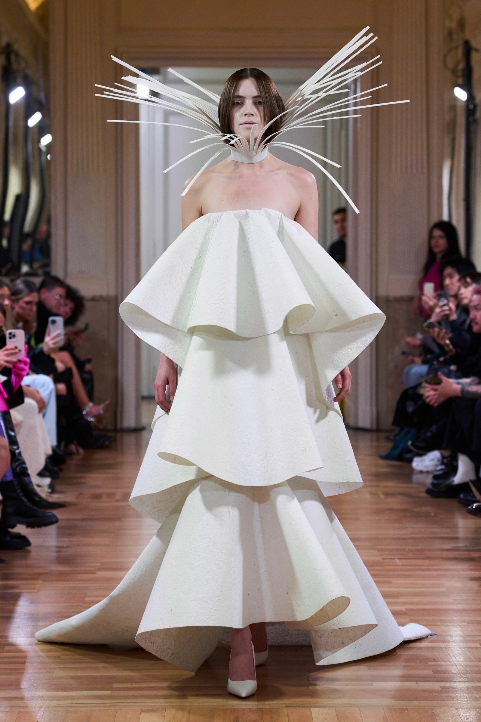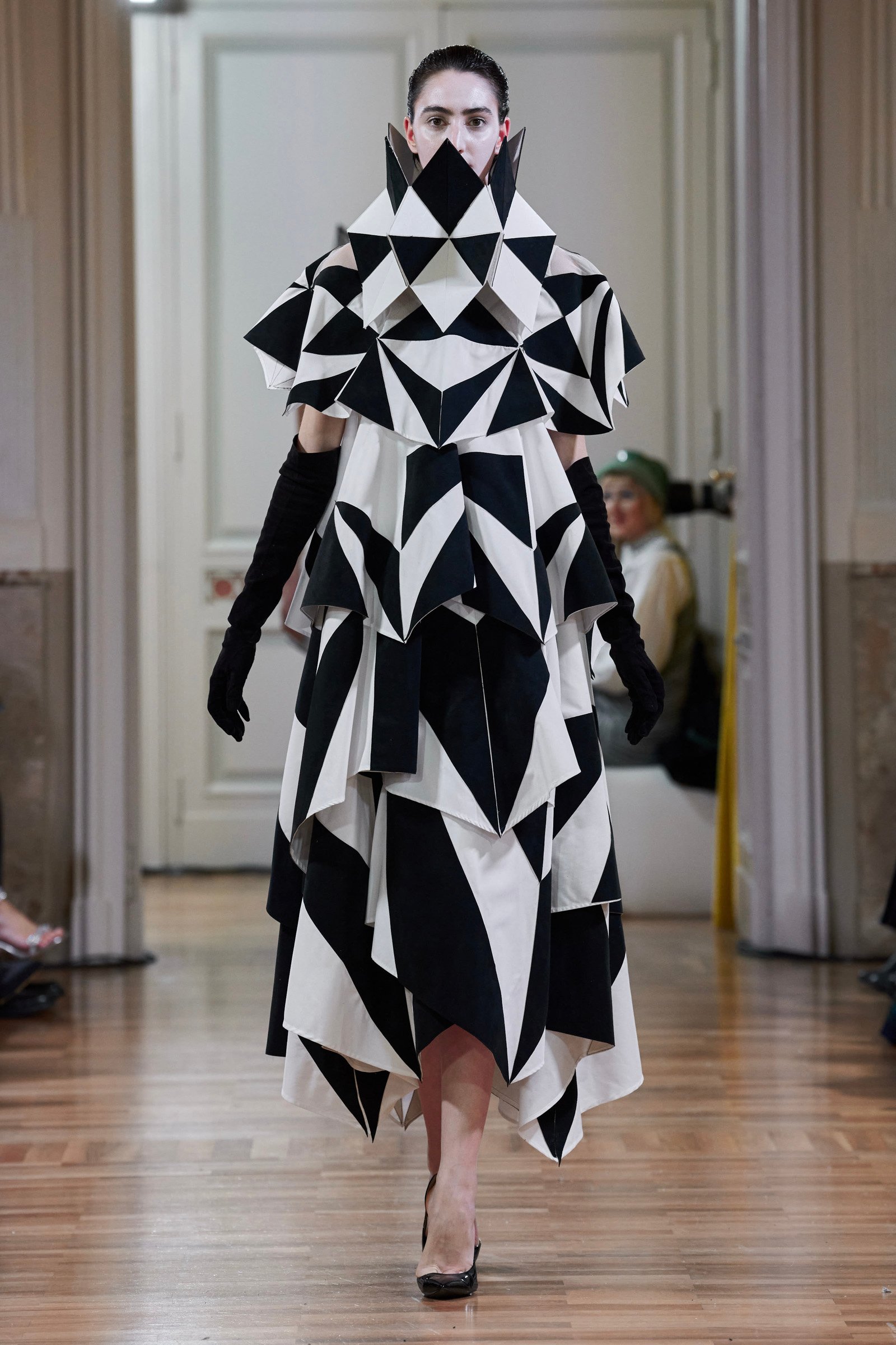 デザインは、アツシ ナカシマのアイデンティティでもある幾何学模様とシンメトリーを中心に構成。「PANECO®」で作られたボディスーツや、白濁したような風合いの「PlaX」を用いたティアードドレスやトレンチワンピ、NFCチップのマークをあしらったドレス、ビニールとガムテープで作られた黒のドレス、円錐のようなフォルムの紙で作ったアートピース、型紙を縫い合わせたような幾何学フォルムのドレスなど披露した。