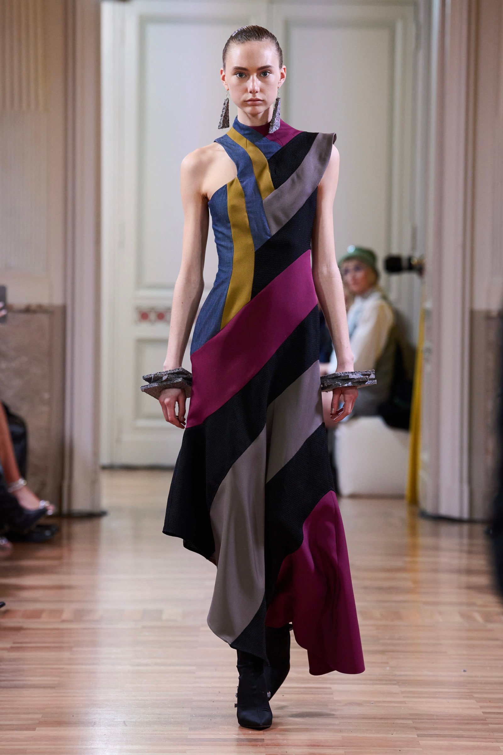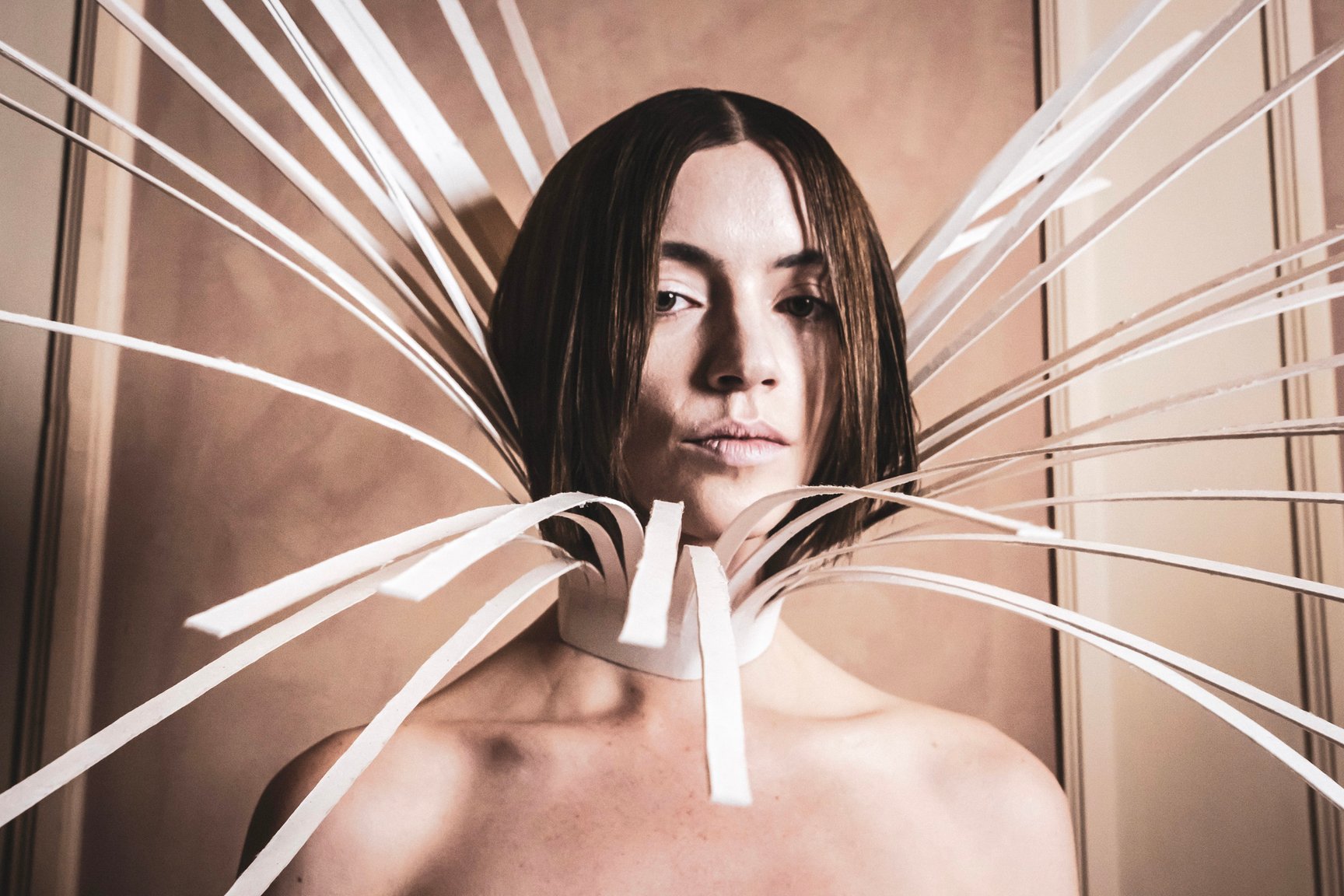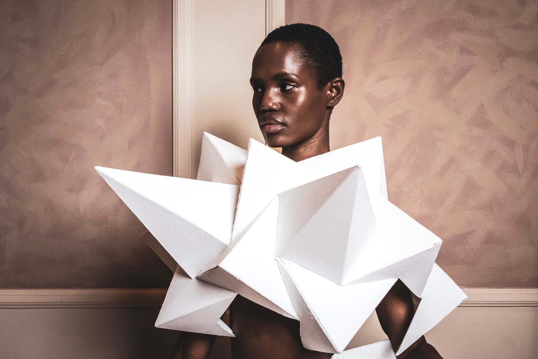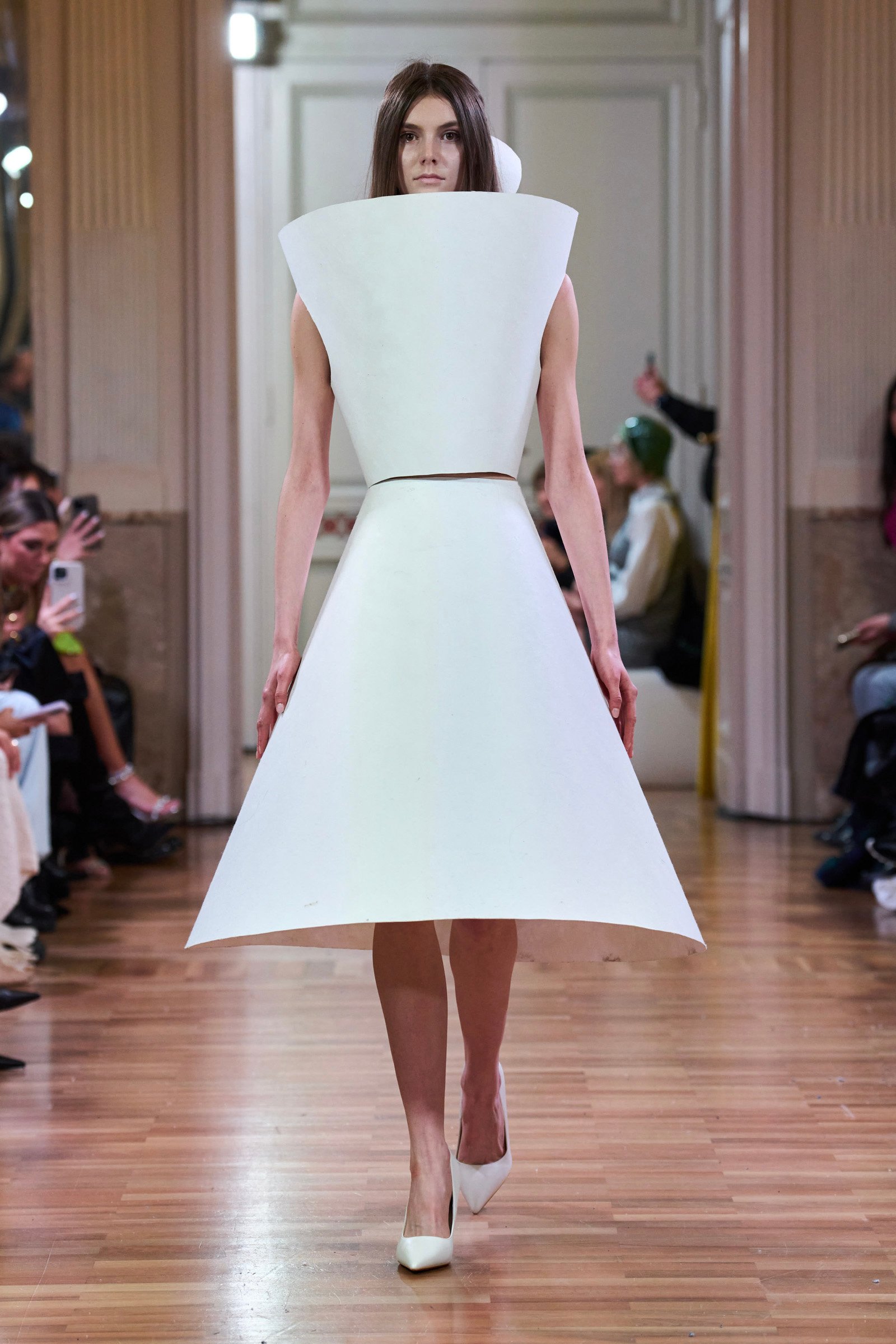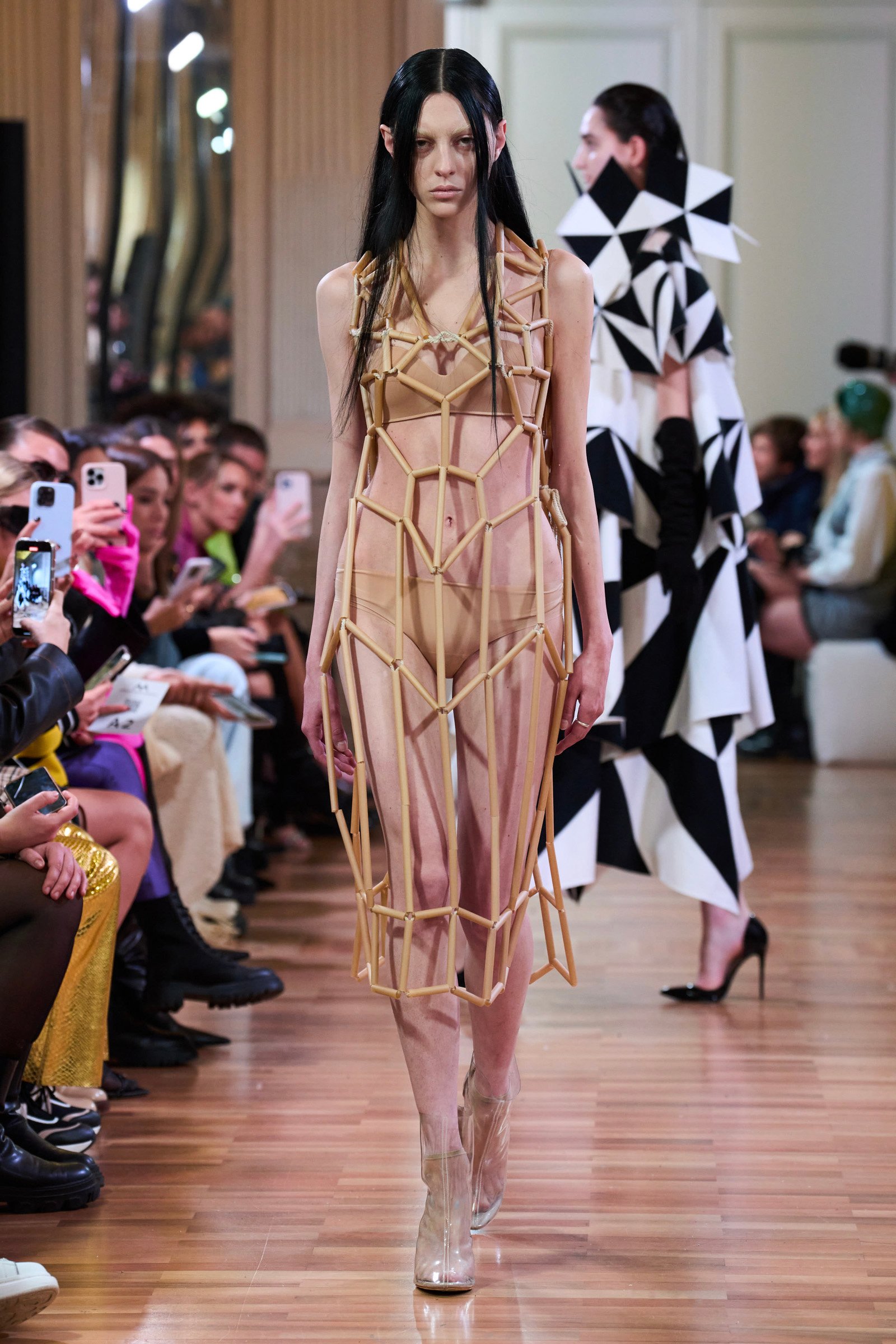 デザインは、アツシ ナカシマのアイデンティティでもある幾何学模様とシンメトリーを中心に構成。「PANECO®」で作られたボディスーツや、白濁したような風合いの「PlaX」を用いたティアードドレスやトレンチワンピ、NFCチップのマークをあしらったドレス、ビニールとガムテープで作られた黒のドレス、円錐のようなフォルムの紙で作ったアートピース、型紙を縫い合わせたような幾何学フォルムのドレスなど披露した。