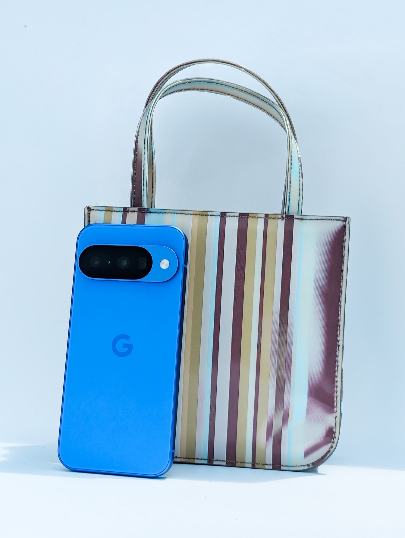 角度によって表情の変わる質感と、色彩豊かなミニバッグには、鮮やかなインディゴブルーのPixelが映える。| Shot on Google Pixel 10 Pro