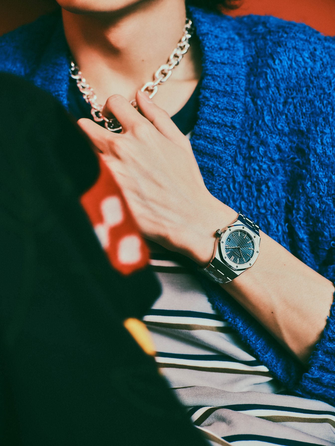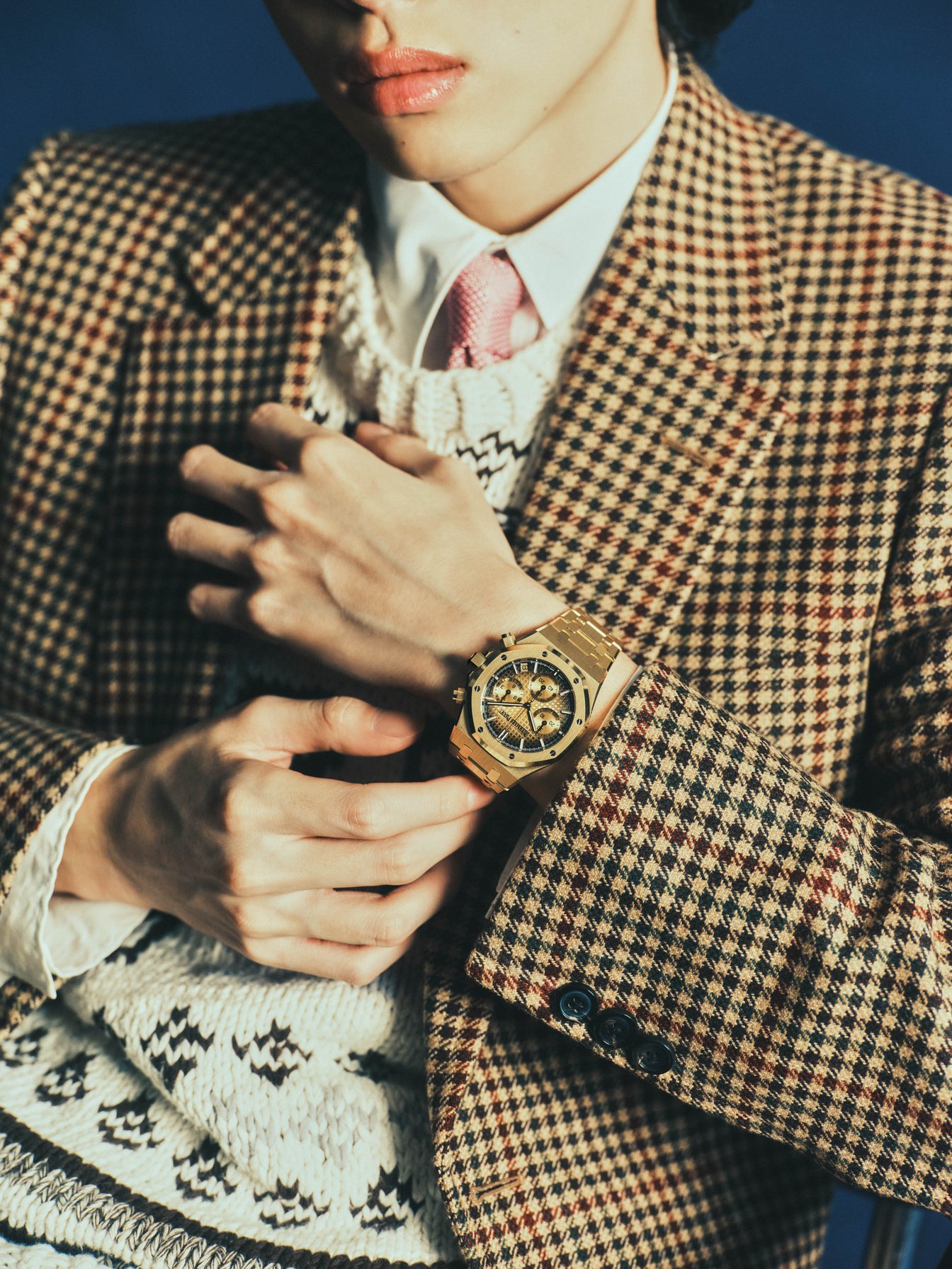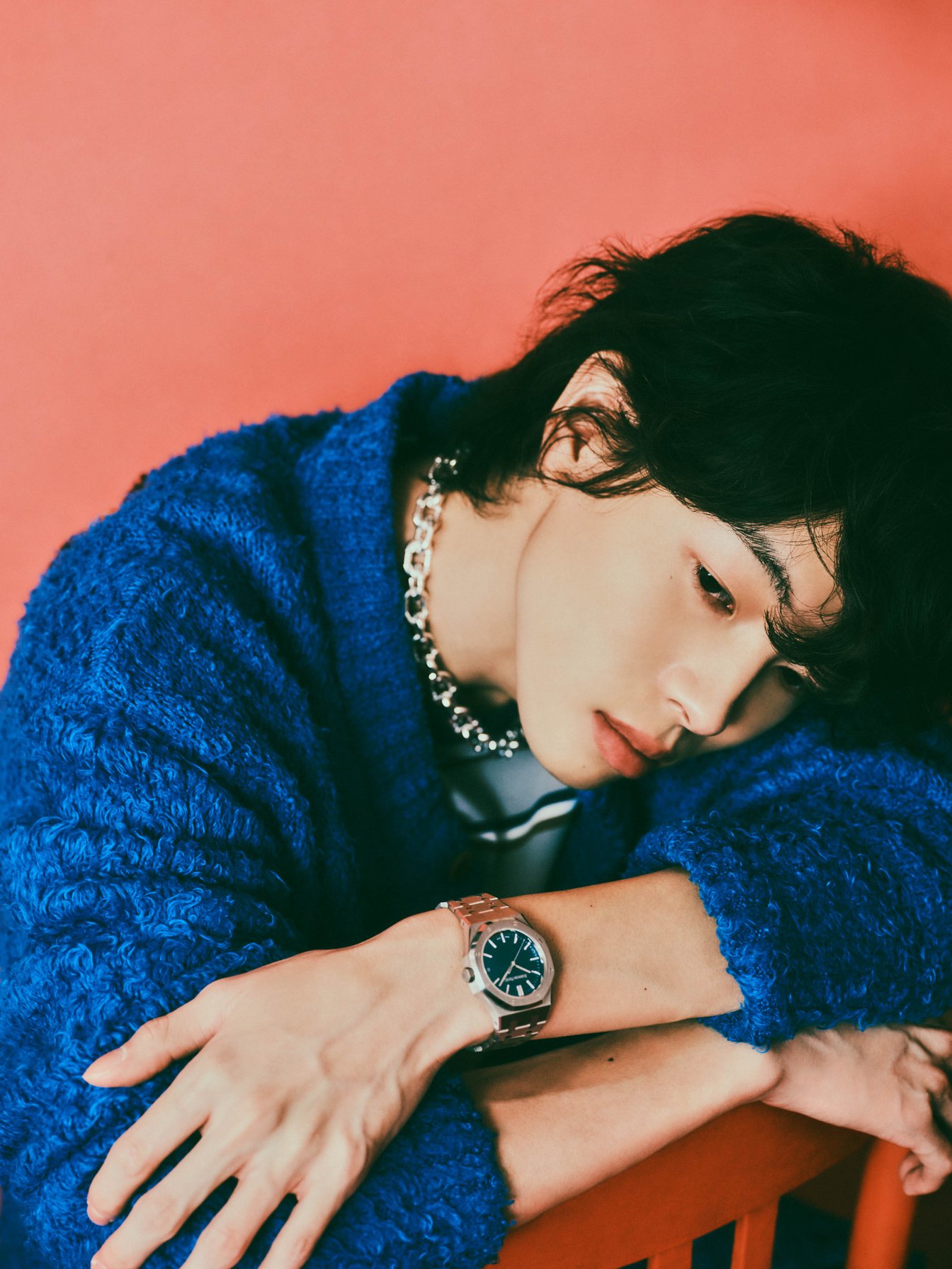 今回の撮影で最初に着用したのは、「ロイヤル オーク オートマティック」。1972年の初代モデルと同じ、ステンレススティール製のケースに「ナイトブルー、クラウド50」と名付けられた色味のタペストリーダイヤルを組み合わせたデザインだ。「一見シンプルに見えるけれど、ナイトブルーのタペストリー文字盤やサテン仕上げの光沢感が素敵です。スポーティな印象もあるのでいろいろな服装に合いそうですし、僕のような20代でも違和感なく着けられて、おしゃれなアクセントになってくれますね」。
