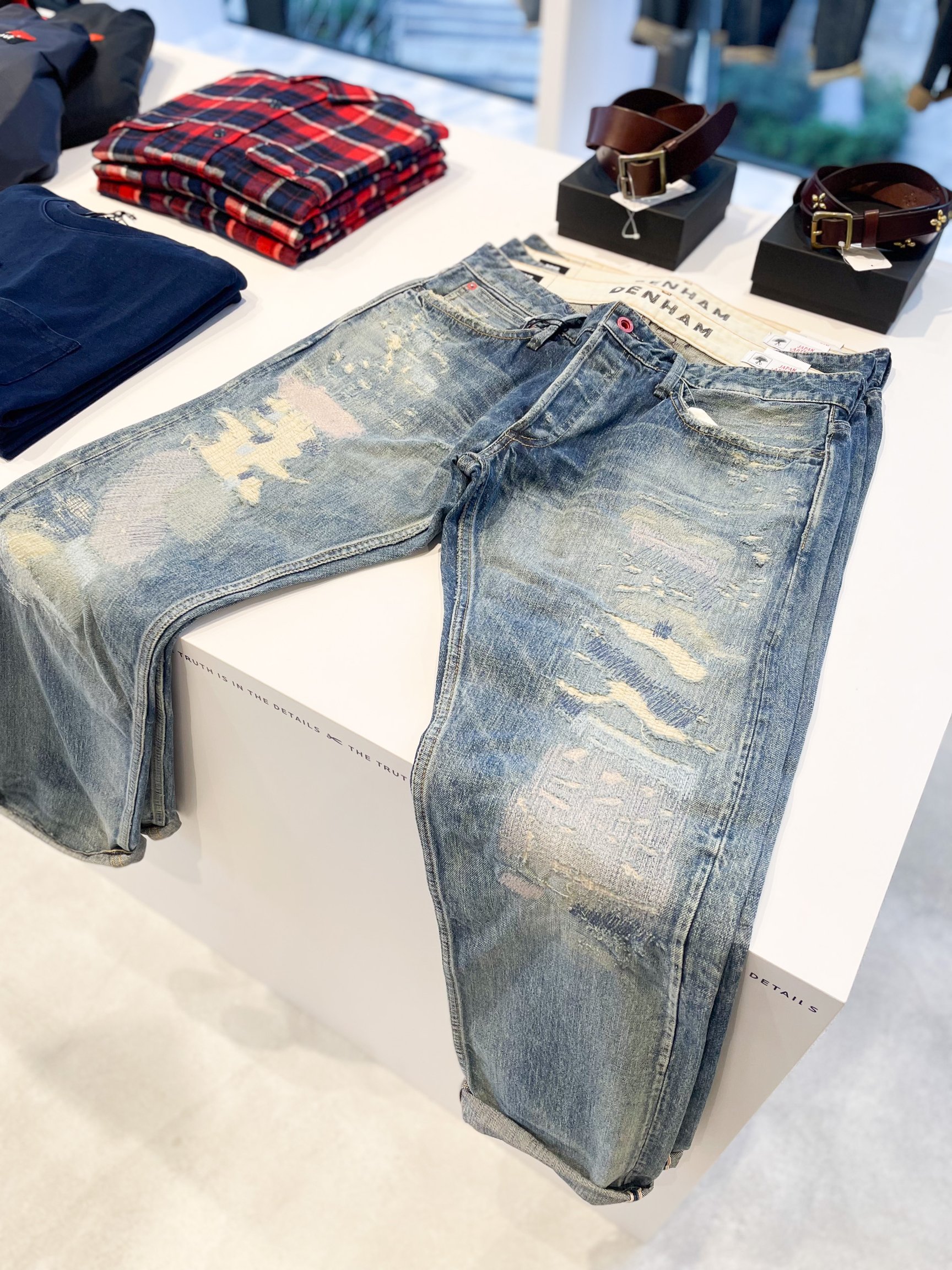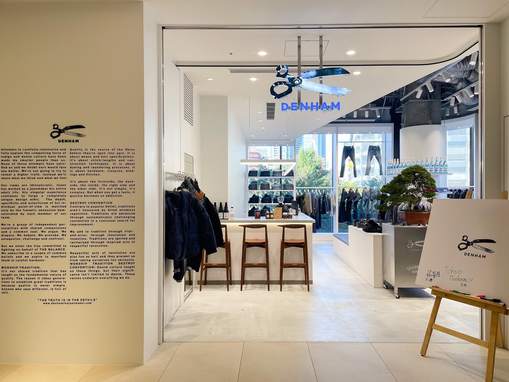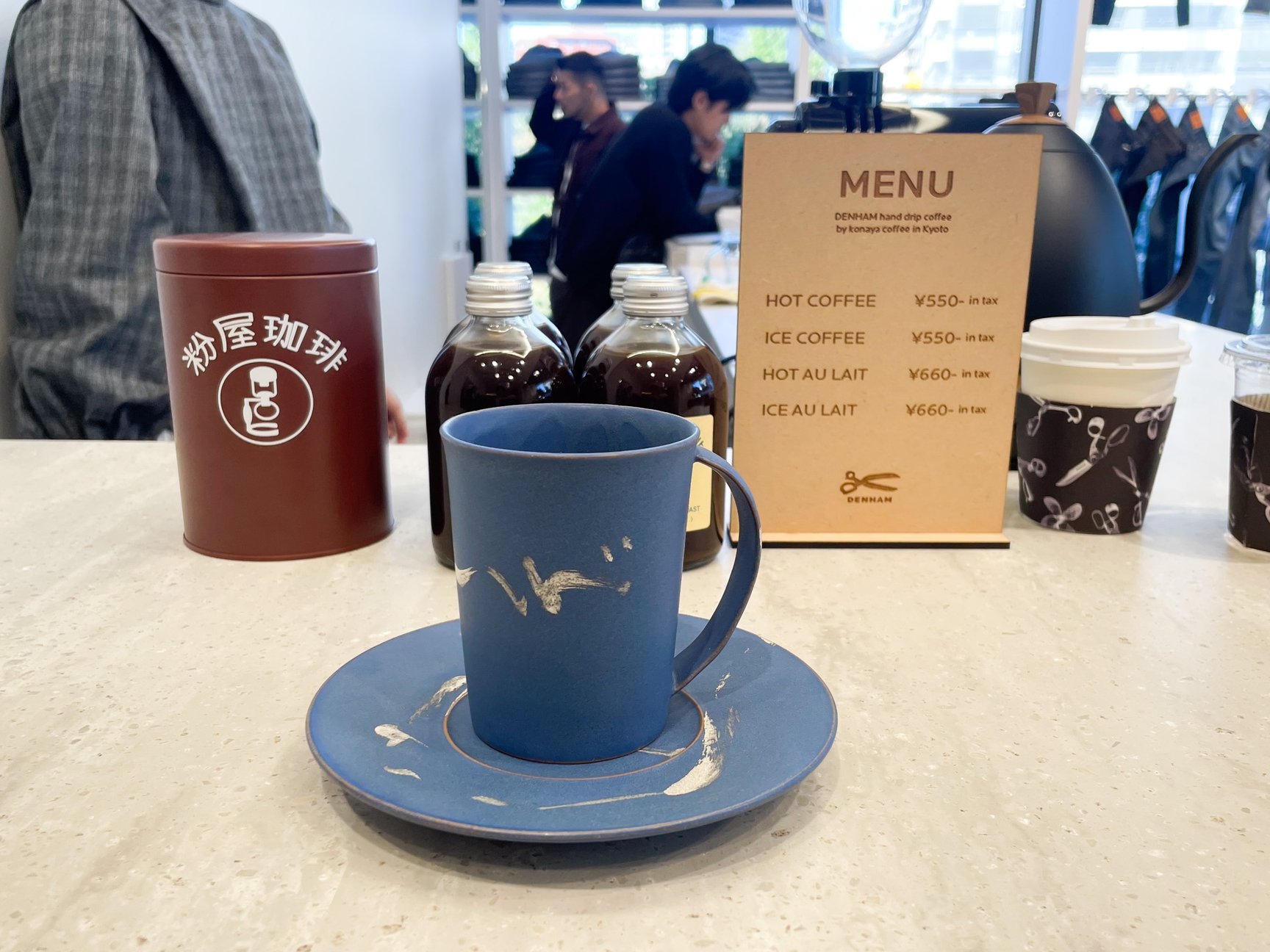 デニムブランド「デンハム(DENHAM)」では、メンズ・ウィメンズのフルカテゴリーを展開。オープン限定商品として、「テンシー(Ten c)」に別注したムートンジャケット(49万5000円)や、デンハム定番の豊⽥織機で織られた13.75ozの⾚⽿生地を使⽤した日本製デニム(14万3000円)を用意します。また店内に併設したカフェコーナーでは、「京都 清水焼」のカップで「粉屋珈琲」のオリジナルブレンドによるコーヒーの提供も。数量限定でカップアンドソーサーも販売します。