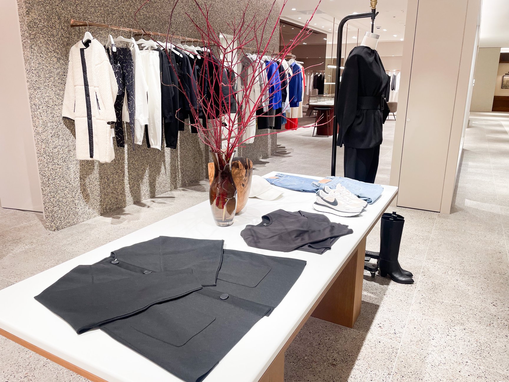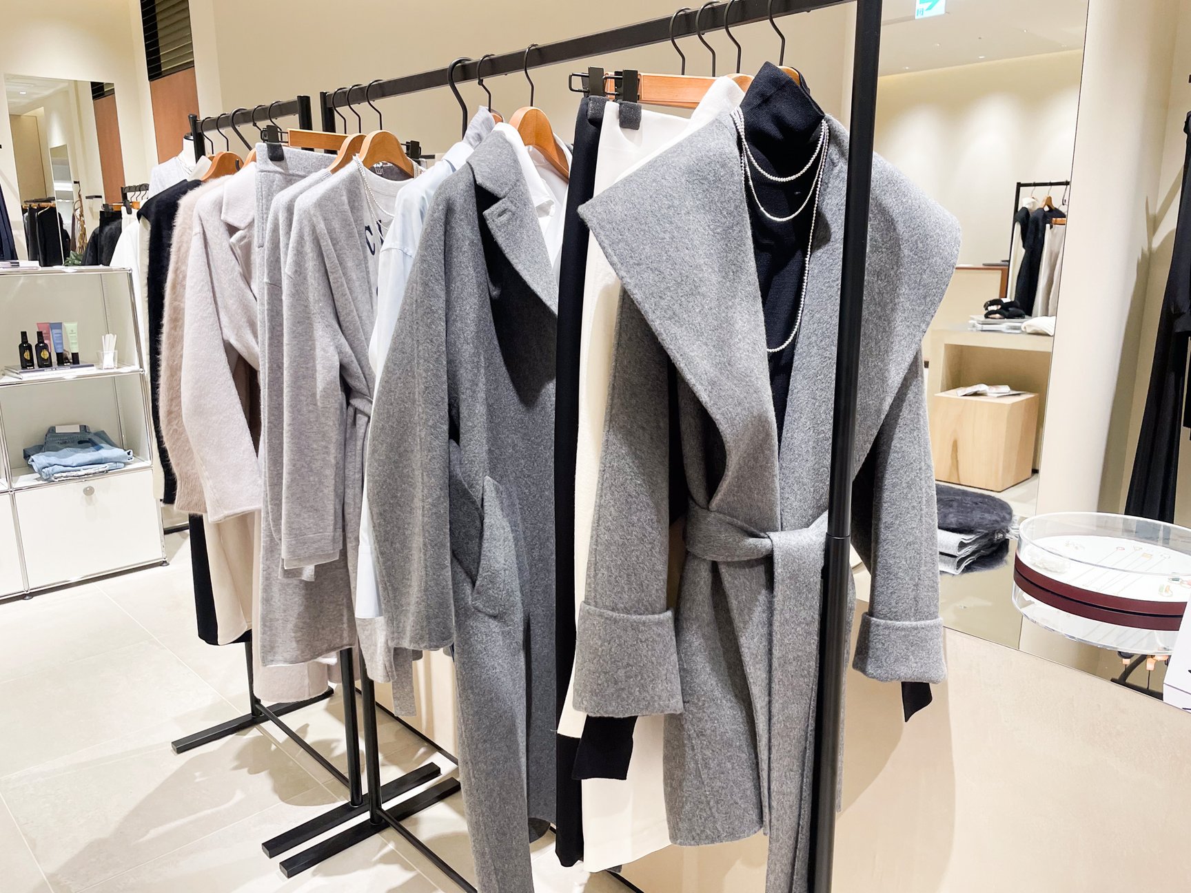 「セオリー(Theory)」の旗艦店となる麻布台ヒルズ店は、自然光が優しく差し込む空間で、定番アイテムからエクスクルーシブアイテムまで展開。今年のホリデーキャンペーンでは、グラミー賞を2度受賞したジャズボーカリストのサマラ・ジョイを起用し、店内BGMやディスプレイとともにホリデームードが楽しめます。オープン記念アイテムとして、Tネックドレス(4万2900円)やカシミヤのジップアップフーディー(6万3800円)、スウェット(6万9300円)などを販売。