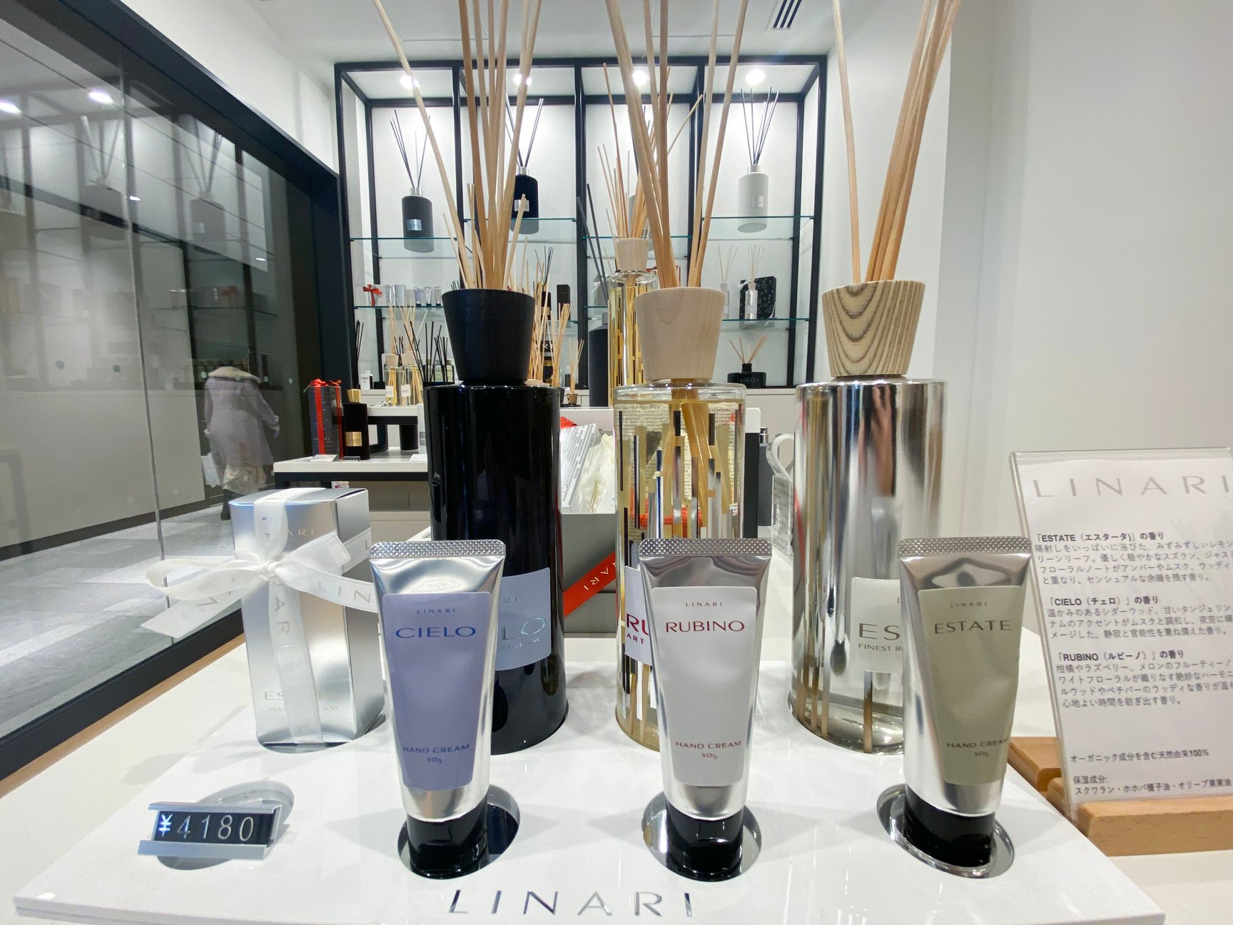 ラグジュアリールームフレグランスブランドとして人気のドイツ発「リナーリ(LINARI)」と、ベルギー発「バオバブコレクション(Baobab COLLECTION)」を取り扱うフレグランス専門ショップ。白を基調としたモダンな店内には大小さまざまなルームフレグランスをメインに並べ、両ブランドの香りと共にライフスタイルを提案します。リナーリは人気の香り3種からブランド初のハンドクリーム「リナーリ ハンドクリーム」(全3種、各50g 各同4180円)を揃えるほか、バオバブコレクションからは24個のキャンドルを収めたアドベントカレンダー「バオバブコレクション『ル・ボヤージュ・エクストラオルディネール』アドベントカレンダー」(12種×2、同13万2000円)が登場します。