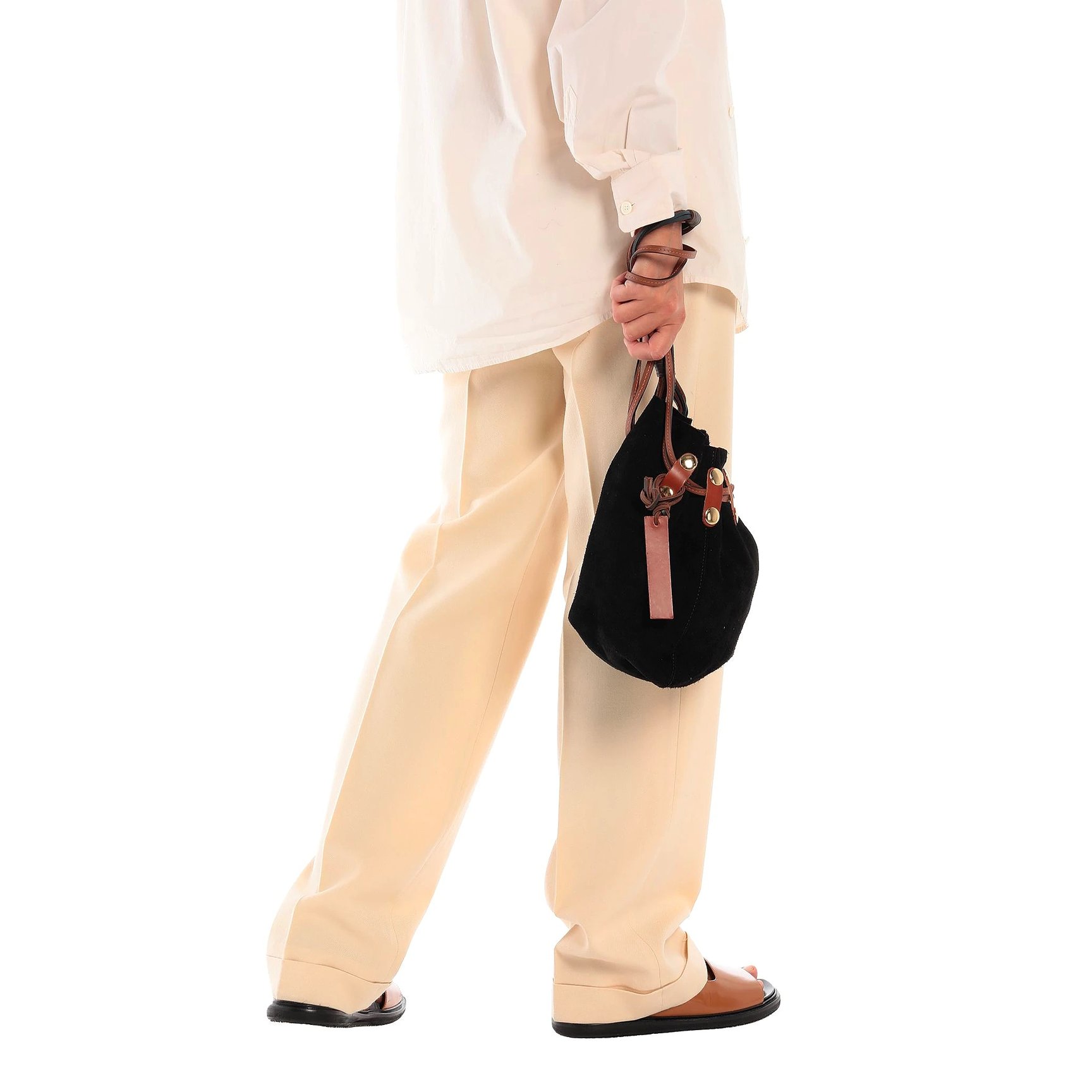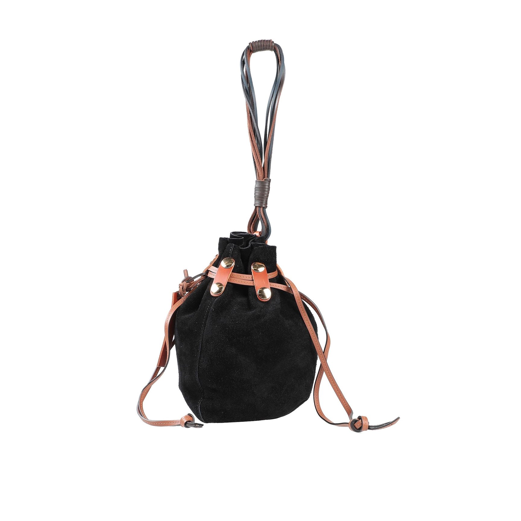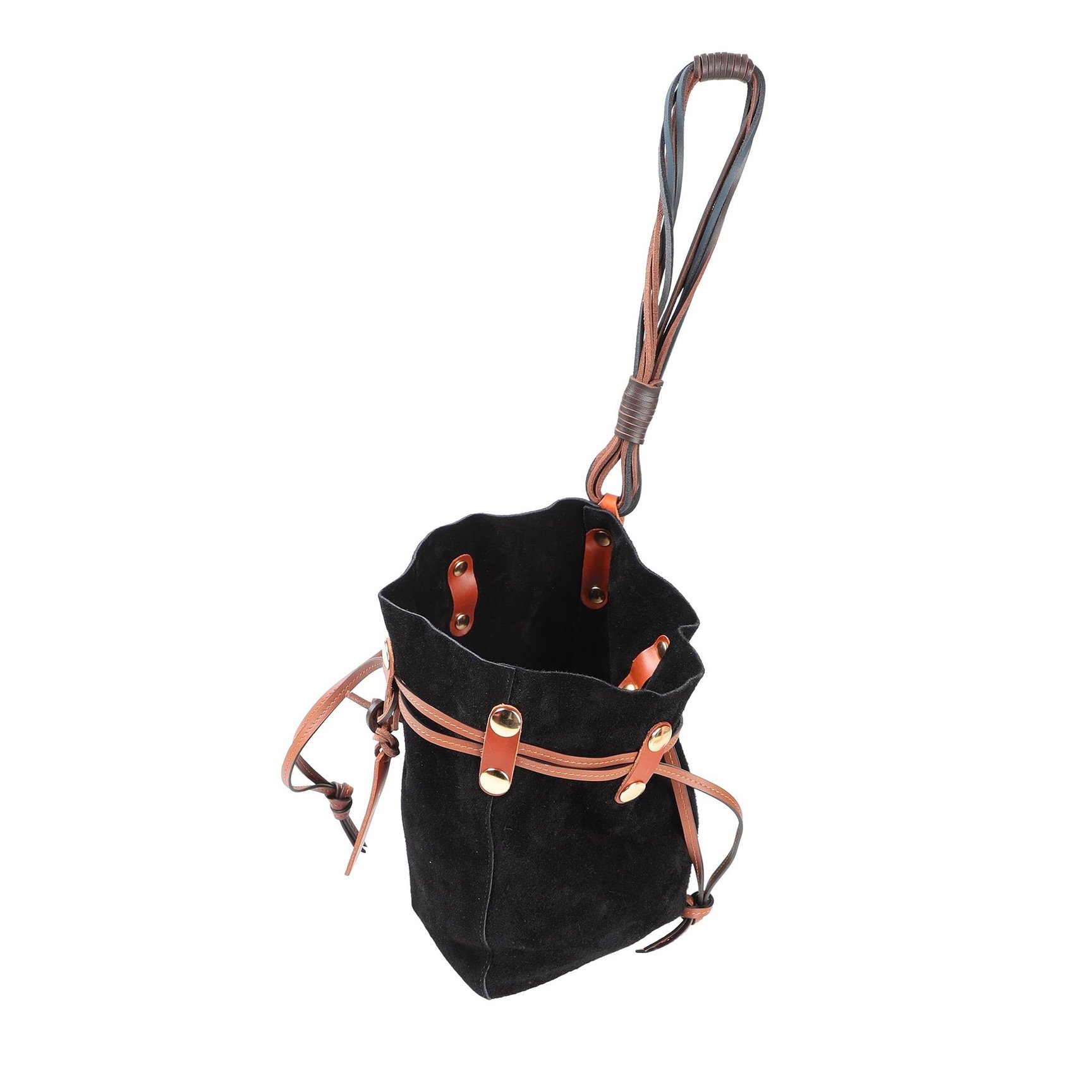 巾着タイプのユニークな「マルニ(MARNI)」のバッグ。スエードとレザー、真鍮のディテールがヴィンテージのような風合いで無造作に持つことでこなれ感が出るデザインです。